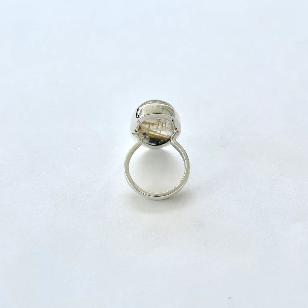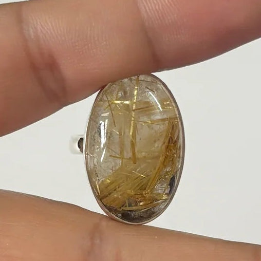 Poartă acest inel cu cuarț rutilat natural pentru a aduce lumină, claritate și energie solară în viața ta – o bijuterie unicat, creată de natură și desăvârșită în argint.