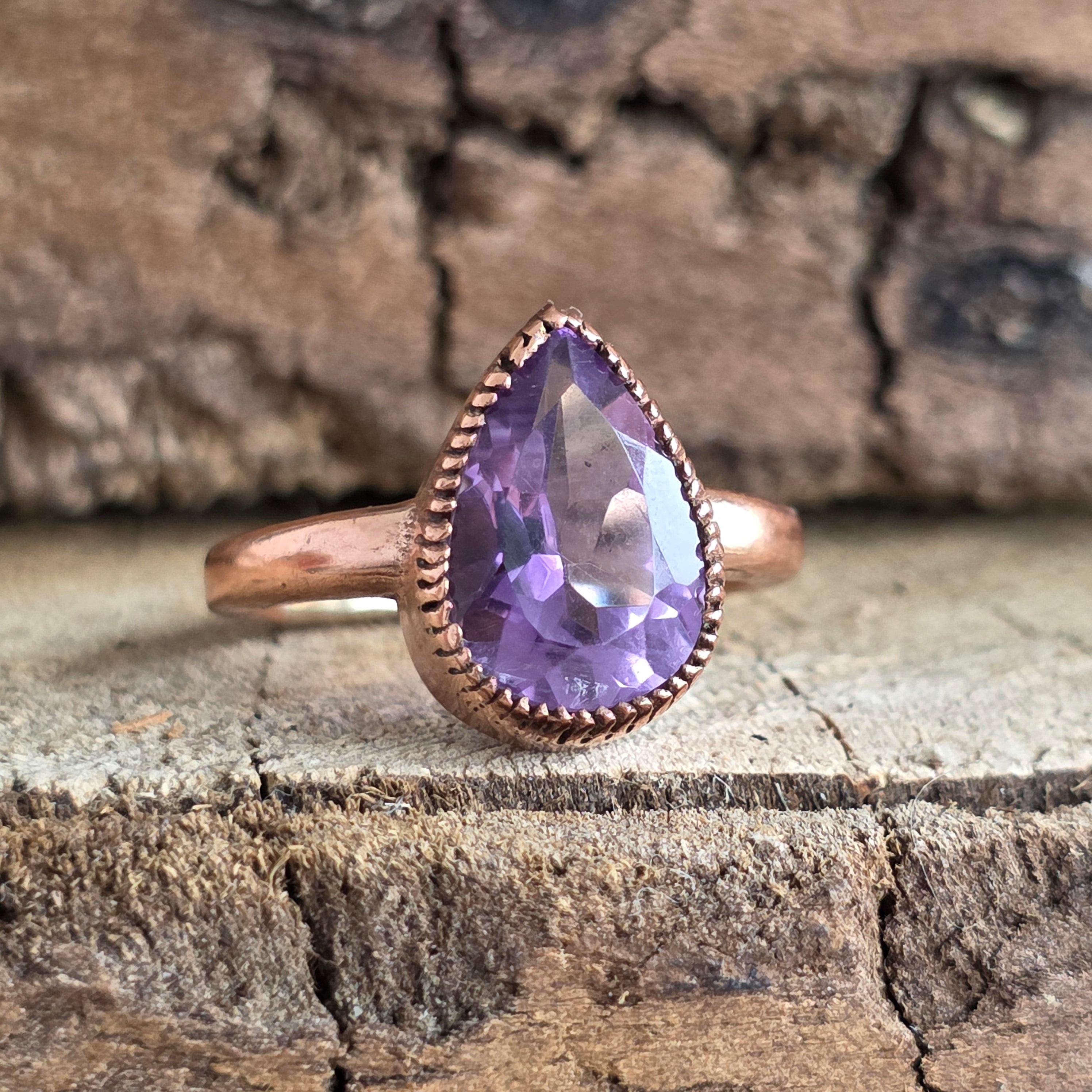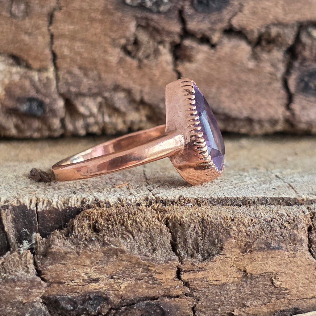 Un inel rafinat, lucrat manual din cupru masiv și înnobilat cu o piatră naturală de ametist fațetată.