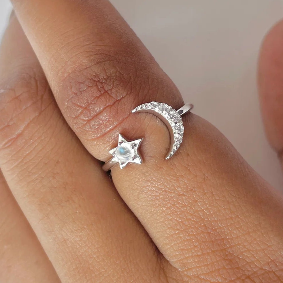 Acest inel din argint 925 îmbină armonios simbolurile celeste: o stea delicată cu piatra lunii naturală și o semilună strălucitoare împodobită cu zirconii. Este un design modern și feminin, perfect pentru a adăuga un plus de rafinament fiecărei ținute.