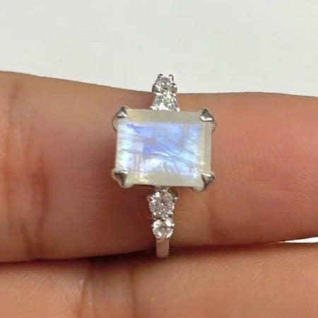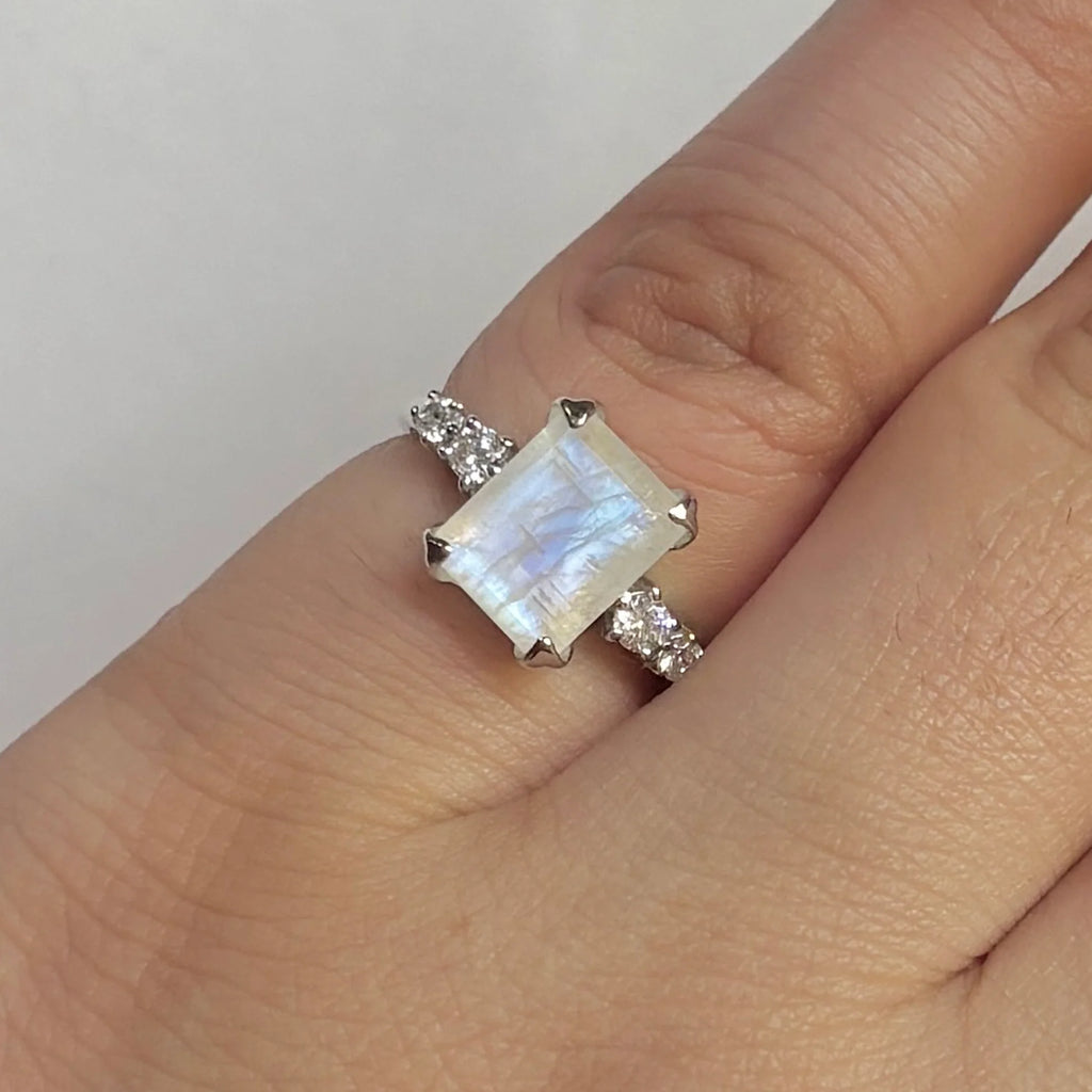 Acest inel din argint 925 cu piatra lunii naturală tăiată în formă square îmbină eleganța modernă cu misterul cristalelor. Irizațiile albastre unice ale pietrei lunii sunt amplificate de strălucirea delicată a zirconilor laterali, oferind o bijuterie spectaculoasă și rafinată.