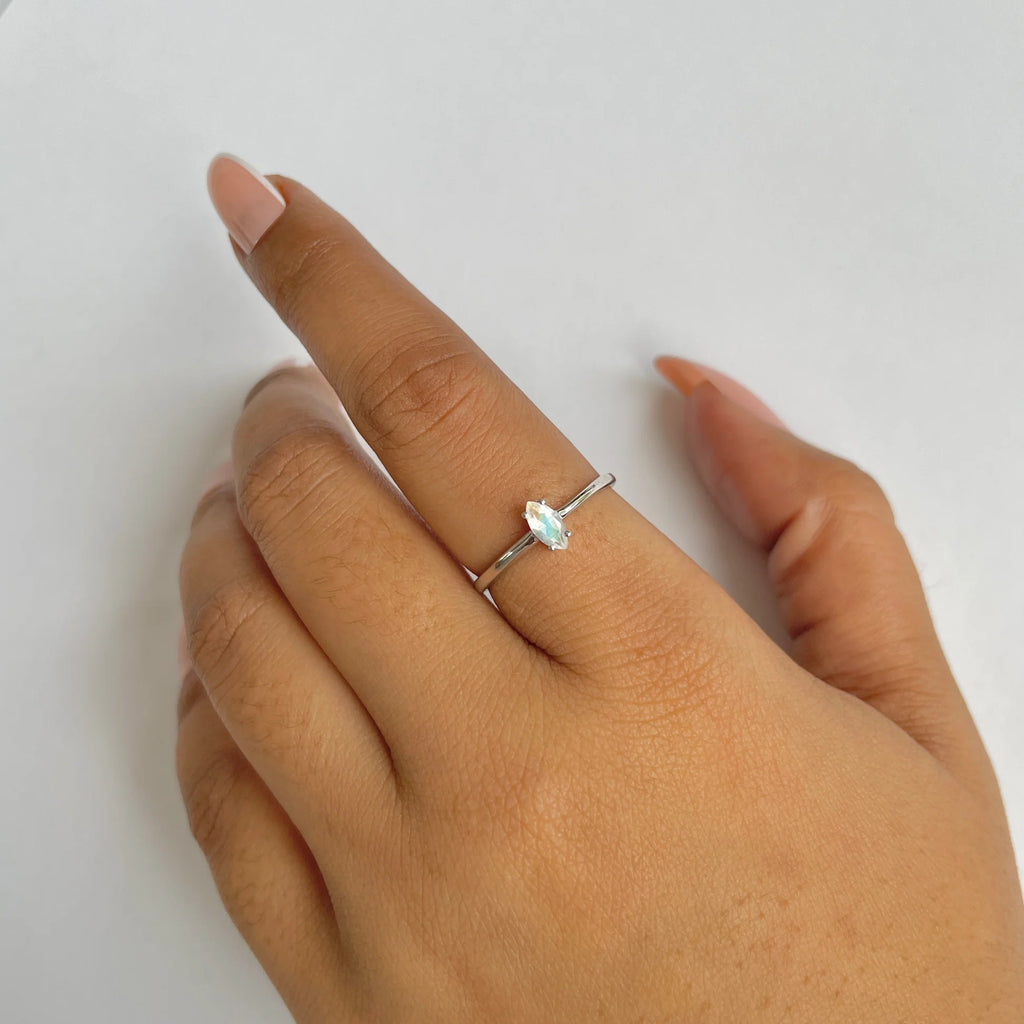 Acest inel din argint 925 cu piatra lunii este o bijuterie delicată și rafinată, ideală pentru iubitorii de design minimalist. Piatra naturală, tăiată în formă marquise, dezvăluie un joc fascinant de irizații albastre și argintii, ce par să danseze la fiecare mișcare a mâinii.