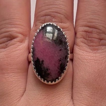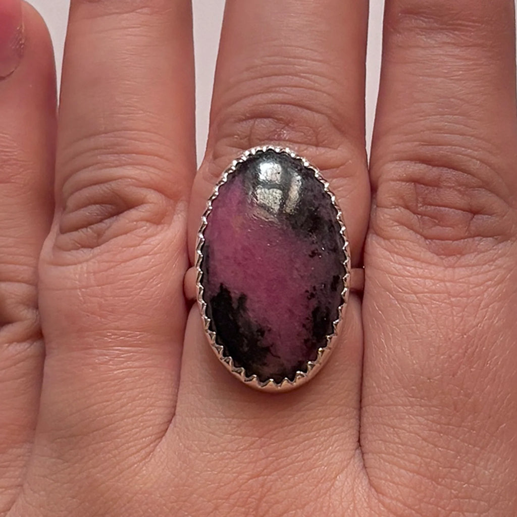 Acest inel din argint 925 cu rodonit este o bijuterie rafinată și expresivă, în care rozul vibrant al pietrei se împletește cu tonurile negre naturale, creând un desen mineral spectaculos. Fiecare inel este unic, datorită variațiilor de culoare și textură ale pietrei, ceea ce îi oferă un caracter irepetabil.