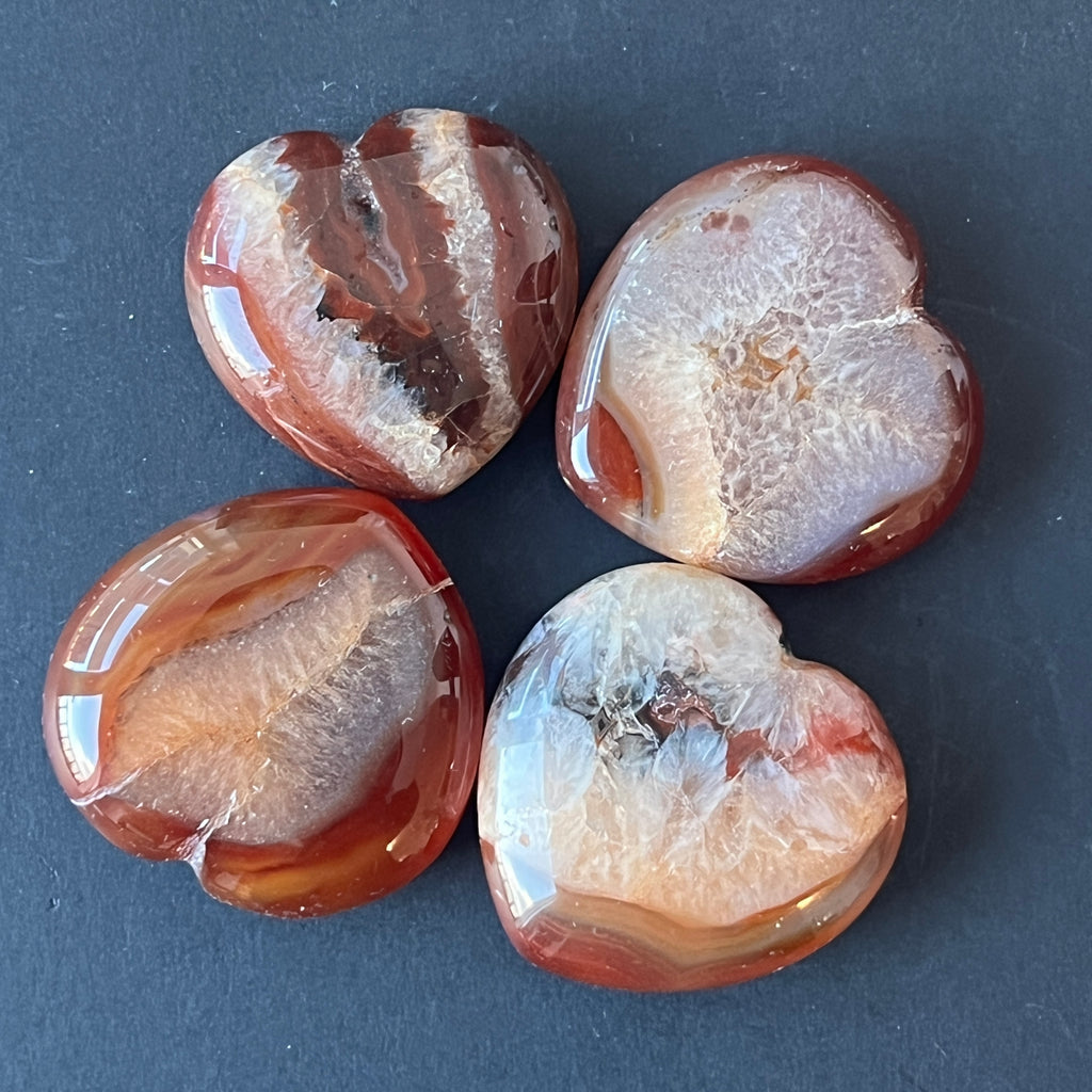 Inima din Agat roșu este o celebrare a vitalității și a bucuriei de a trăi. Tonurile sale bogate de roșu, combinate cu vene fine și dungi naturale, par a spune povești vechi despre focul interior al Pământului. Fiecare inimă este o mică operă de artă minerală, cu forme și modele irepetabile, născute din dansul culorilor și al timpului.