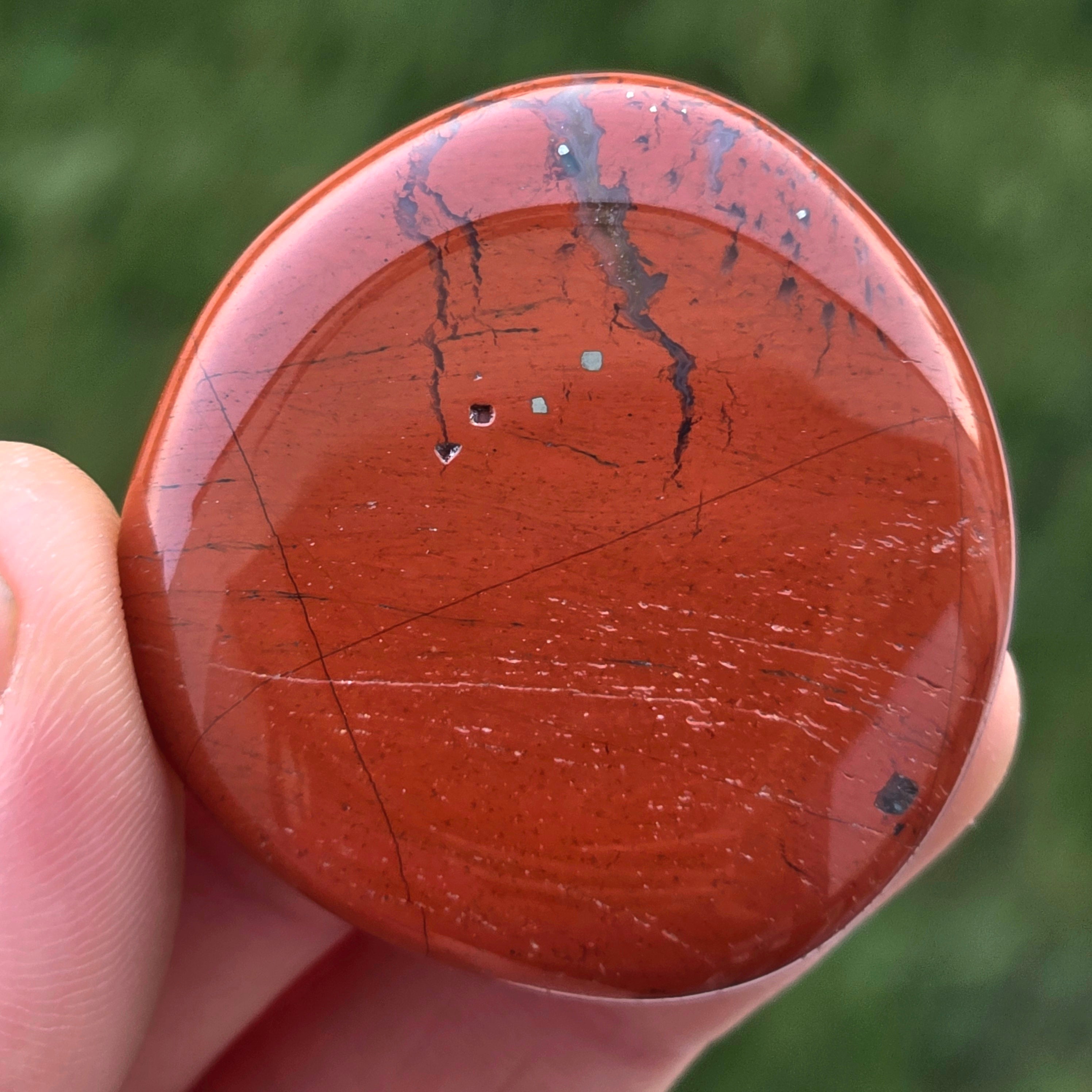 Roter Jaspis wird auch Mut- und Kraftstein genannt. Dieser Stein erhöht das Energieniveau, stimuliert die Durchblutung und die Lebenslust.