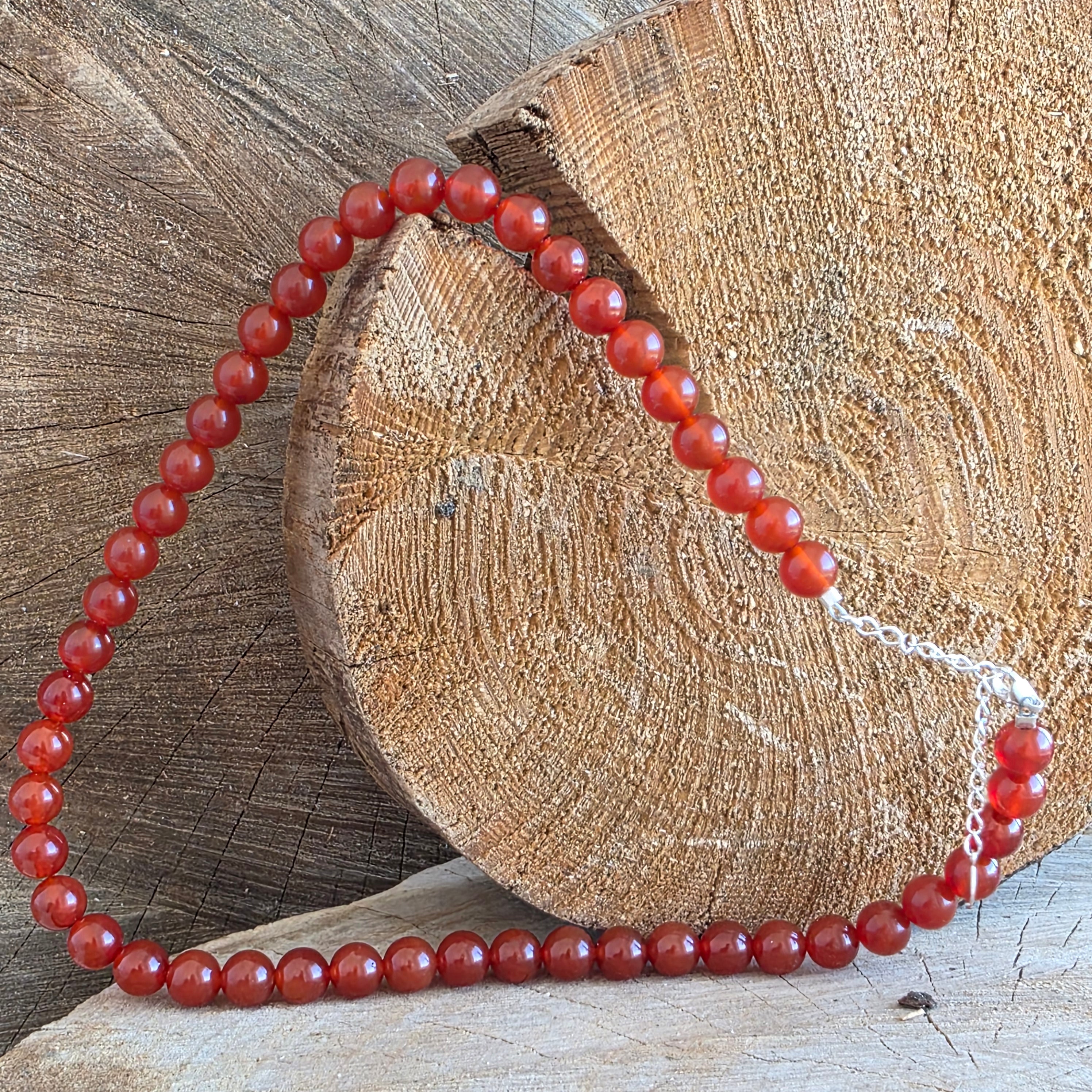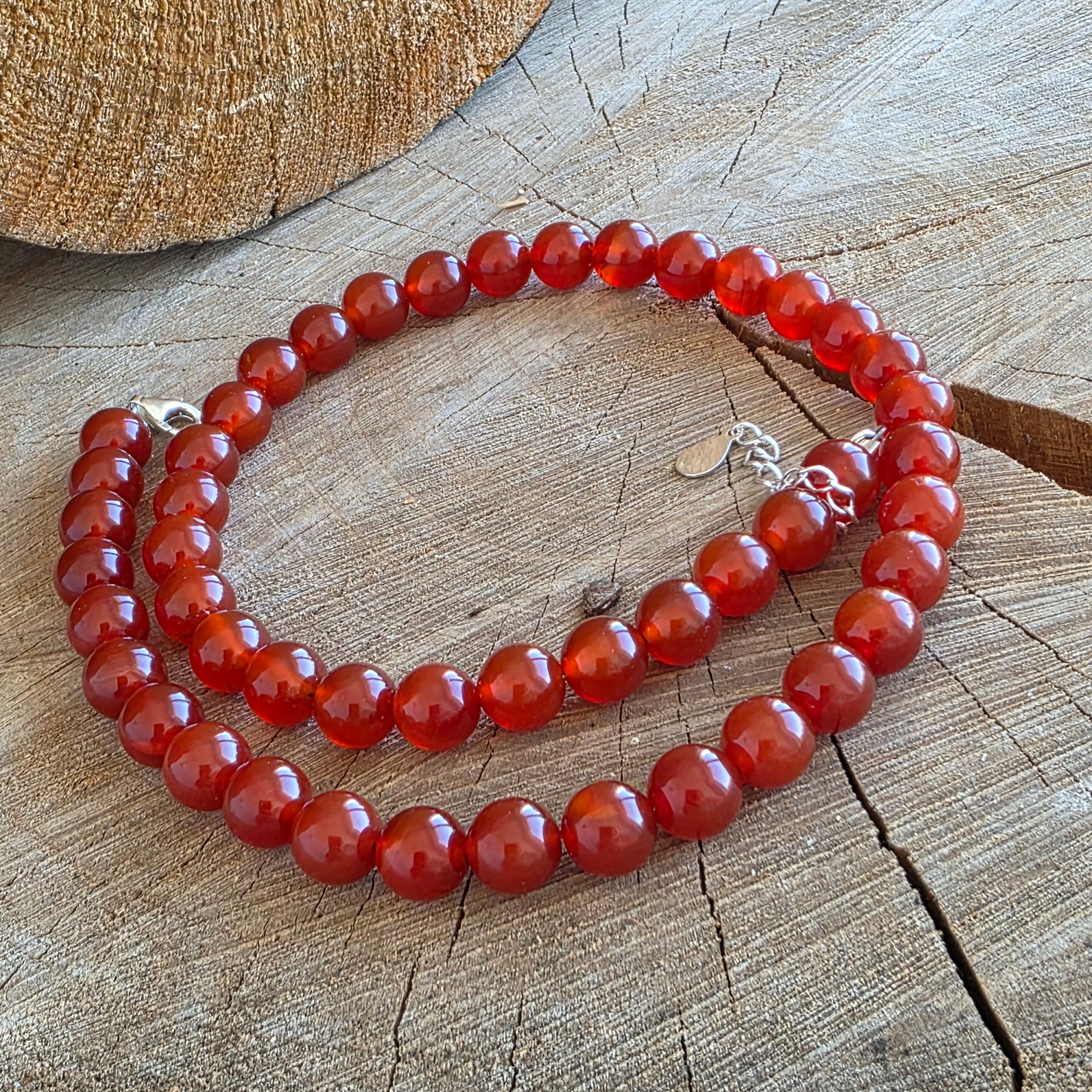 Eine Halskette mit warmer und lebendiger Ausstrahlung, gefertigt aus 6 mm Karneolkugeln, die harmonisch um den Hals liegen und eine runde, ausgewogene Linie bilden. Die reichen Orange- und Rotnuancen, manchmal mit durchscheinenden Variationen, heben den lebendigen Charakter des Steins hervor, während die kugelförmige Gestaltung das Gefühl von Kontinuität und visueller Flüssigkeit verstärkt. Das Design ist klar und zeitlos, wobei die natürliche Farbe und Textur des Karneols im Vordergrund steht.