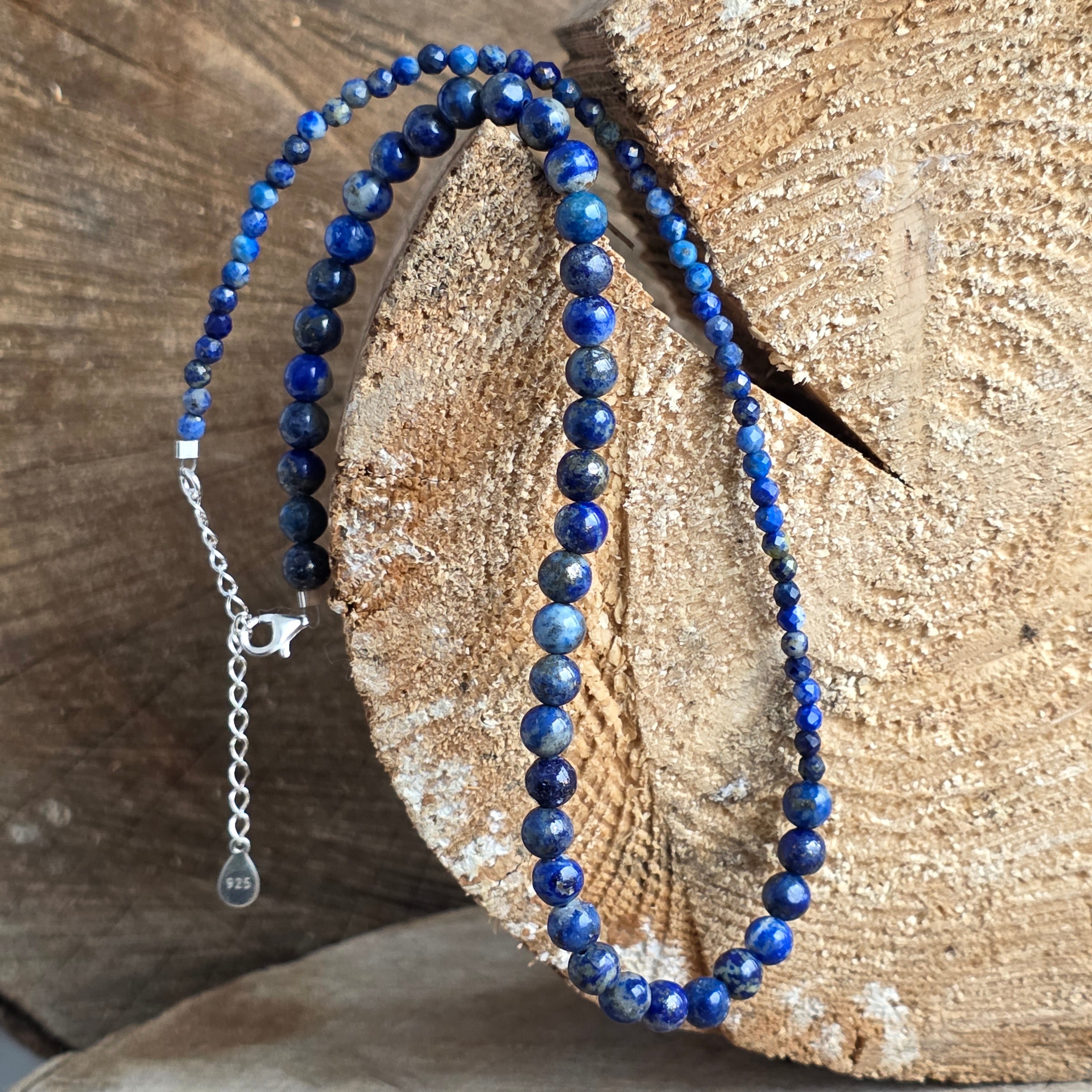 Die 6 mm großen kugelförmigen Perlen, die mit 3 mm großen facettierten Kugeln verflochten sind, verleihen dem Schmuckstück Finesse und Rhythmus und schaffen eine subtile Harmonie zwischen Stärke und Raffinesse. Lapis wird seit der Antike als Symbol getragen Wahrheit, spirituelle Vision und innere Stärke, da er als ein Portal zur Selbsterkenntnis und als Schutz vor disharmonischen Energien gilt.