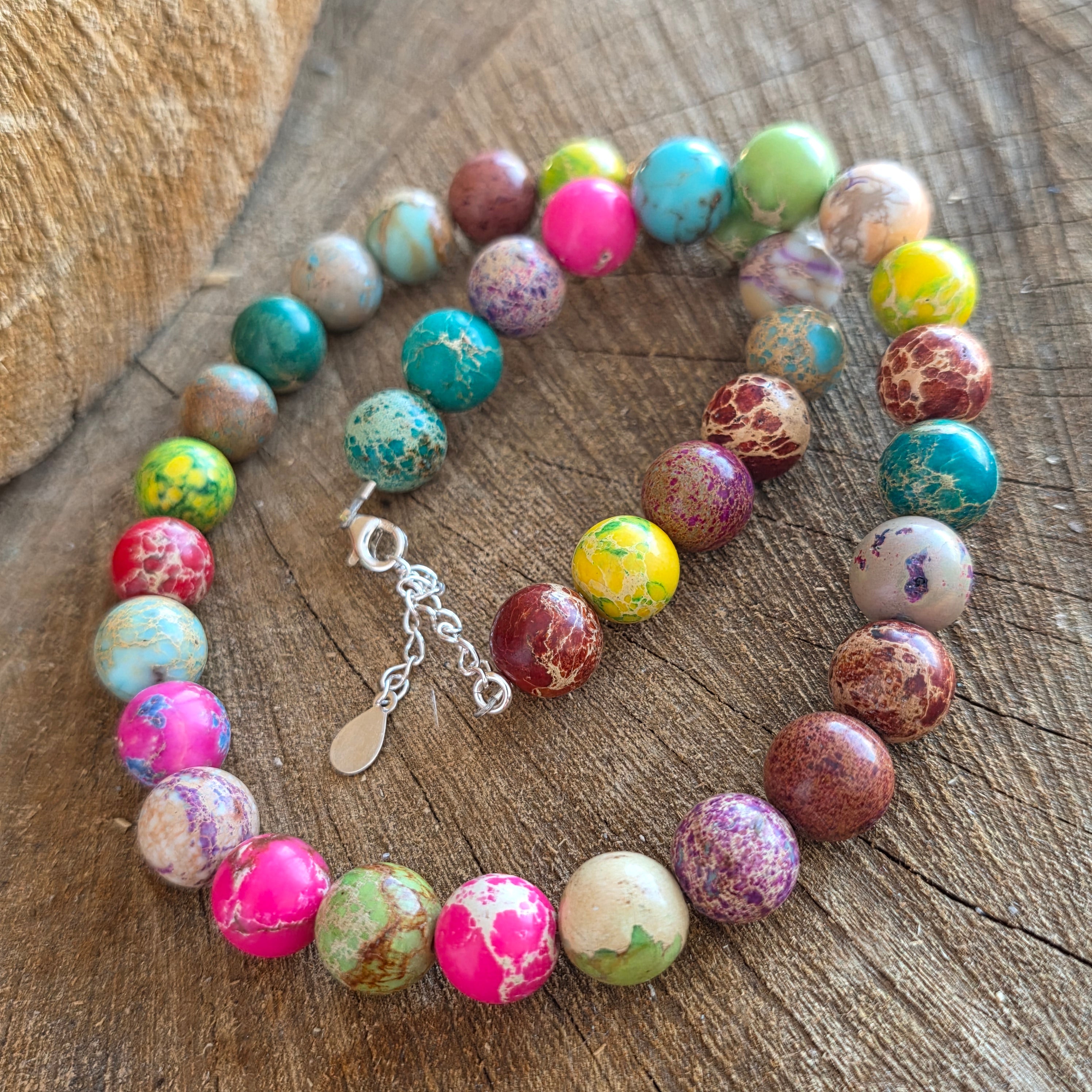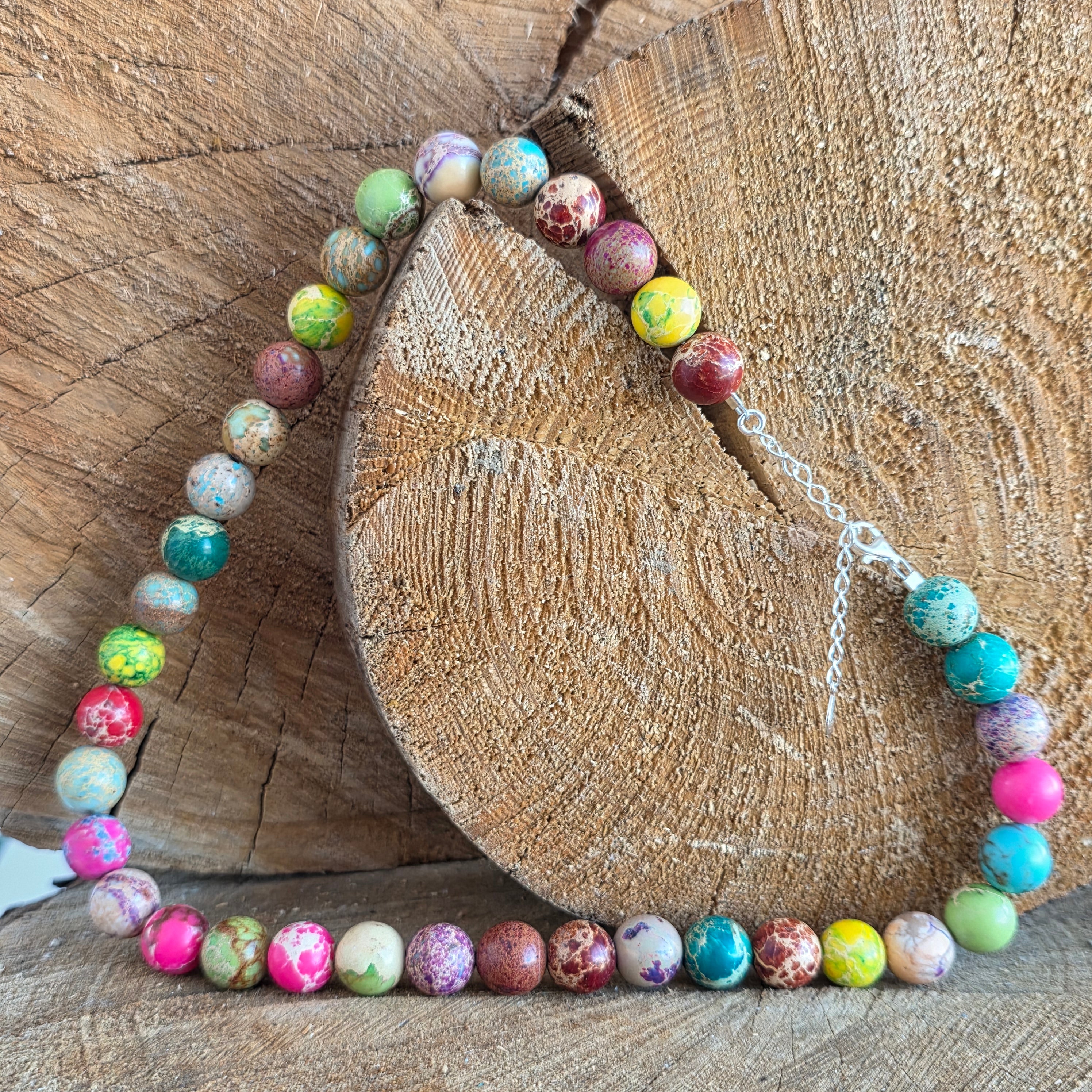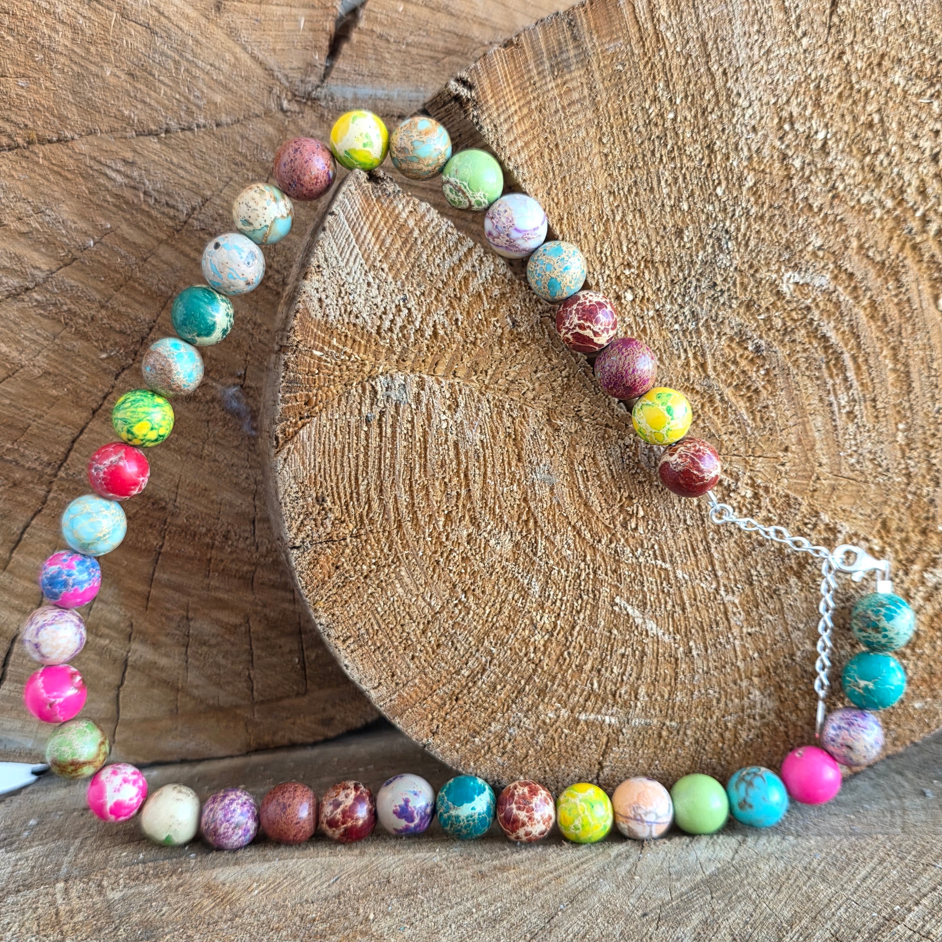 Diese Halskette aus Regalit vereint verschiedene harmonische Farbtöne, angeordnet in Form von geschliffenen Kugeln, jede mit ihrer eigenen Farbpersönlichkeit. Der Regalit, mit seinem marmorierten Aussehen und dem natürlichen Farbenspiel – von Türkis und Grün bis hin zu warmen Brauntönen, Creme oder Rötlich – schafft ein ausdrucksvolles Schmuckstück mit einer künstlerischen und leicht königlichen Ausstrahlung, wie es auch der Name suggeriert.