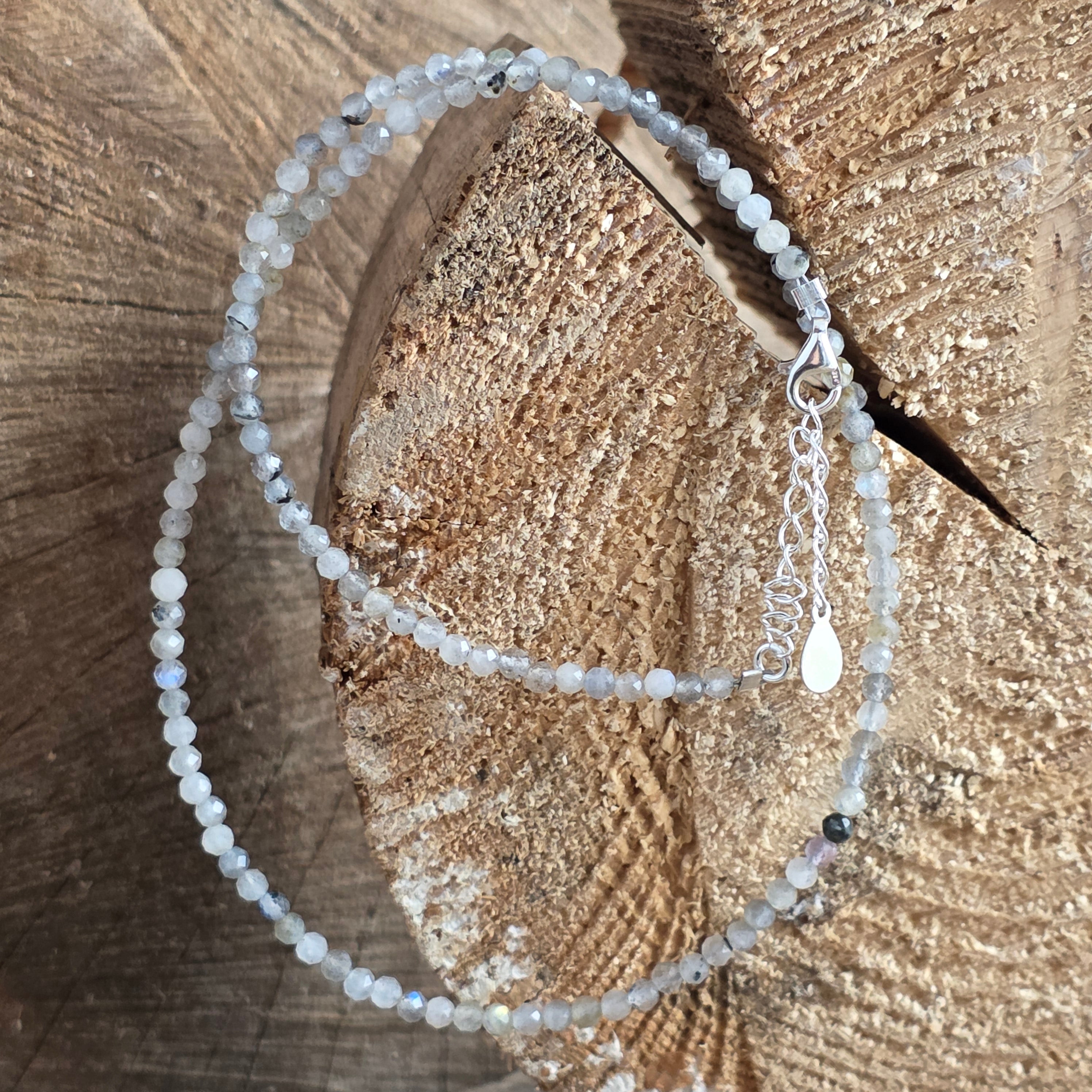 Ein Schmuckstück, das Feinheit und Geheimnis vereint – Die Labradorit-Halskette AURA #131 ist eine Explosion subtilen Lichts und dezenter Eleganz. Die nur 3 mm großen facettierten Perlen reflektieren das Licht aus vielen Winkeln und erzeugen ein hypnotisches Spiel aus blauen, goldenen und grünen Reflexen, ähnlich wie ein Nordlicht, das in Stein eingefangen ist.