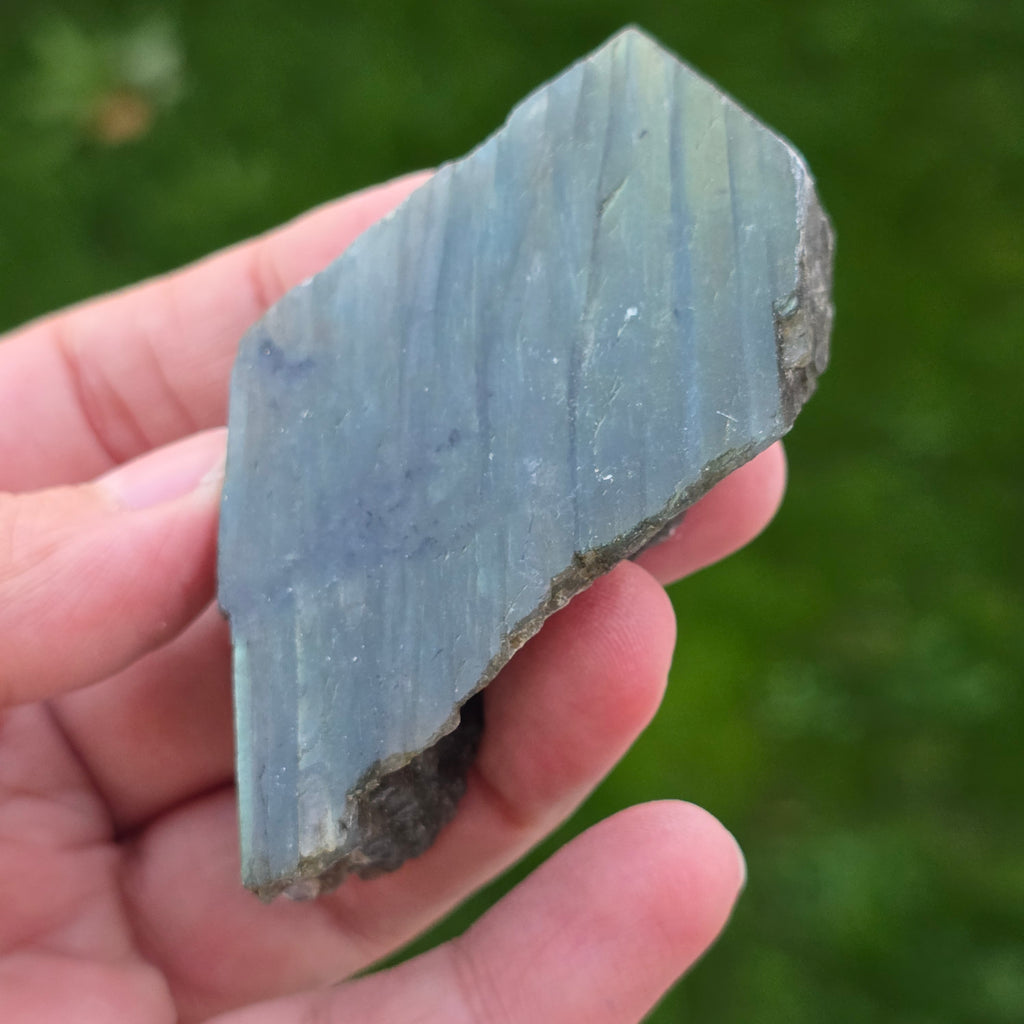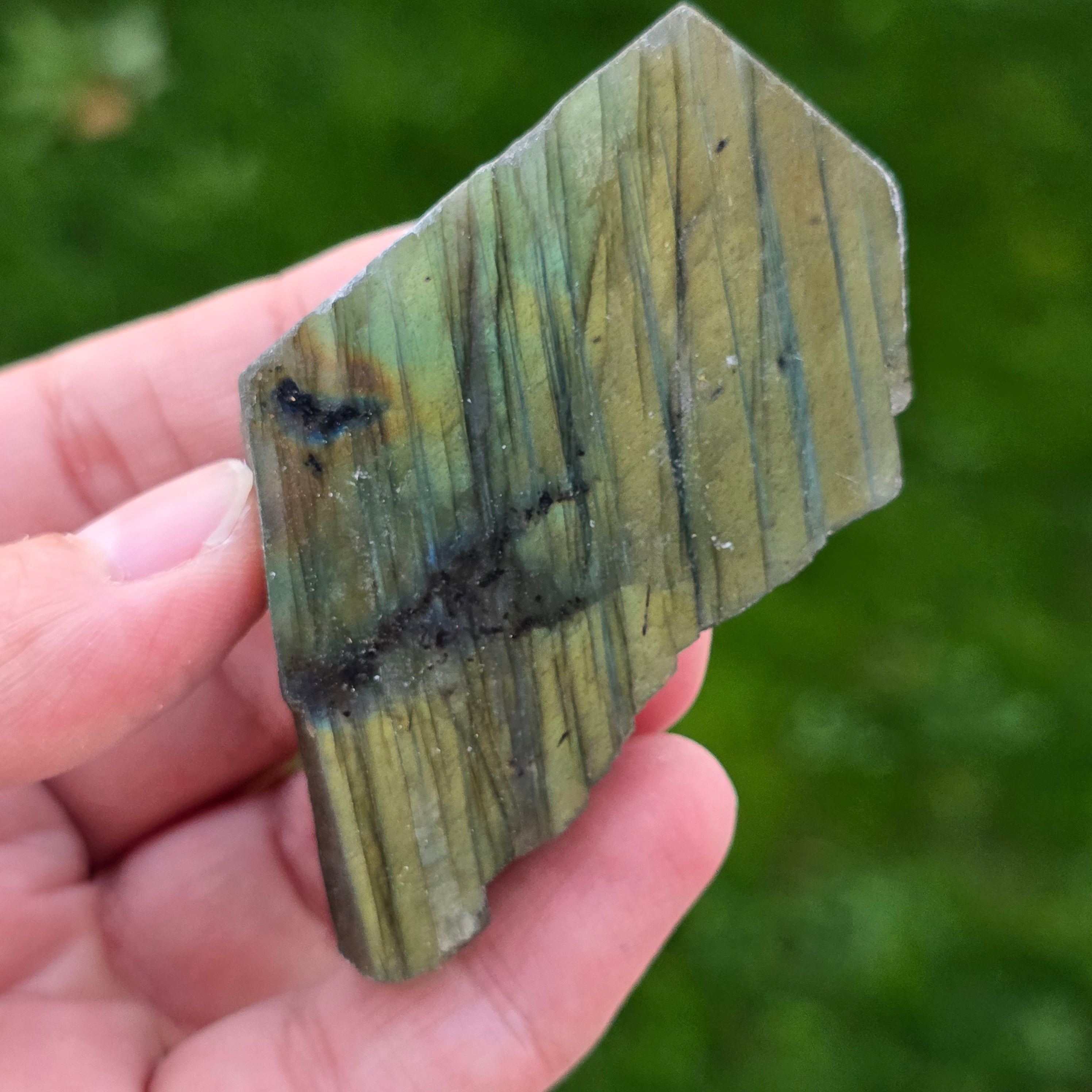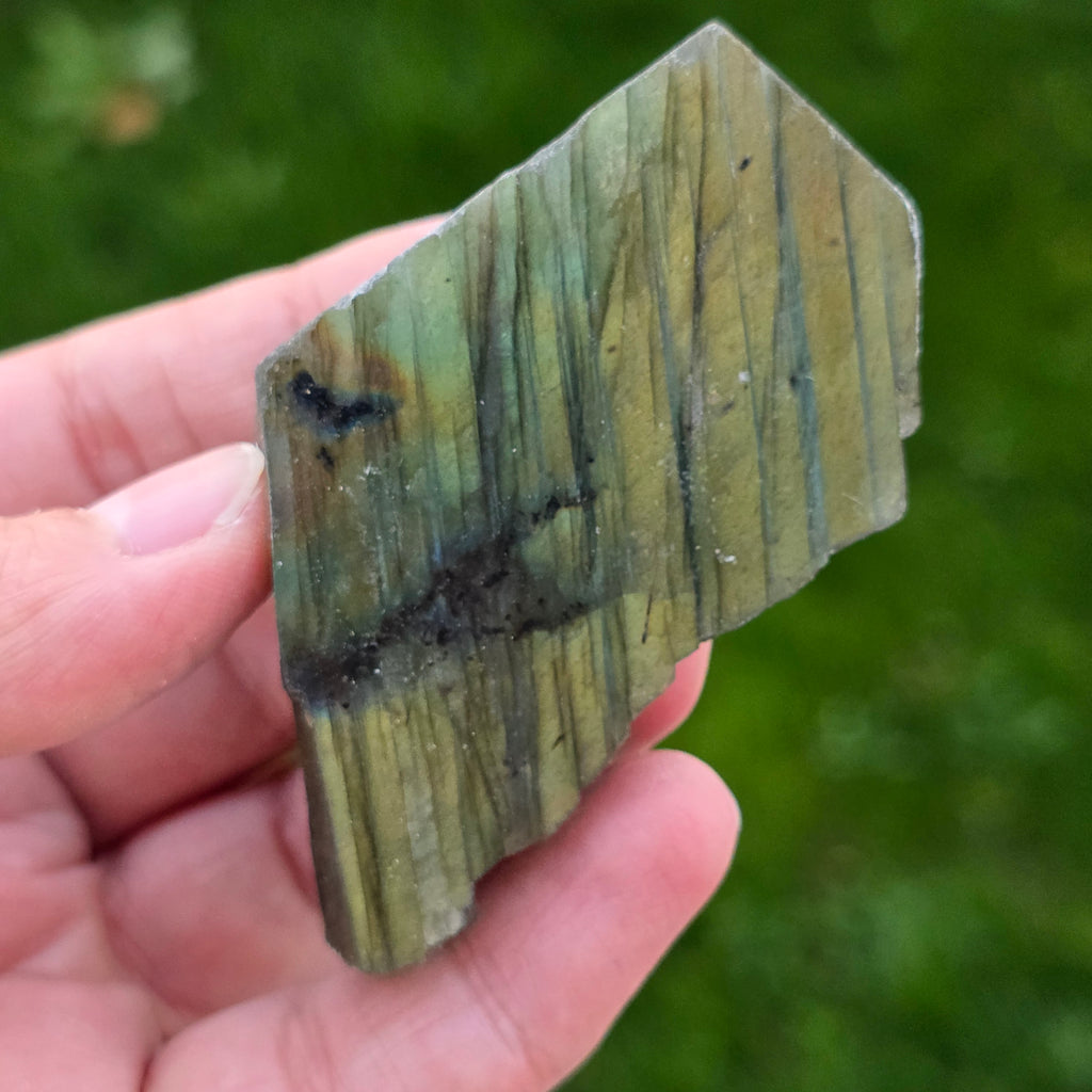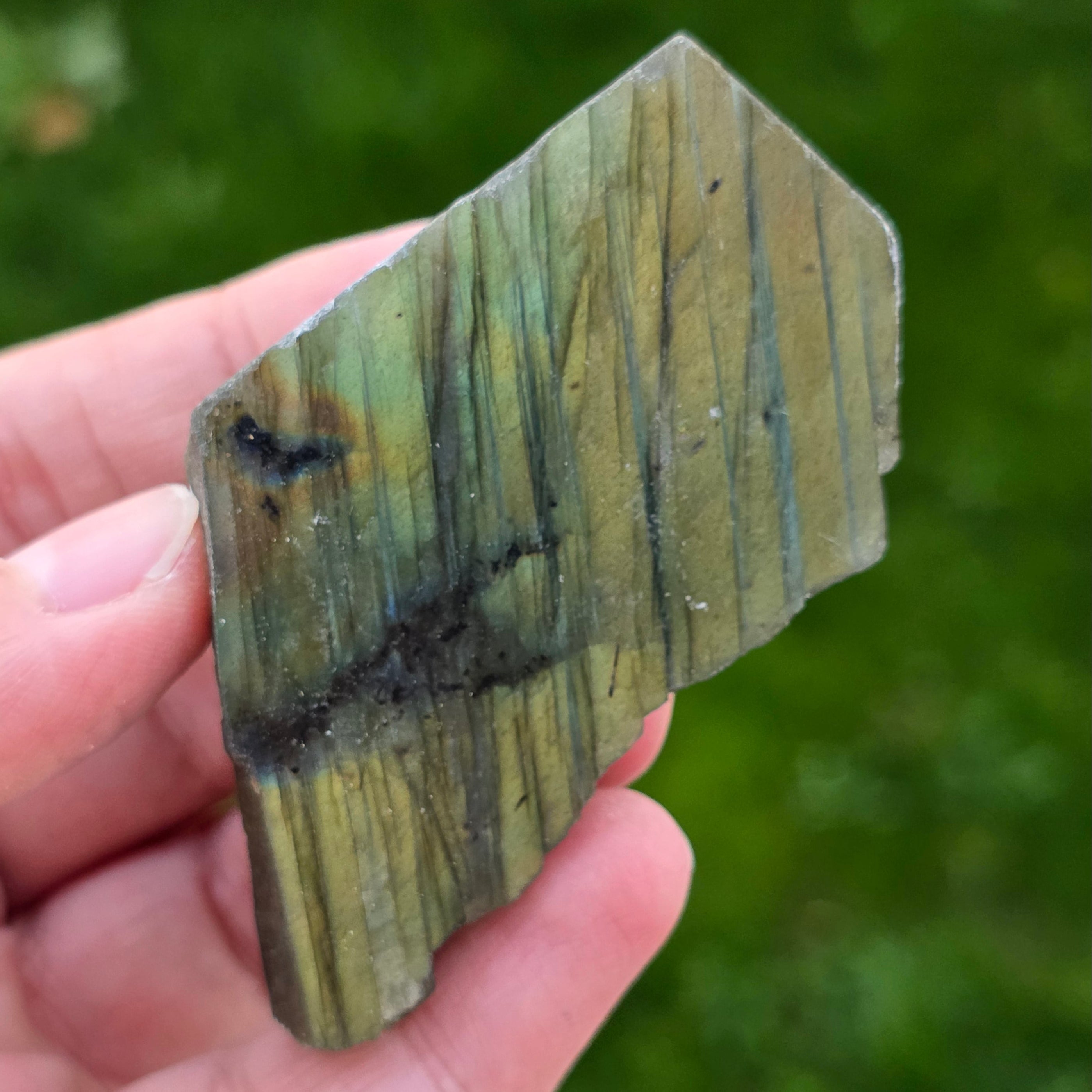 Rezensionen- Labradorit polierter Rohstein auf einer Seite m15