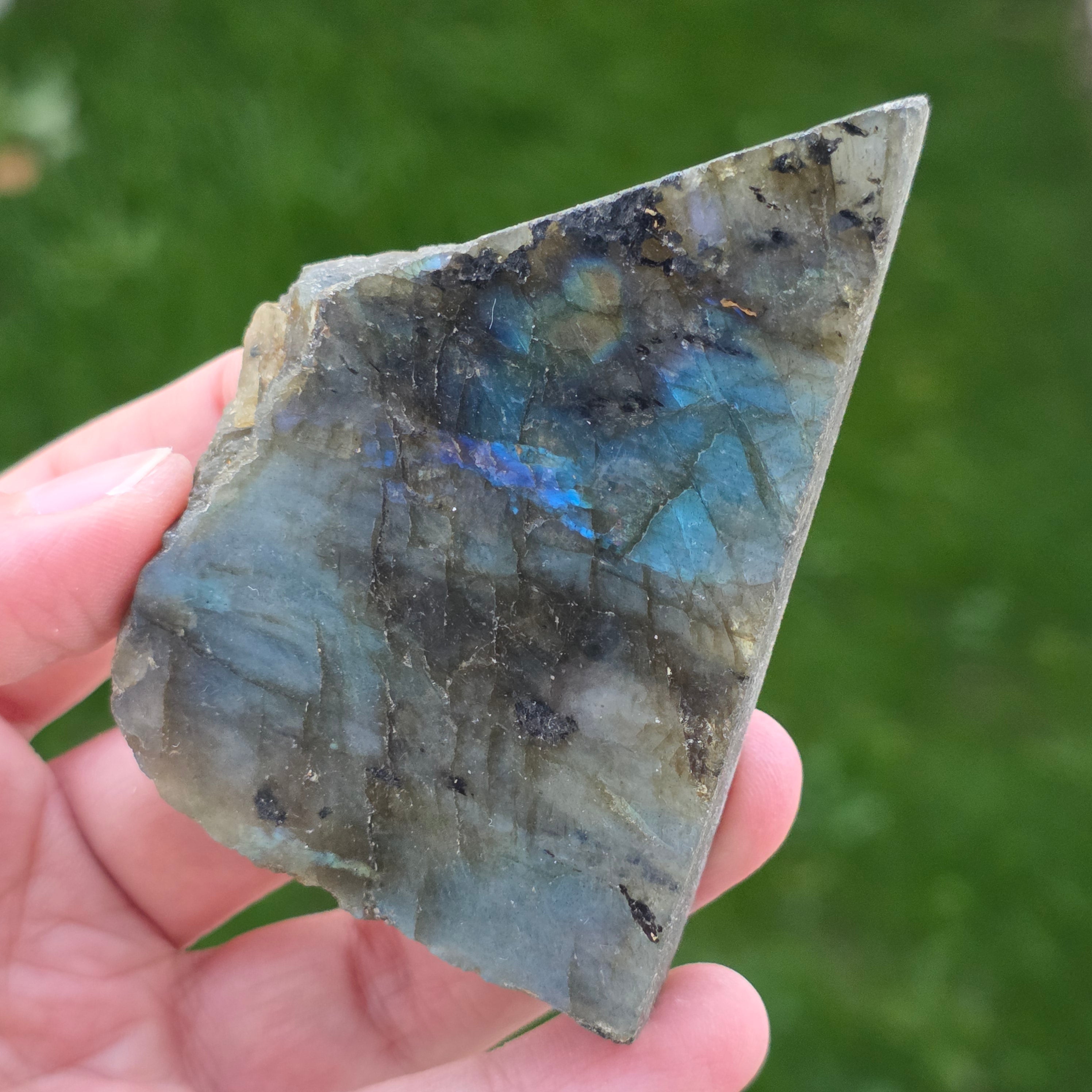 Rezensionen- Labradorit polierter Rohstein auf einer Seite m16