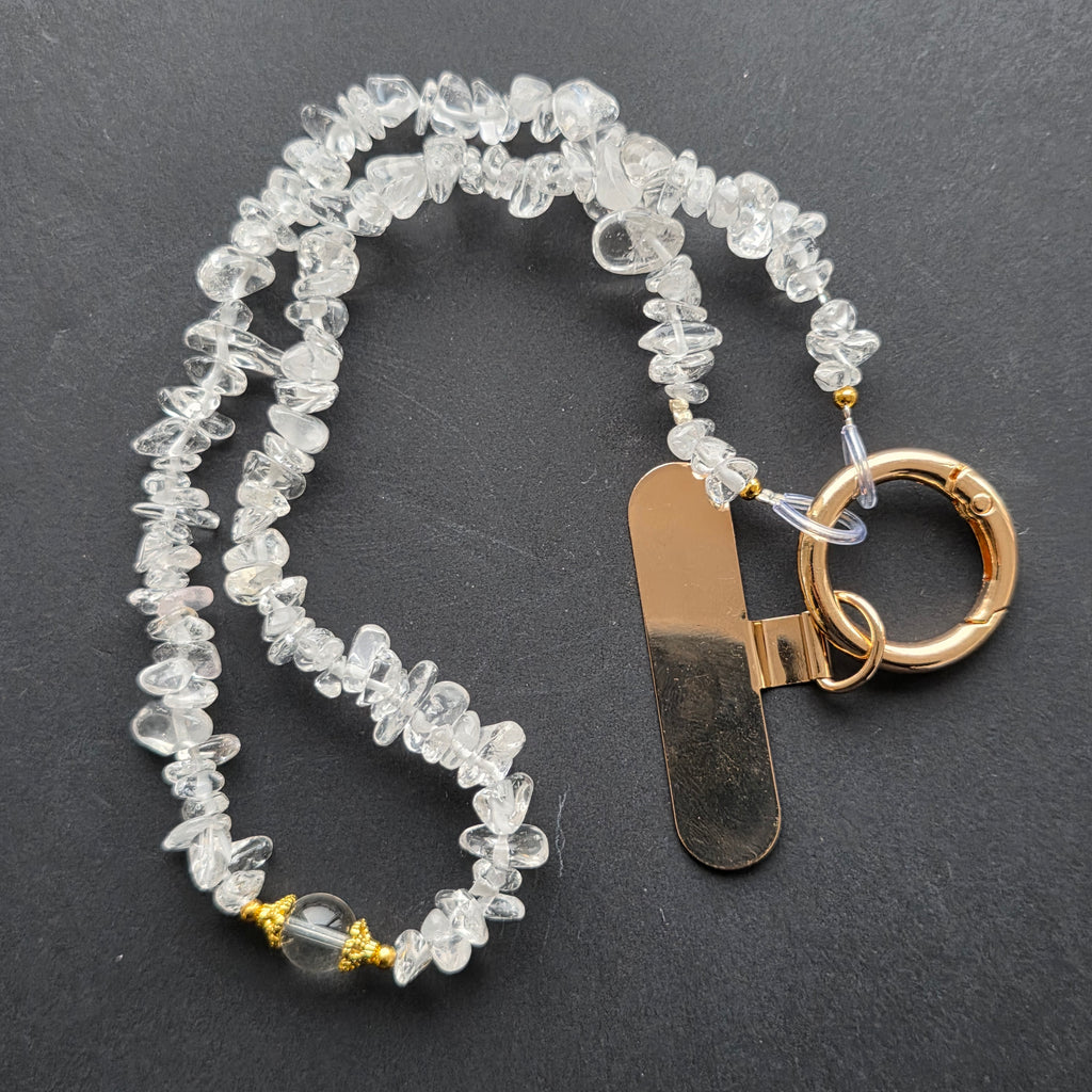 Lanțul pentru telefon din cuart incolor este accesoriul care îmbină eleganța naturală a cristalelor cu utilitatea modernă a unui obiect folosit zilnic. Realizat din chipsuri autentice de cuart transparent, fiecare piesă reflectă lumina în mici scintilații, ca niște picături înghețate care dansează discret la fiecare mișcare.