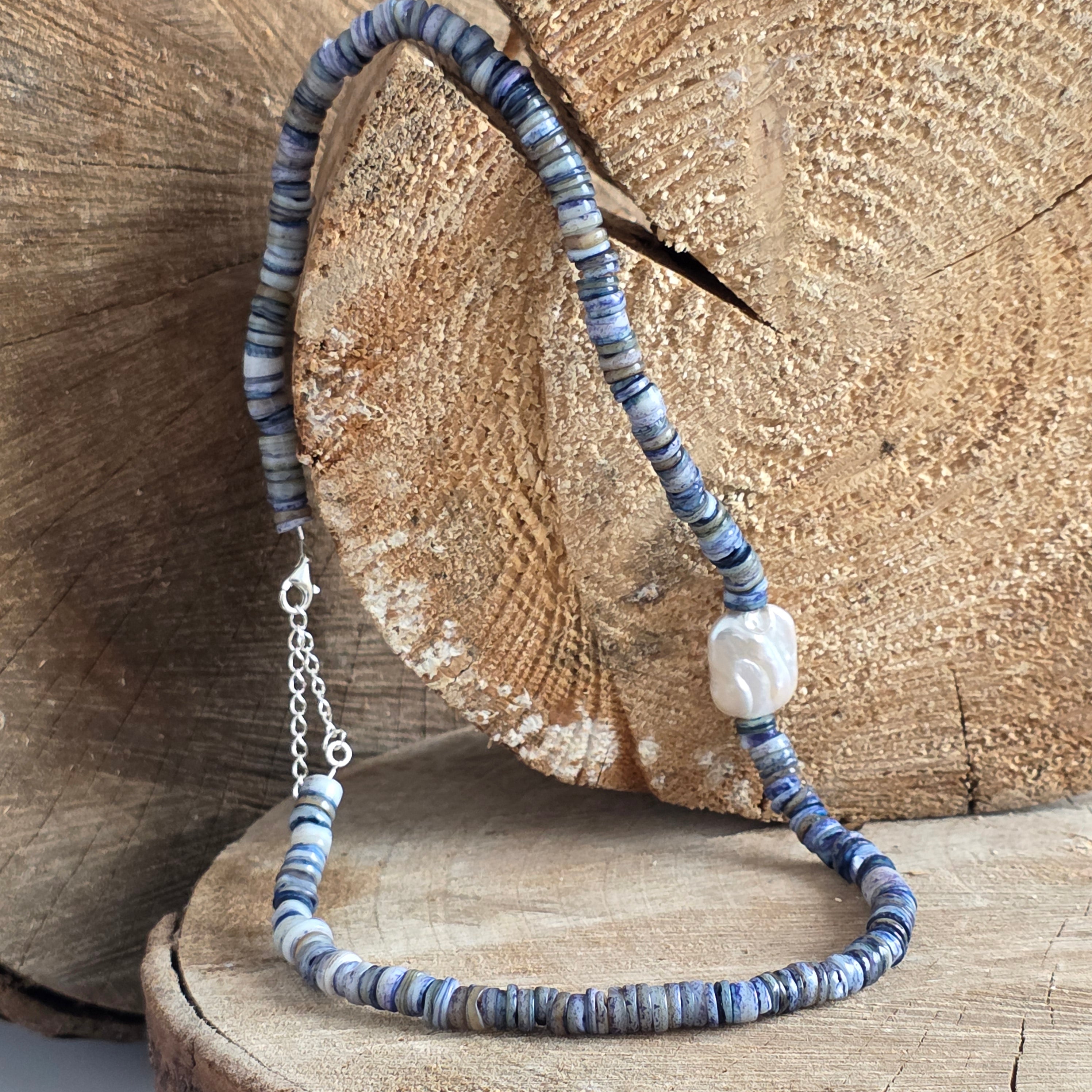 Materialien: natürliche Lapislazuli-Scheiben 6 mm, rechteckige Naturperle 2 cm, Silber 925
