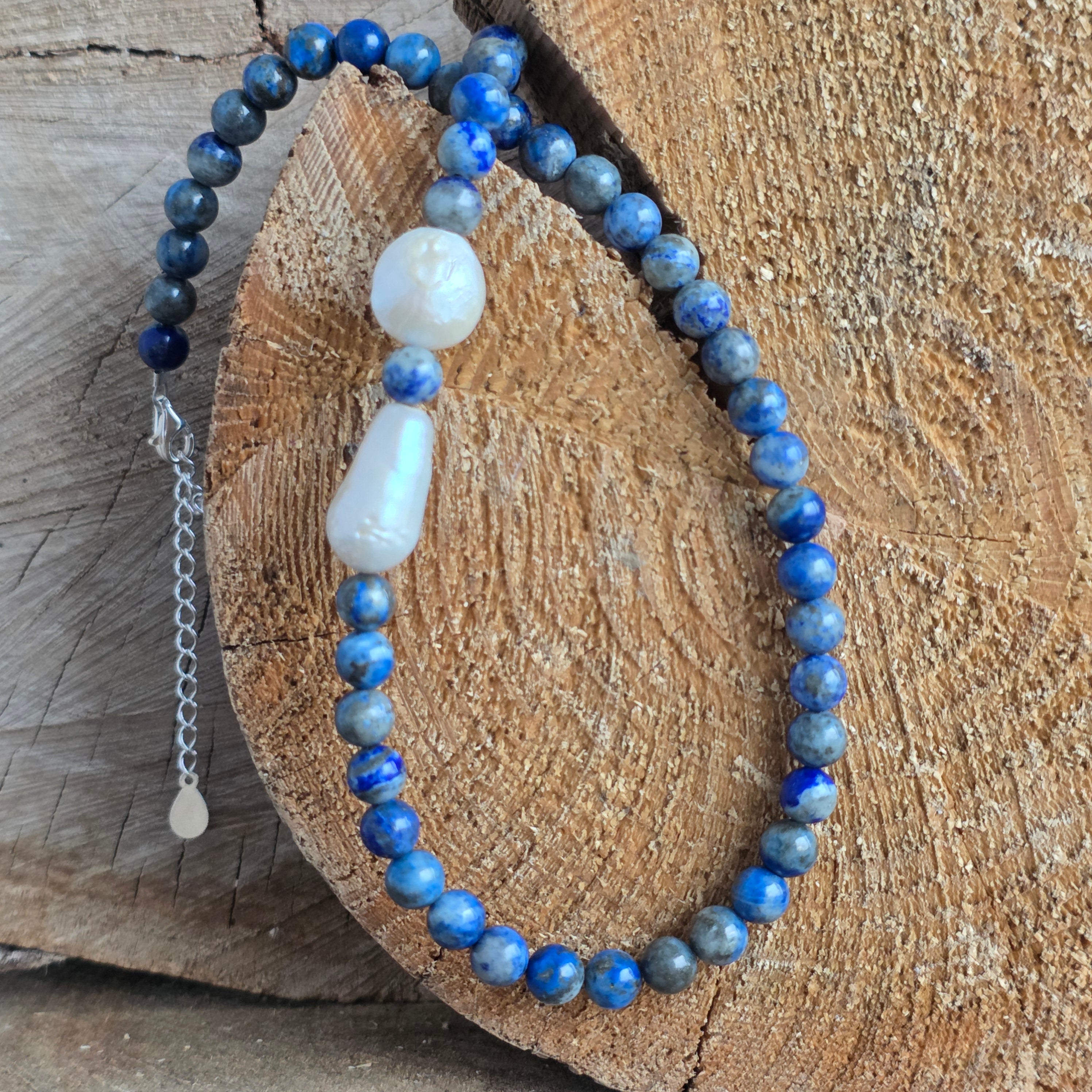 Aus 6mm natürliches Lazuli Revers, mit seinen tiefen Blautönen und subtilen goldenen Reflexen von Pyrit, wird das Collier ergänzt durch zwei natürliche Perlen was einen Hauch von Finesse und Ausgewogenheit verleiht. Die Perlen sind sorgfältig platziert, um die natürliche Schönheit des Lapis hervorzuheben und einen exquisiten Kontrast zu schaffen.