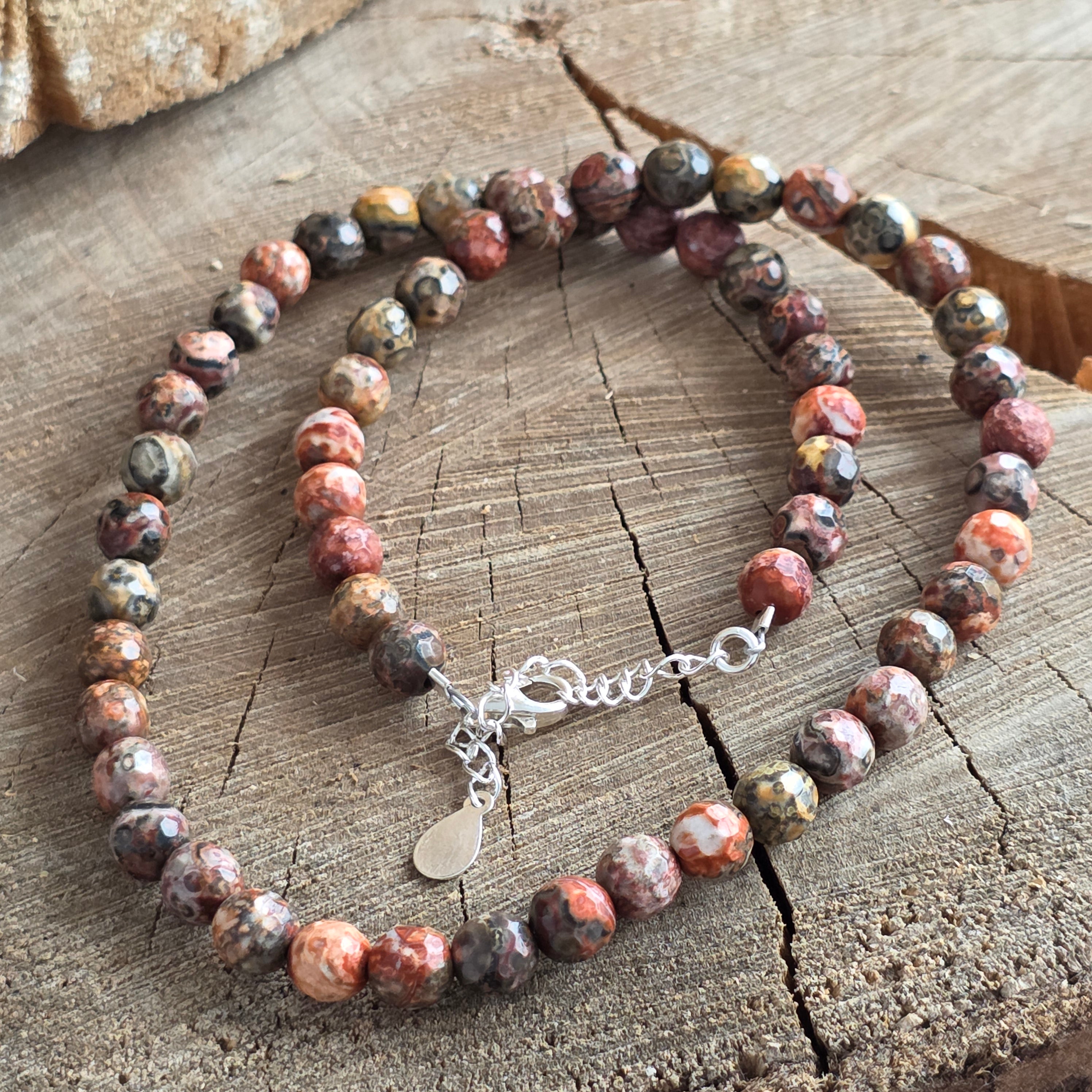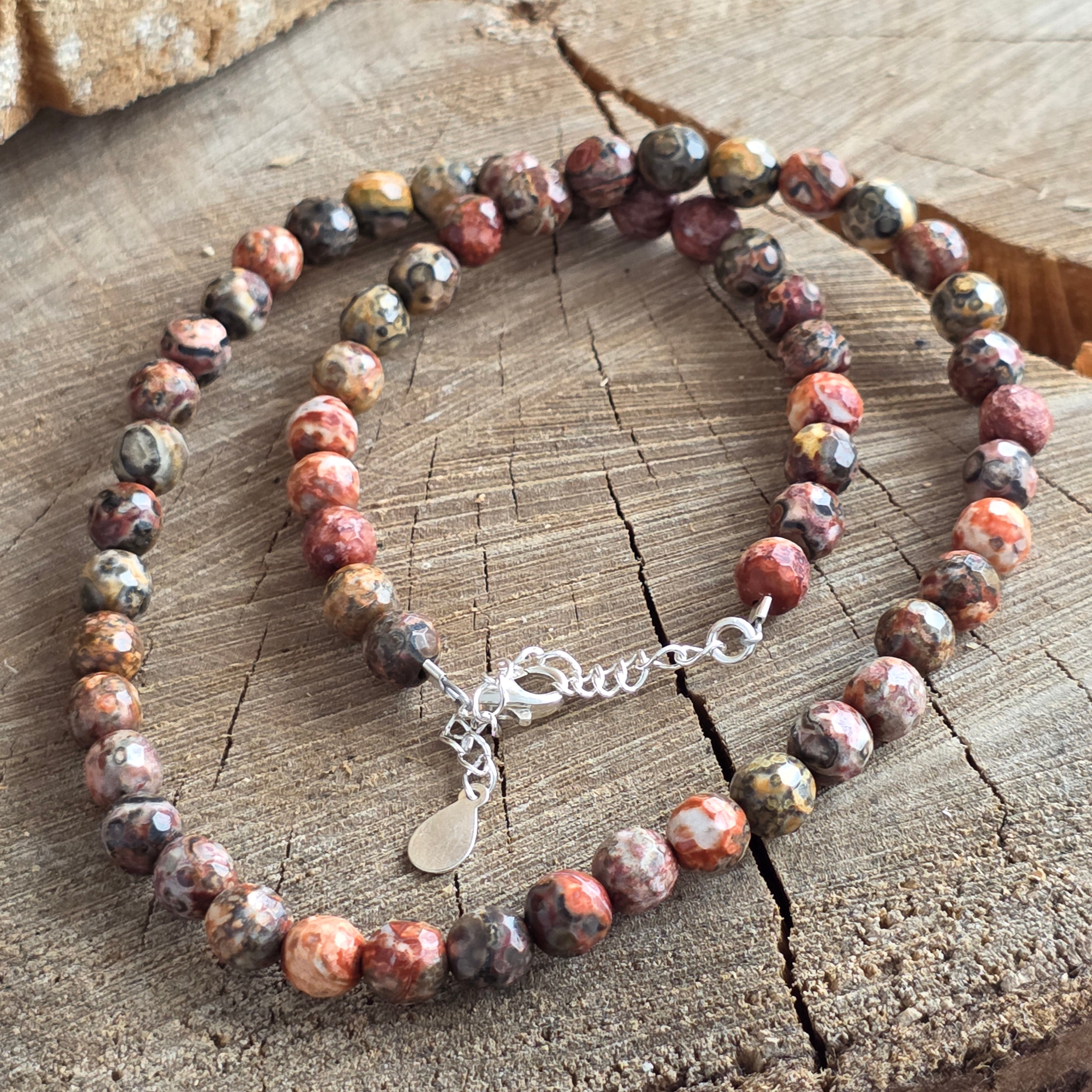Eine Halskette, die die sanfte Kraft der Erde und die diskrete Noblesse der wilden Natur ausstrahlt. Facettierter Naturjaspis Leopard, 6 mm fesselt durch die Kombination erdiger Farben und organischer Formen, die wie von der Zeit gemalt erscheinen. Seine feinen Facetten reflektieren subtil das Licht und verleihen dem Schmuckstück eine warme und authentische Eleganz, perfekt für alle, die natürliche Schönheit lieben.