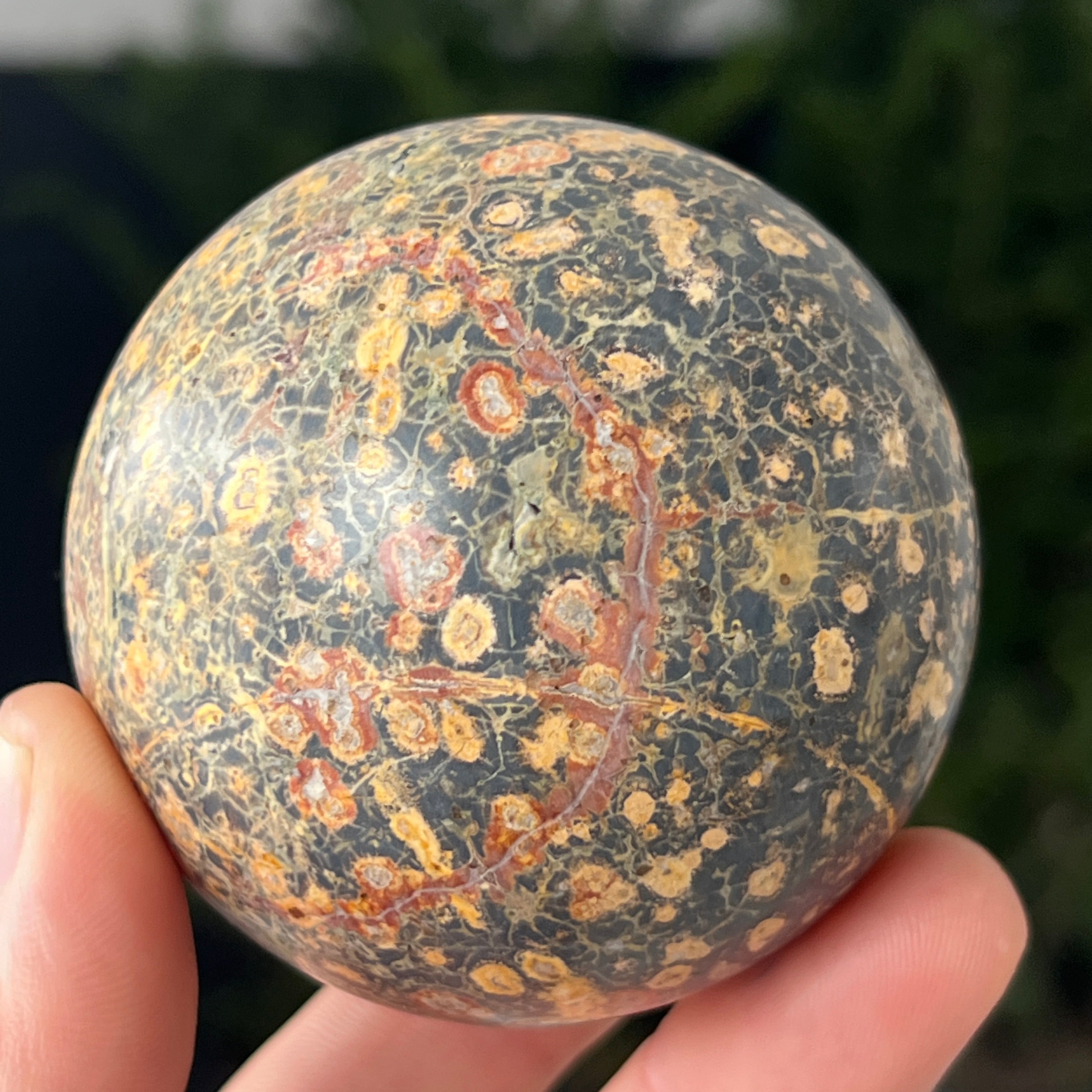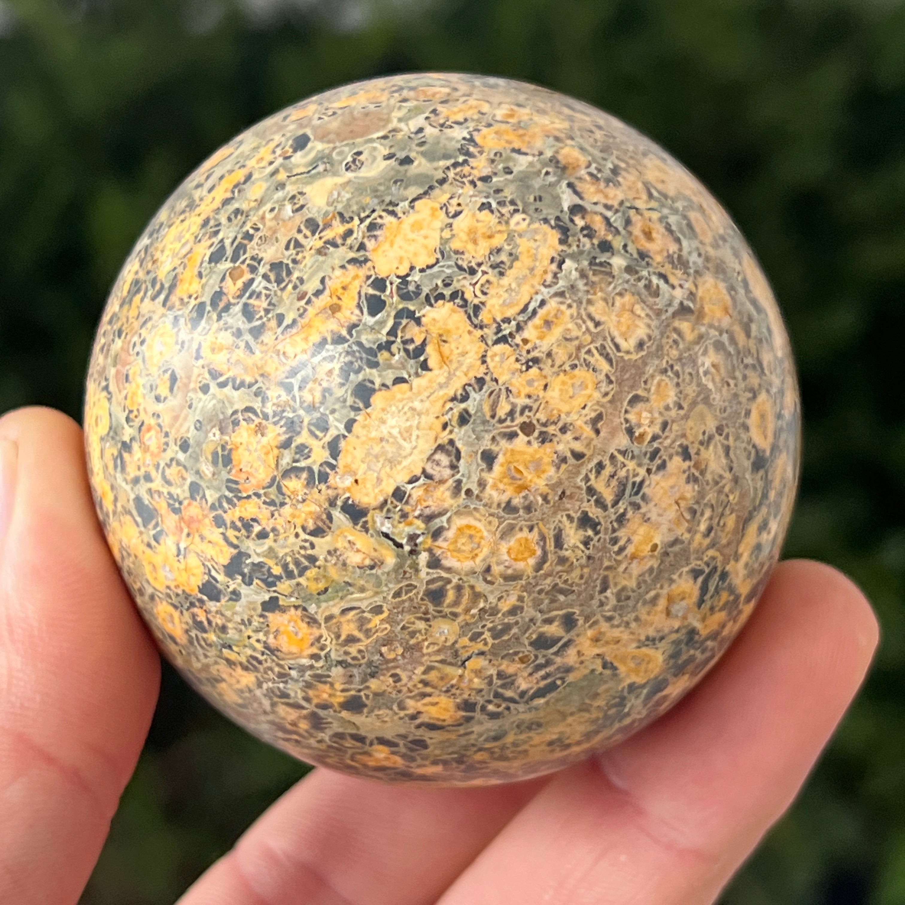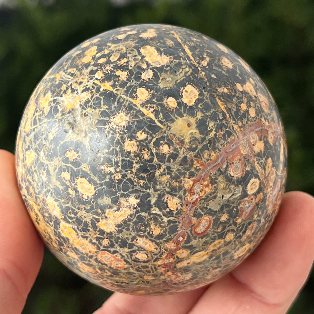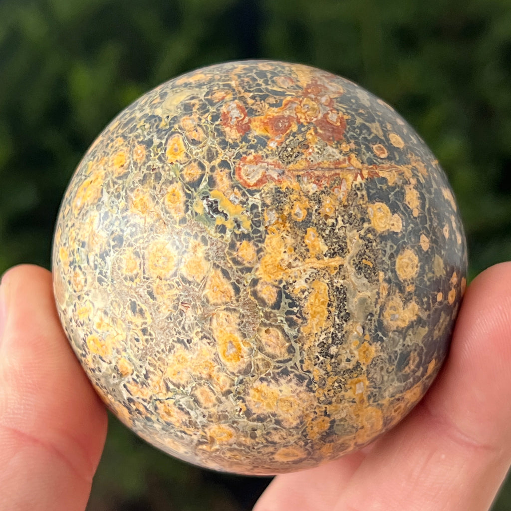 Leopard ist einer Art Jaspis mit Manganeinschlüssen und Eisenoxiden, wodurch braune, schwarze oder rote Flecken auf gelbem, cremefarbenem oder grünem Hintergrund entstehen. Seine Textur ähnelt der Haut eines Wildtiers, was ihm ein natürliches, aber gleichzeitig exotisches und attraktives Aussehen verleiht.