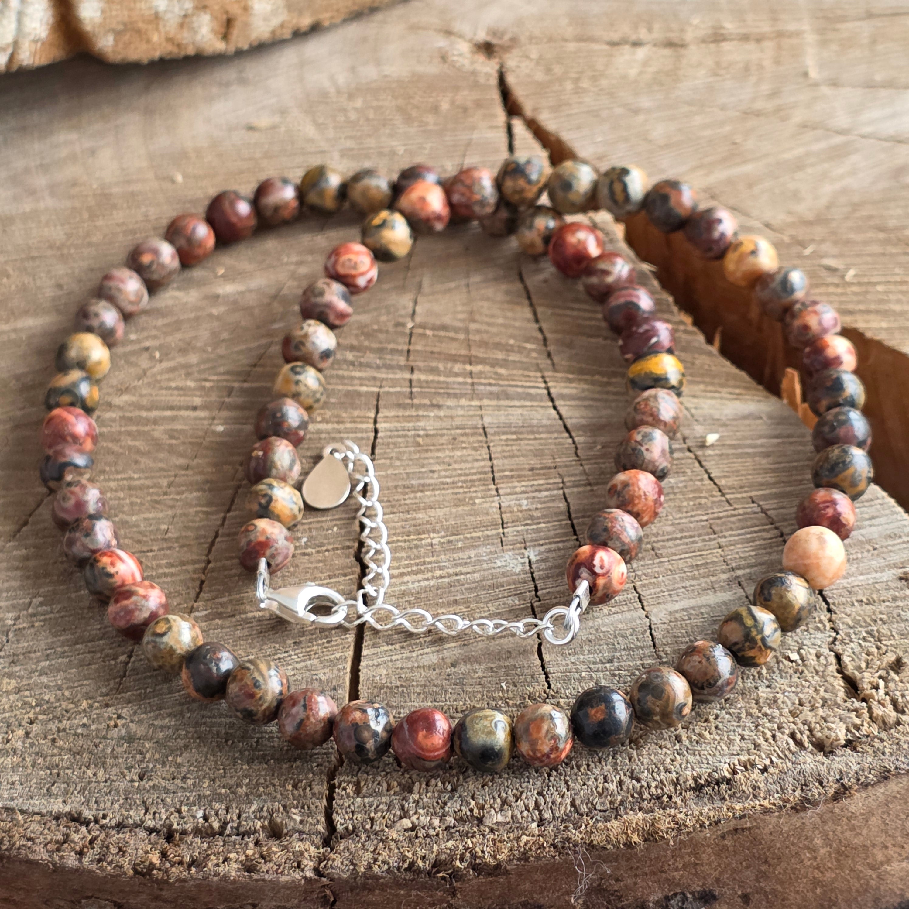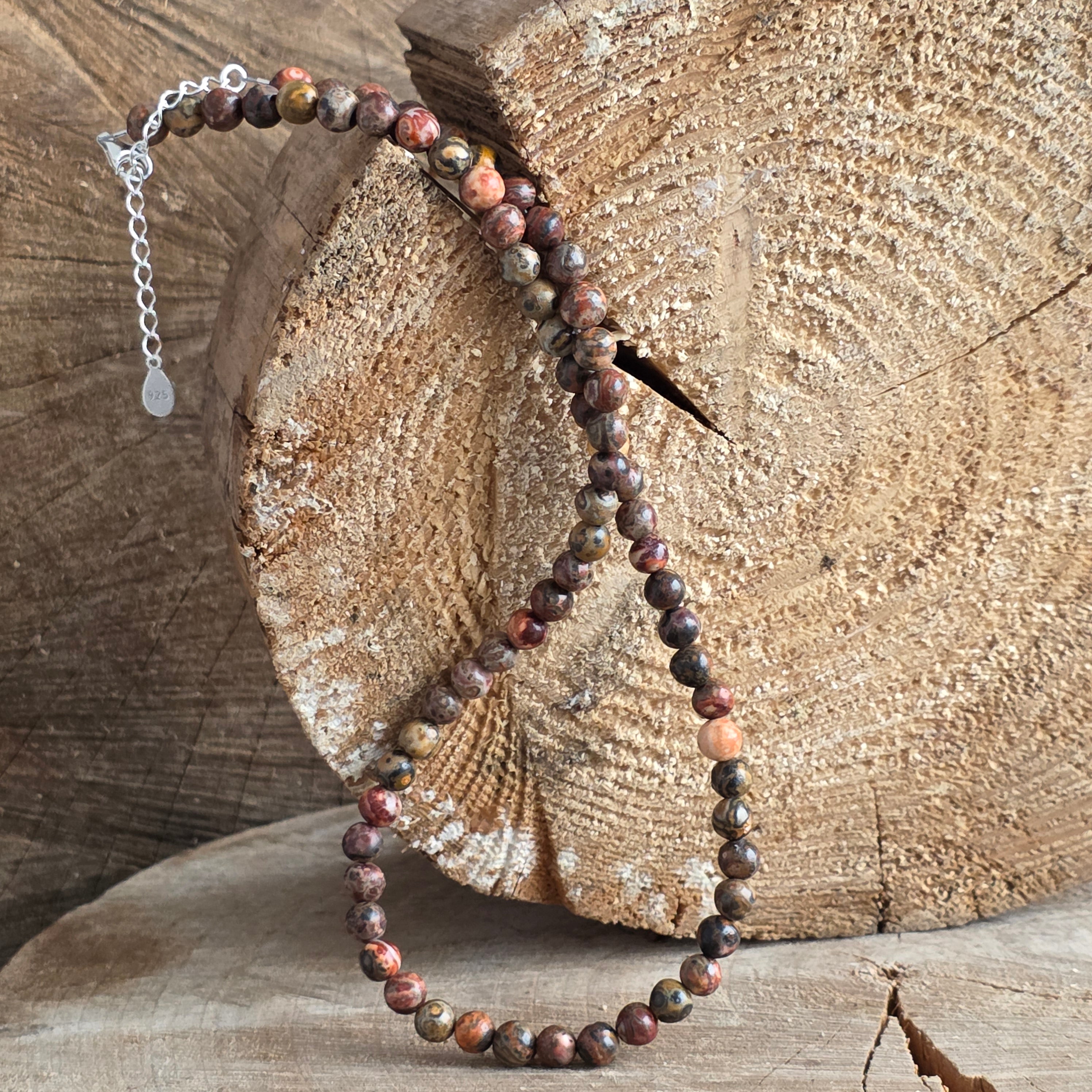 Eine Halskette, die die stille Kraft der Erde und die instinktive Eleganz der Natur hervorbringt. Der natürliche 6 mm Leopardenjaspis zeichnet sich durch lebendige Texturen und die Kombination warmer Erdnuancen aus, die wie aus trockenen, felsigen und lebendigen Landschaften entnommen erscheinen. Die glatte Kugelform verleiht dem Schmuckstück eine natürliche Fließfähigkeit, und das Silber setzt einen Hauch zeitloser Raffinesse.