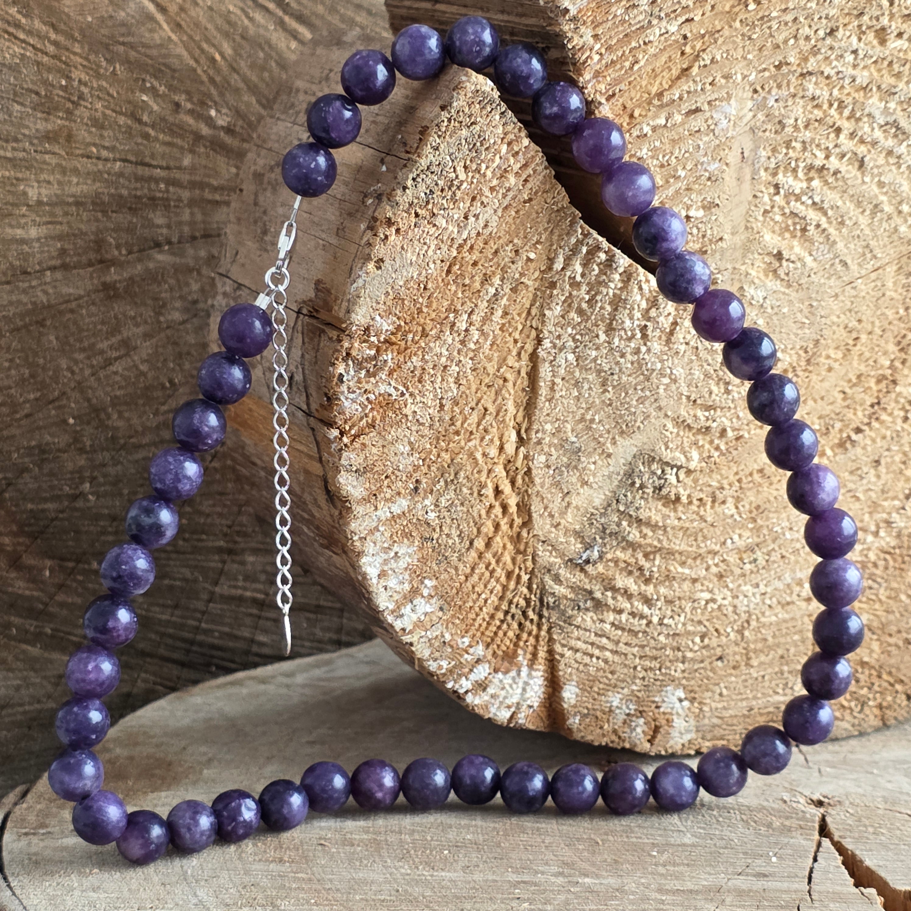 Eine Atemkette Ruhe und Delikatesse, wie ein Schuss in der Dämmerung oder ein im Geheimnis gesprochener Gebet. Die Perlen von Natural Lepidolit 8 mm erzeugen mit ihren lavendel und grau -festen grauen Reflexen einen ruhigen und schützenden Fluss.