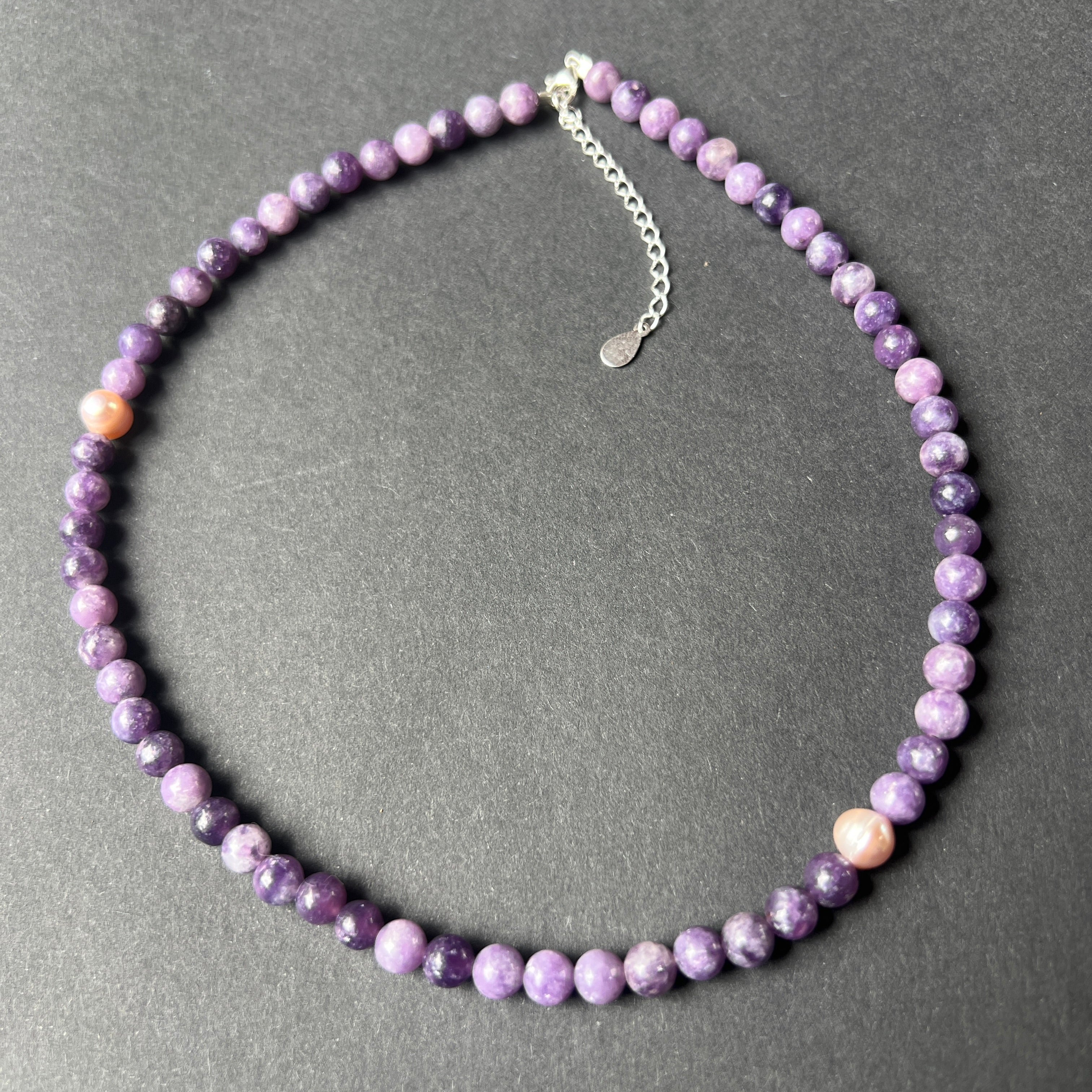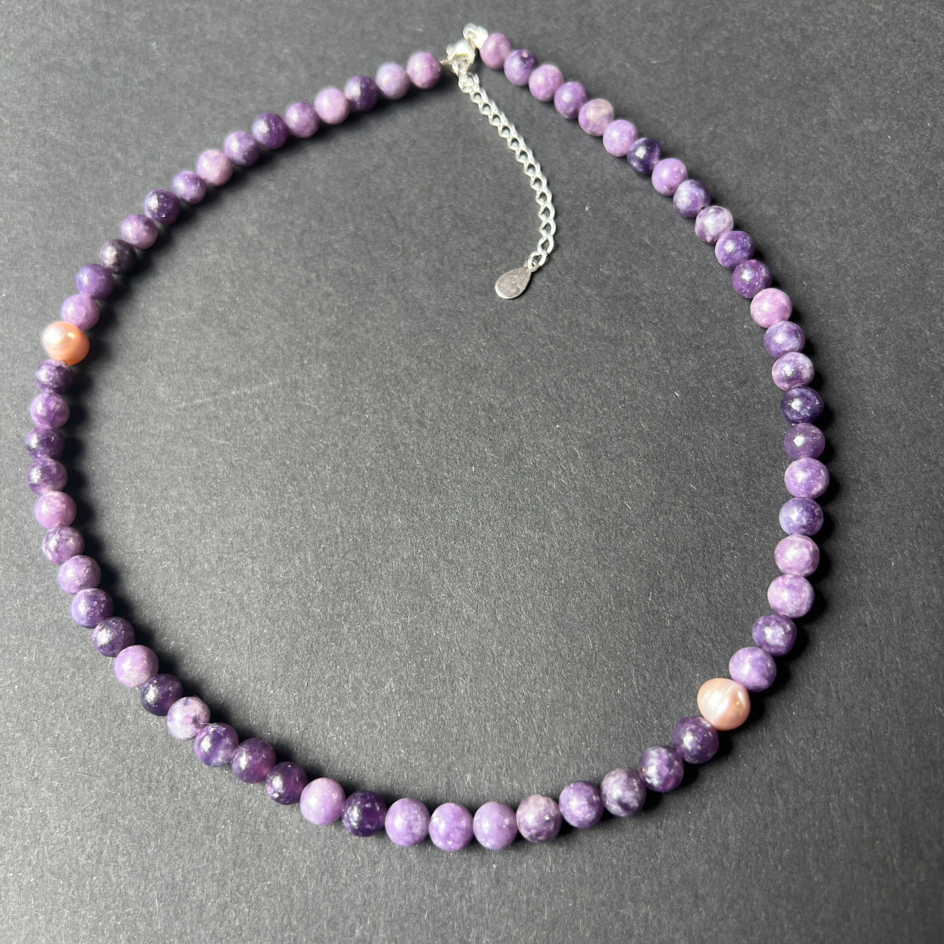 Materialien: Lepidolith 6 mm, 2 natürliche Perlen 6 mm, Silber 925