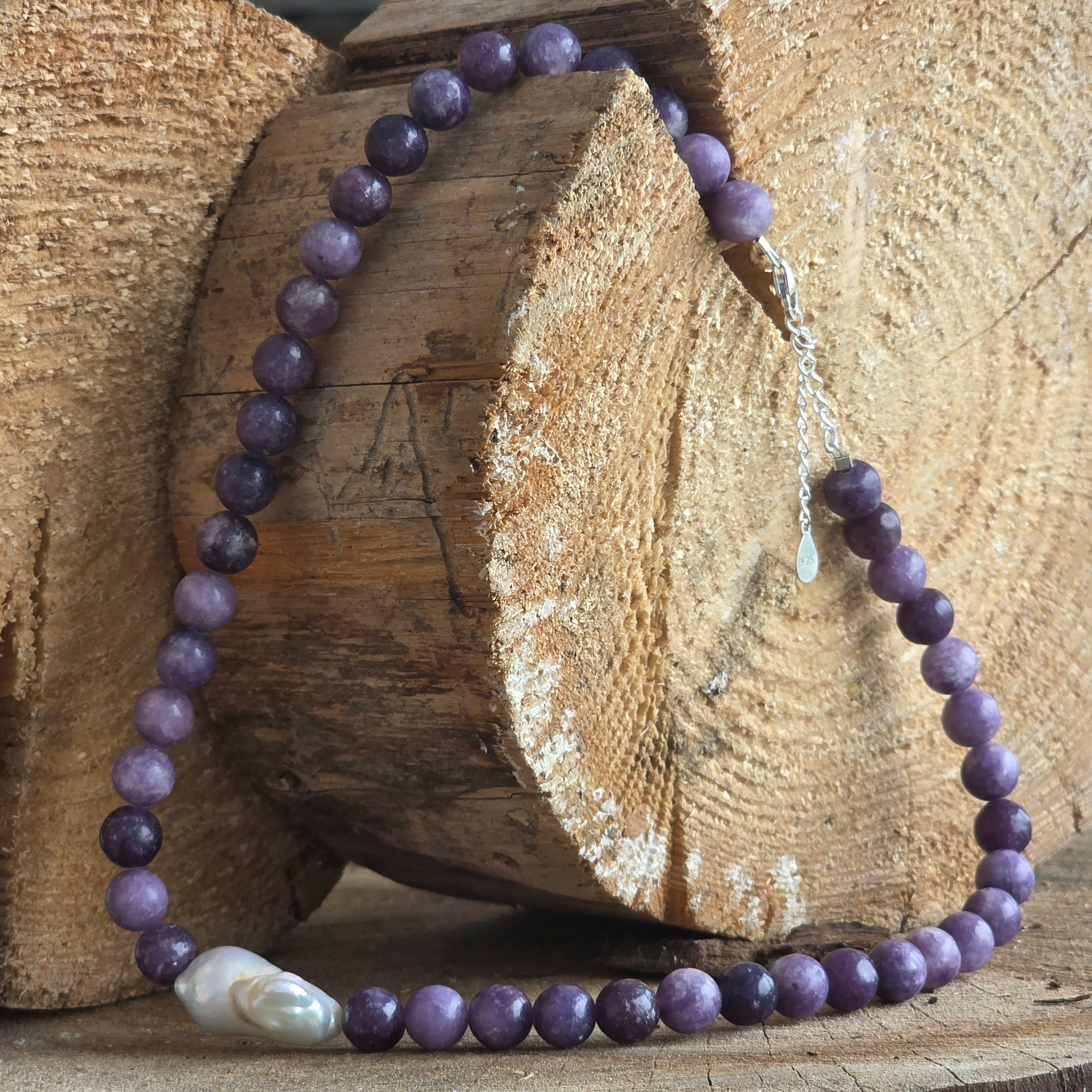 Materialien: natürlicher Lepidolith 8 mm, natürliche Perle 2 cm, 925er Silber