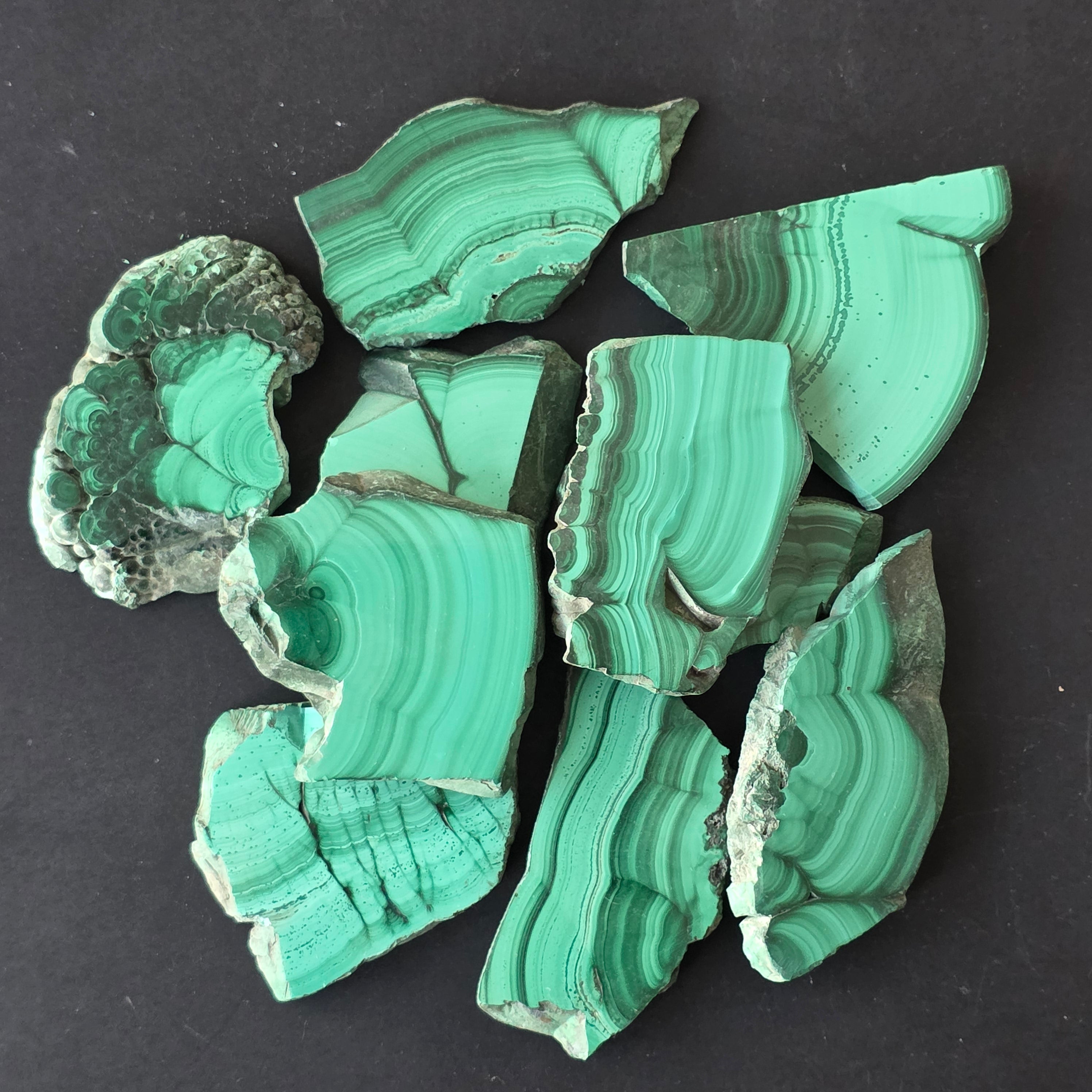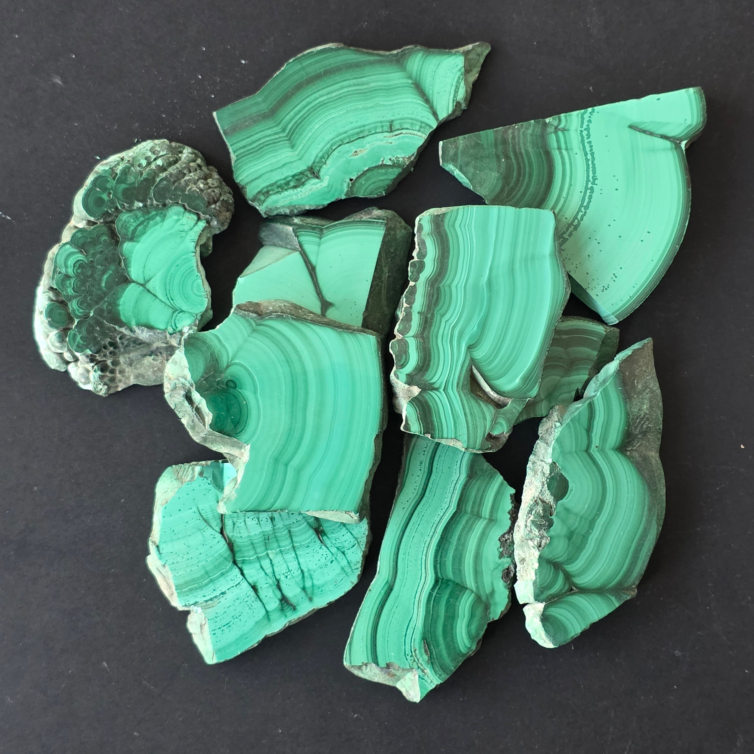 Fügen Sie ein hinzu Malachitscheibe Nehmen Sie es in Ihre Sammlung auf und lassen Sie seine grüne, regenerierende Energie Harmonie, Mut und Ausgeglichenheit in Ihren Raum bringen.