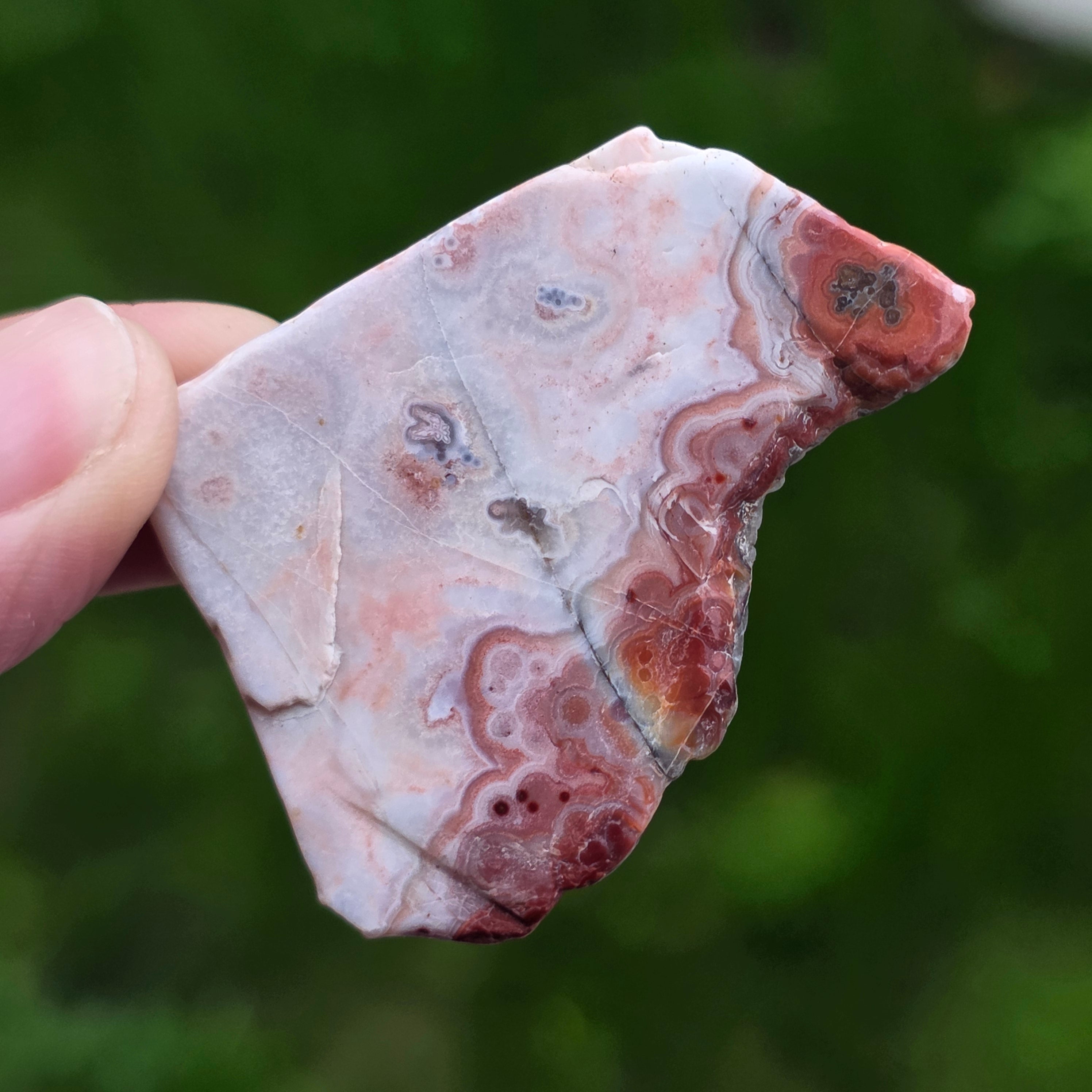 Der Crazy Agat aus Mexiko ist eine der lebhaftesten und spektakulärsten Sorten von Agat, berühmt für seine wellenförmigen Linien und die verrückten Farbspiele, die wie von einer freien Hand ohne Regeln gemalt wirken. In dieser natürlichen Scheibe, klein aber extrem ausdrucksstark, entfaltet sich die ganze Geschichte des Steins: erdige Schichten, warme Karamelltöne, leuchtendes Rot, Orange, Grau und Creme, vermischt in spiralförmigen Mustern, die zu pulsieren scheinen.