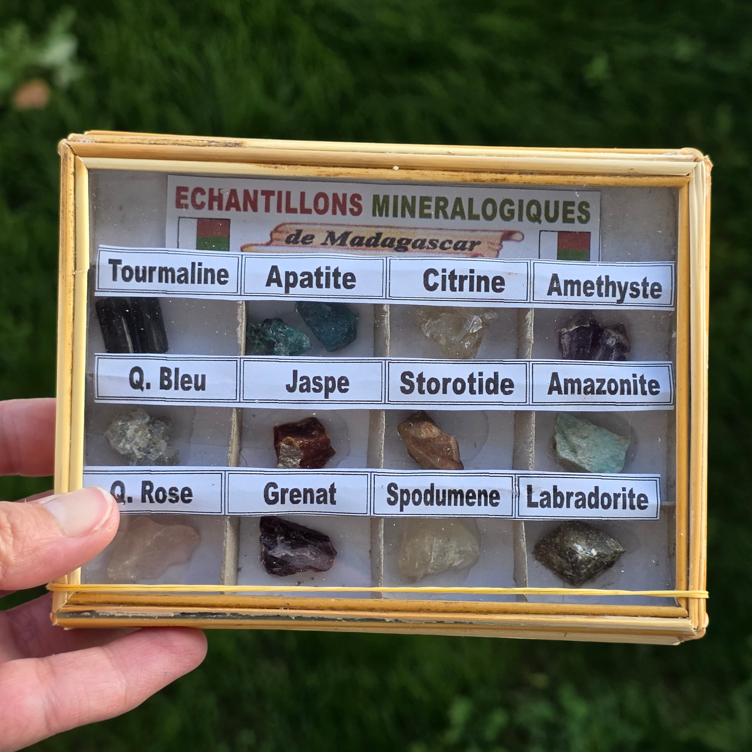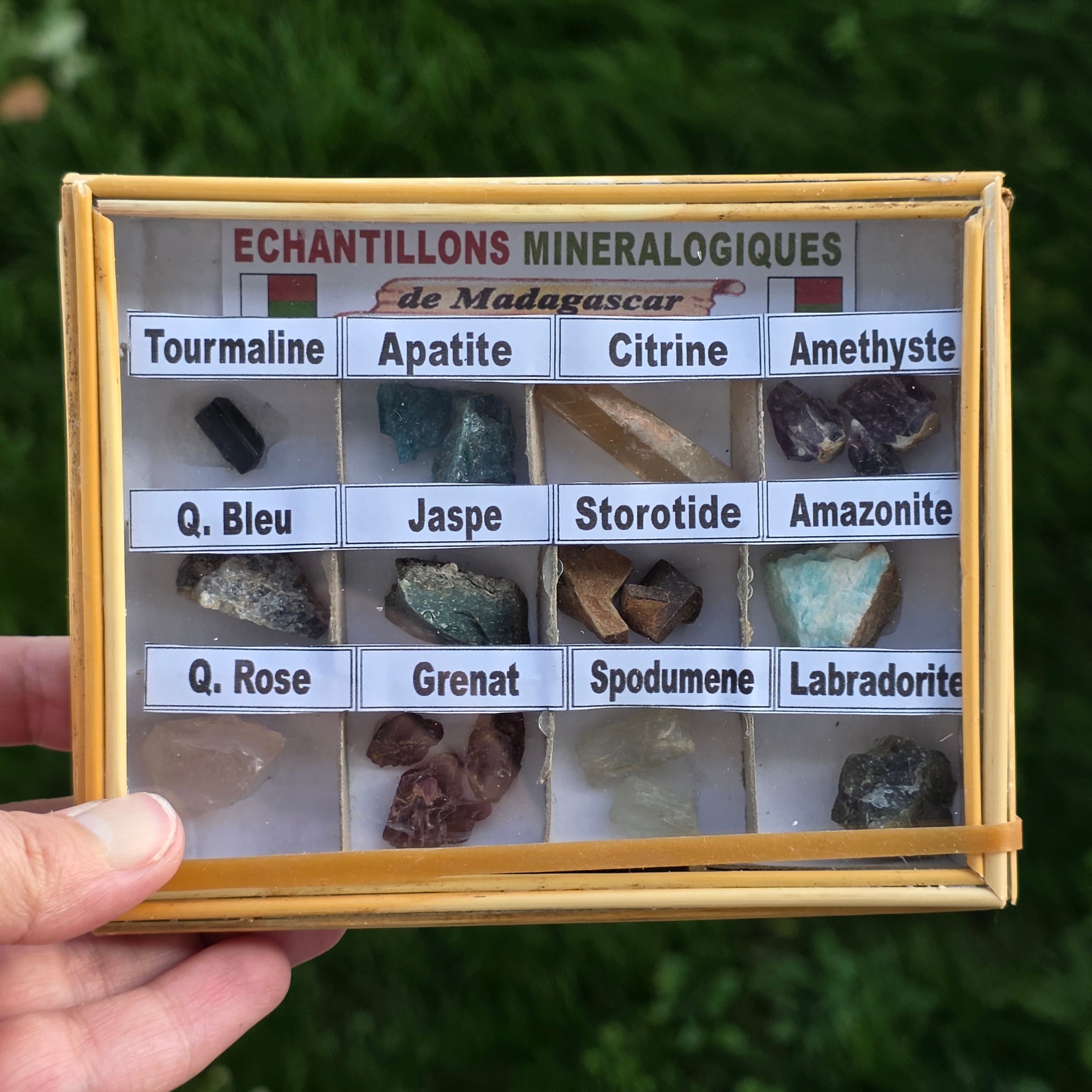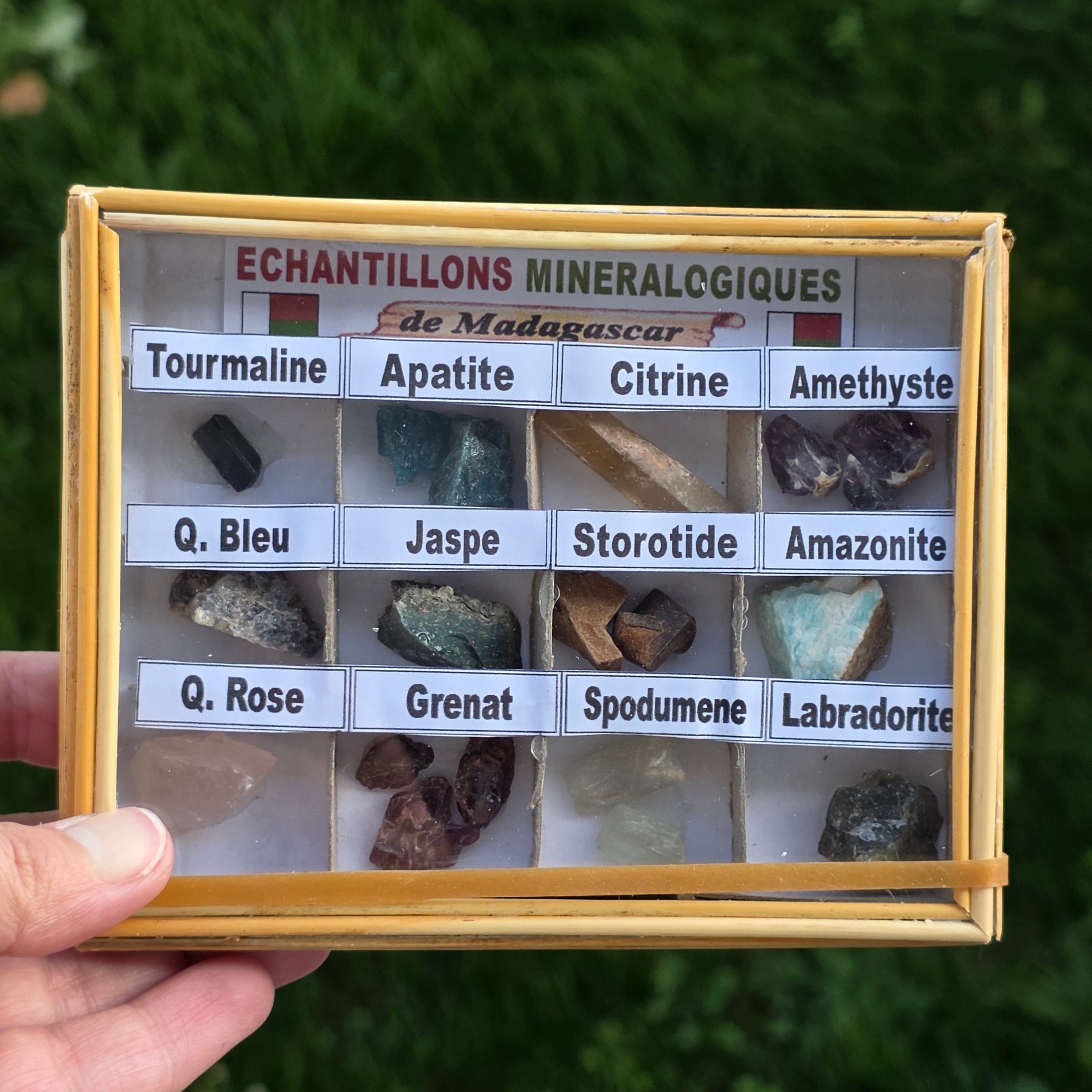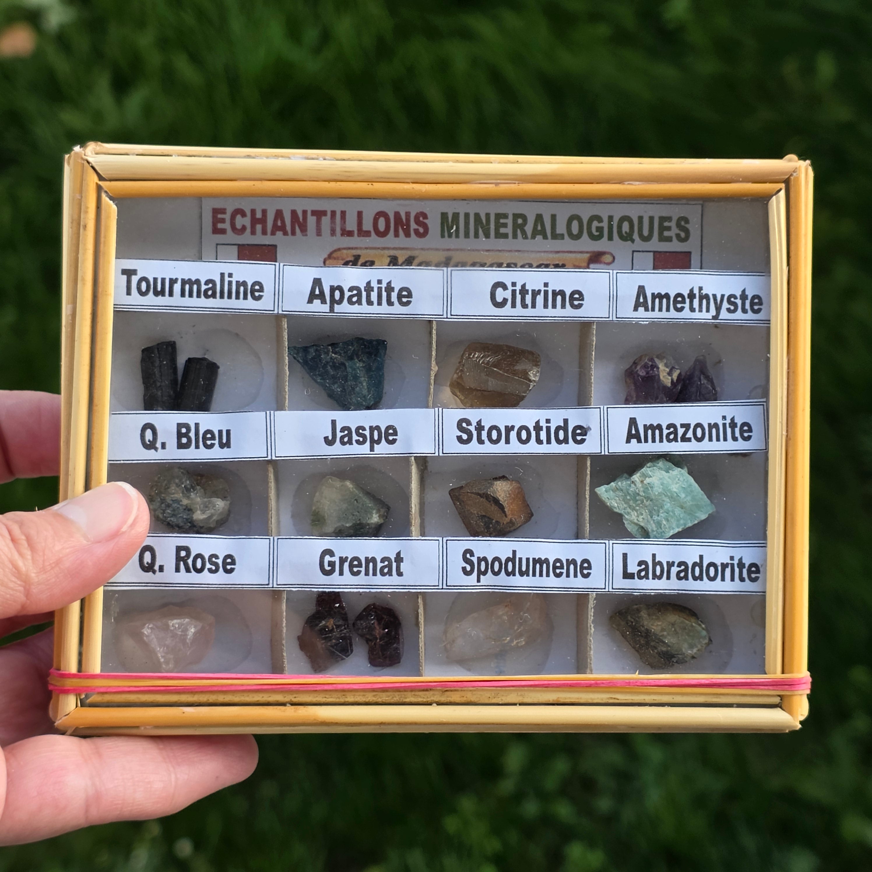 Ein authentisches mineralogisches Set aus Madagaskar, perfekt, um die Vielfalt und Schönheit der Naturminerale zu entdecken. Jedes Stück ist sorgfältig ausgewählt und einzeln präsentiert, wodurch die Sammlung zu einem unvergesslichen Geschenk oder zu einem wirklich besonderen Beginn einer Sammlung wird.