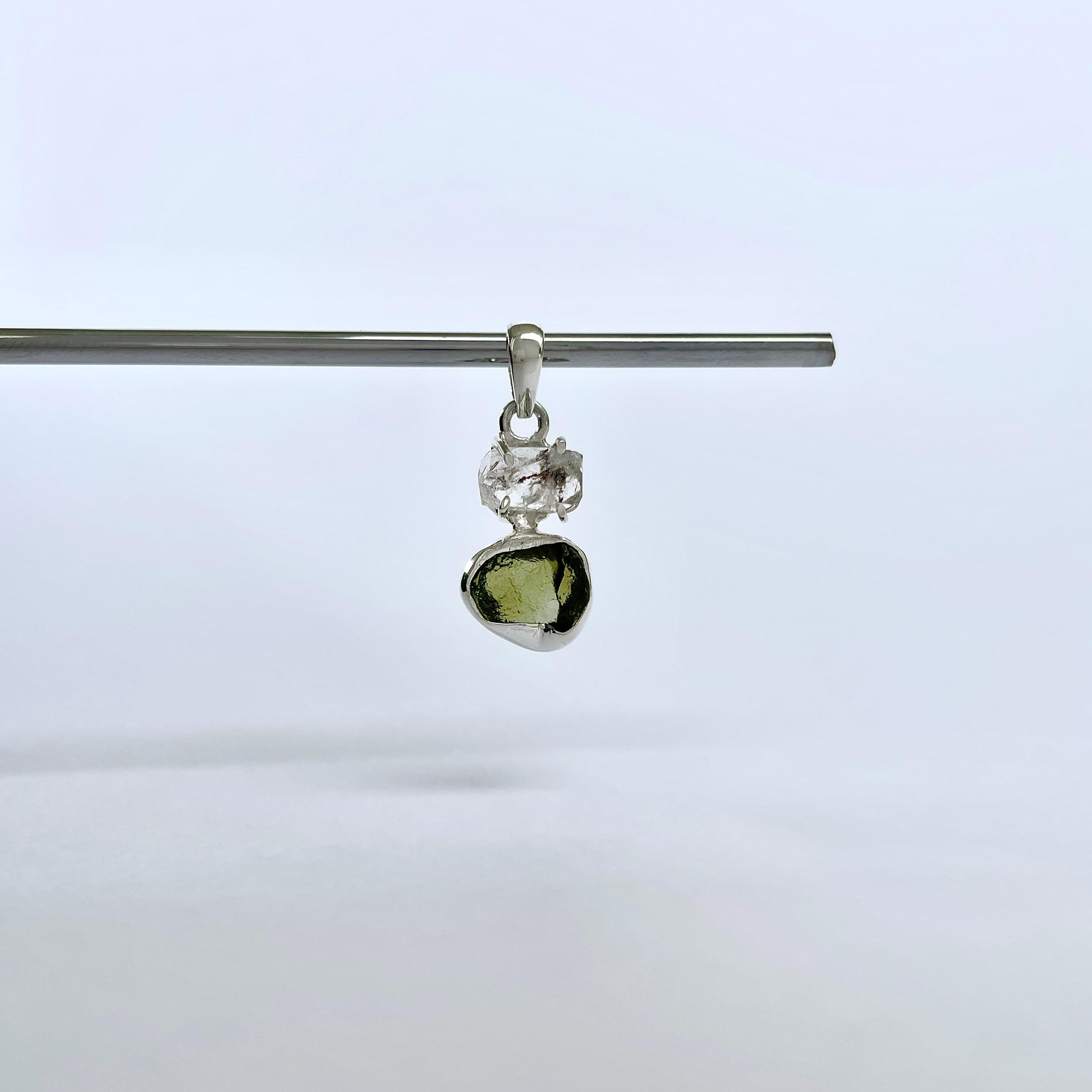 Ein Anhänger mit außergewöhnliche Energie, was zwei der mächtigsten Kristalle zusammenbringt, die in Spiritualität und Kristallentherapie verwendet werden: Moldat Und Herkimer Quarz.
