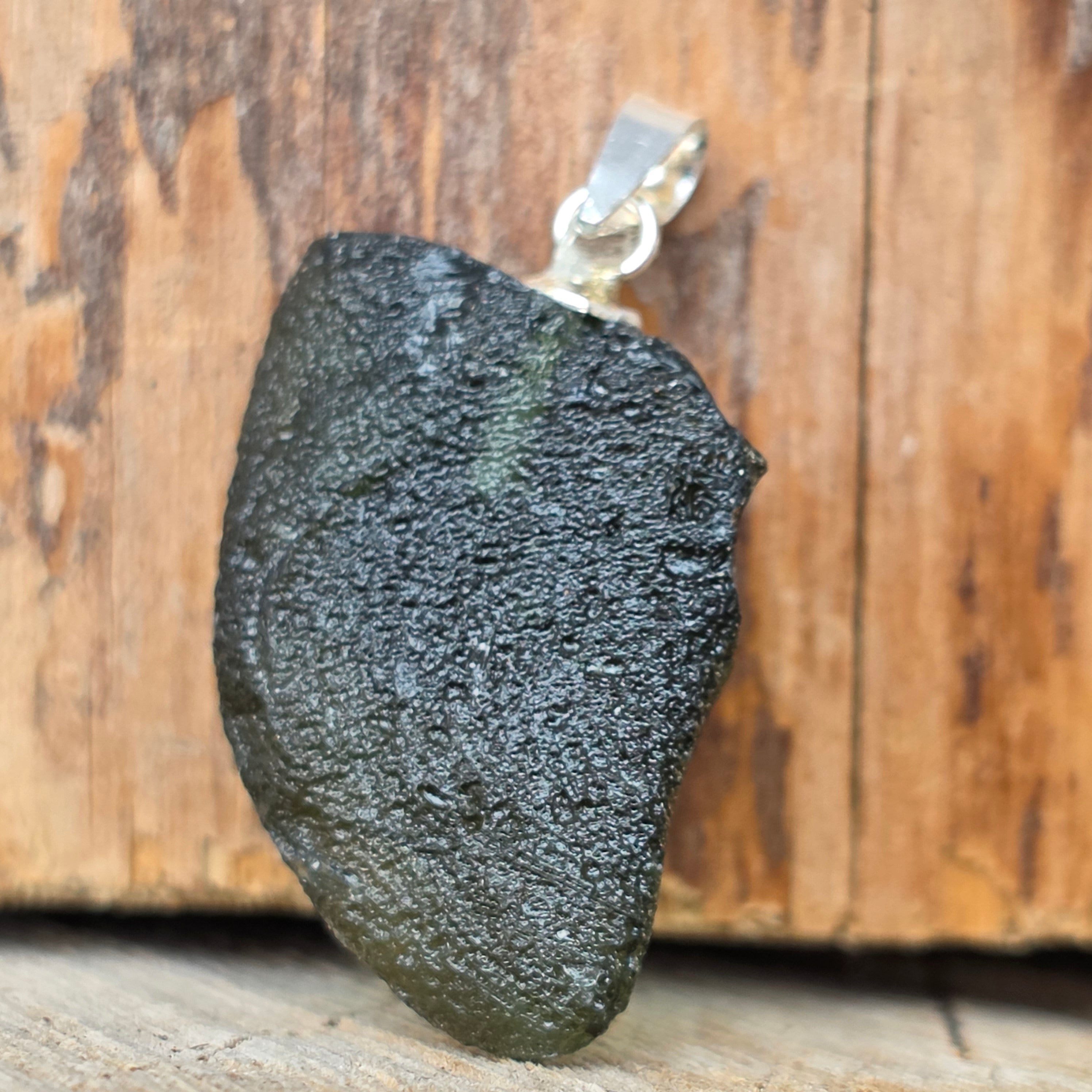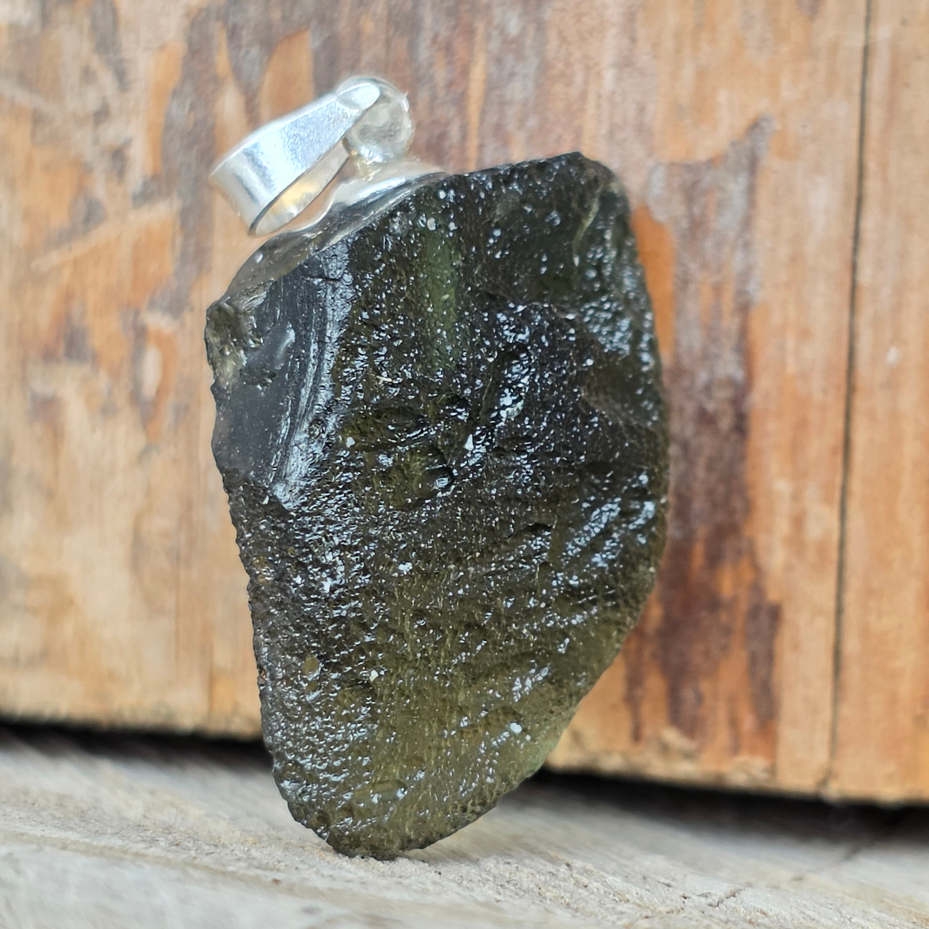 Ein seltener und echter Anhänger mit roher Moldavit, minimalistisch montiert 925er Silber um seine natürliche Form hervorzuheben.