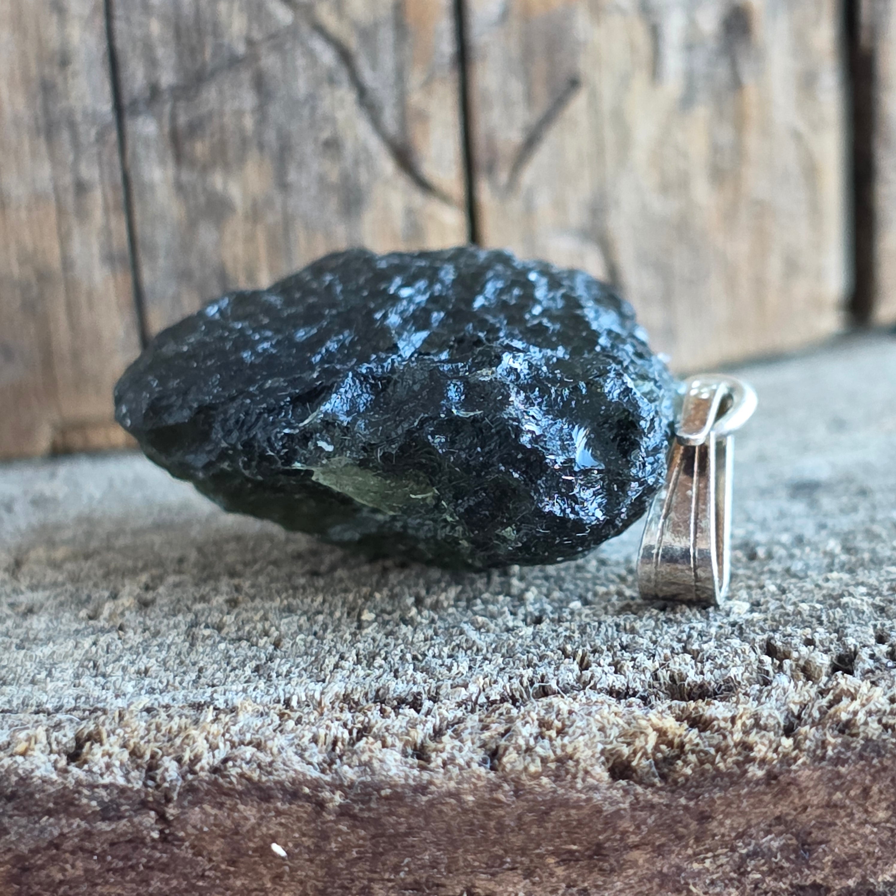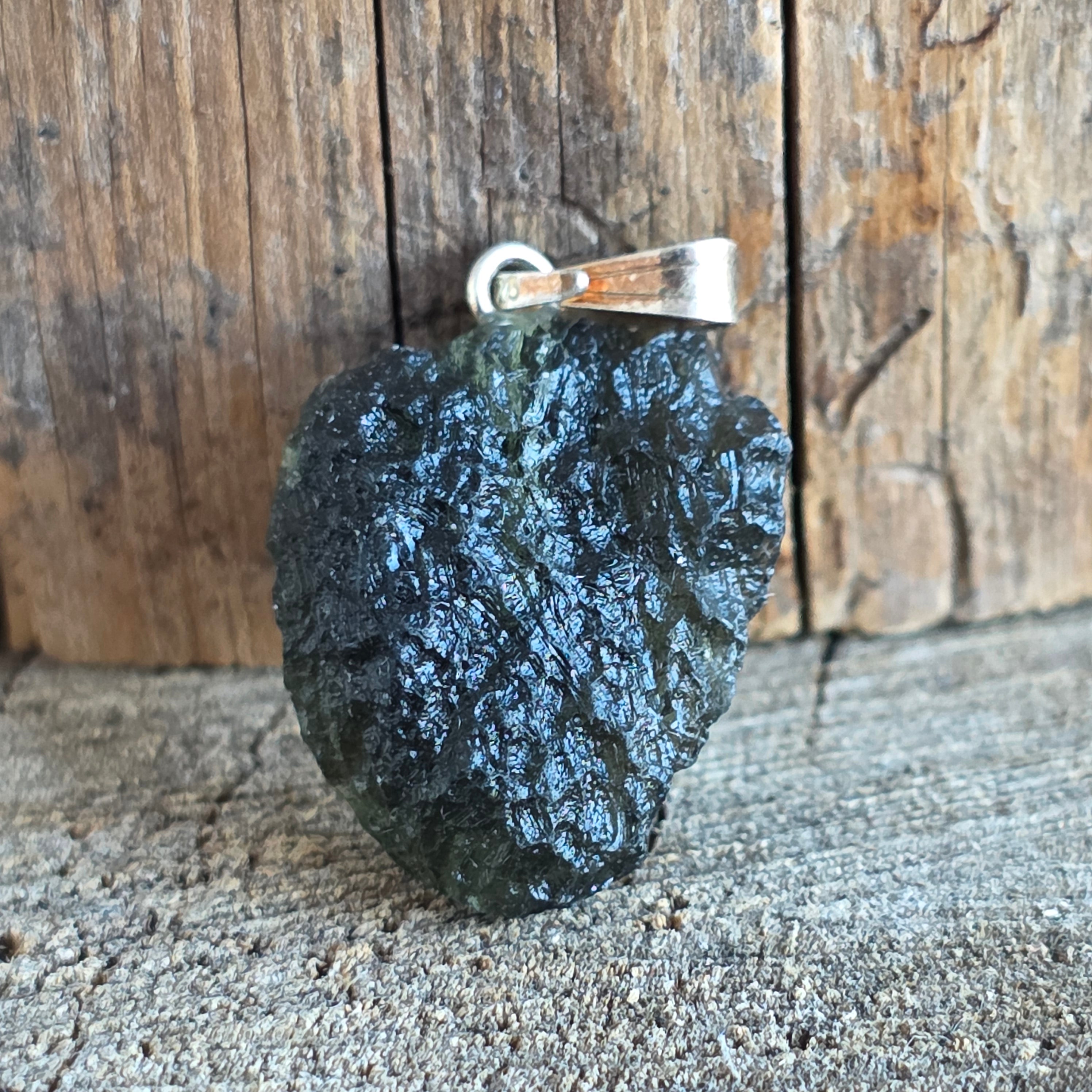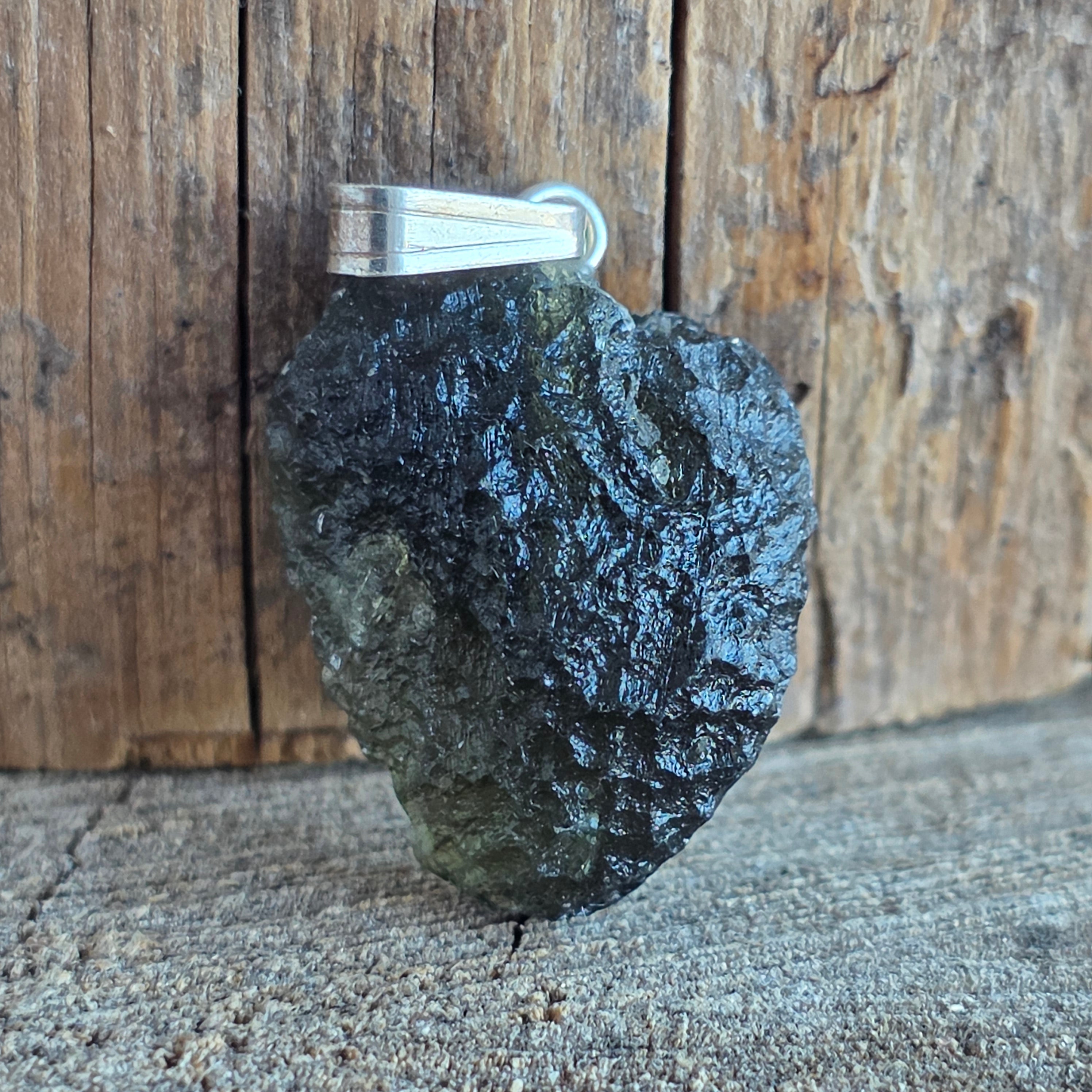 Ein seltener und authentischer Anhänger mit roher Moldavit, minimalistisch montiert 925er Silber um seine natürliche Form hervorzuheben.