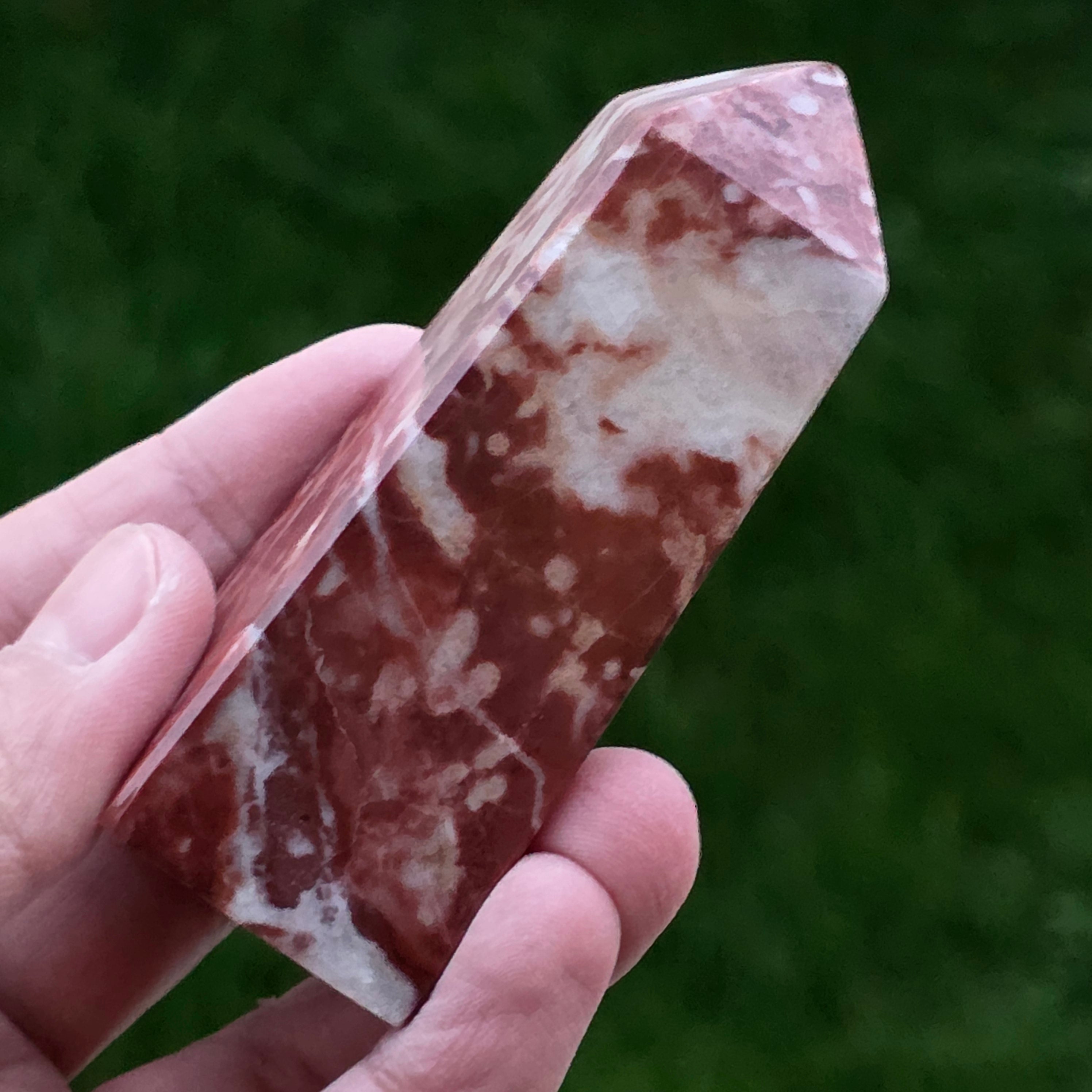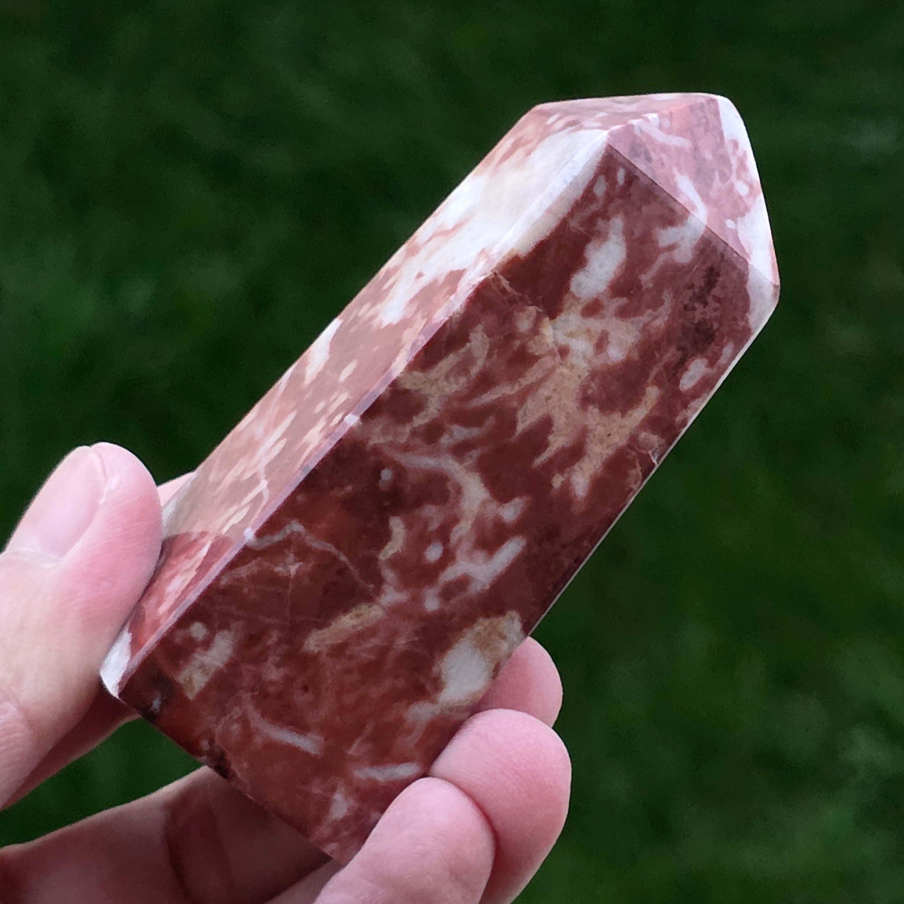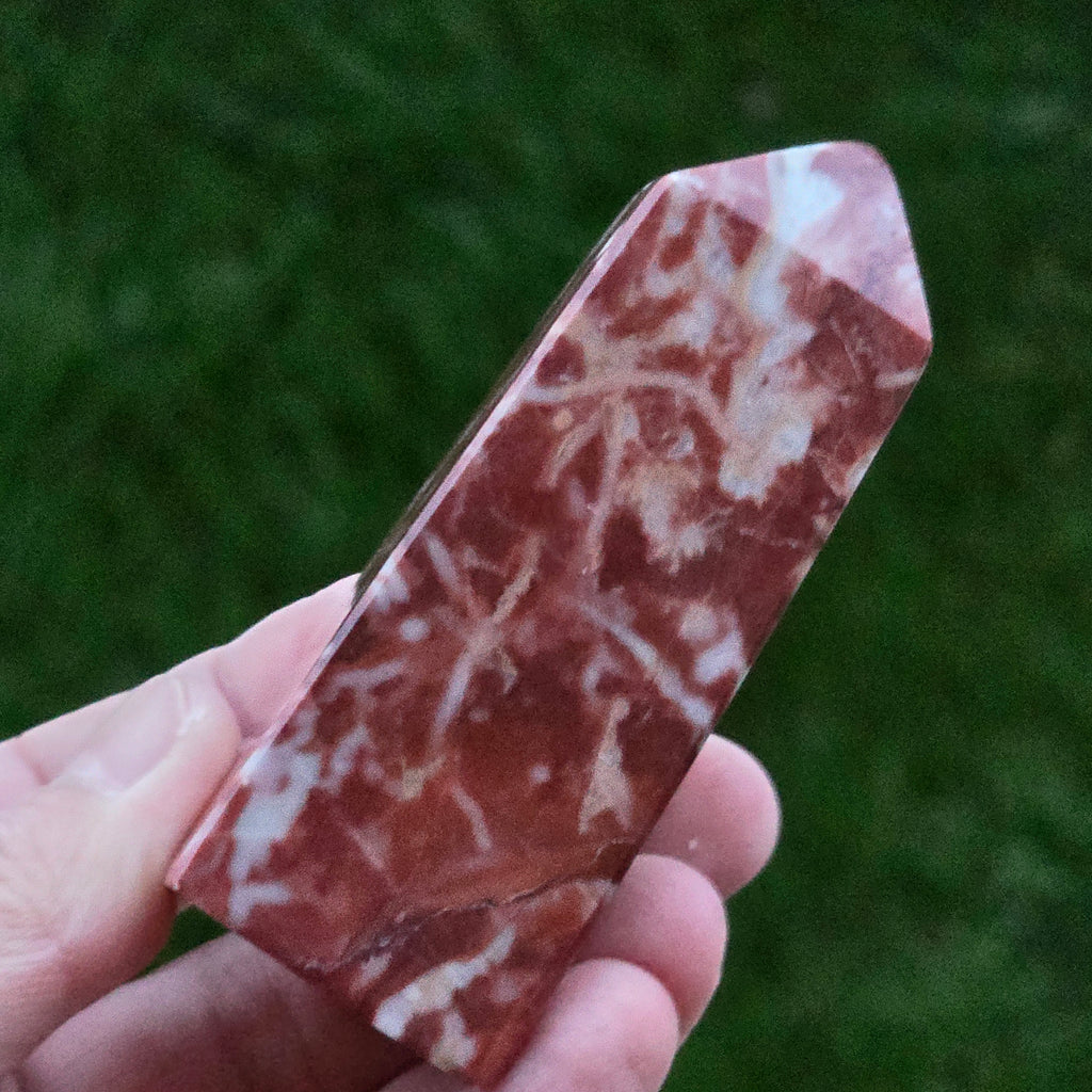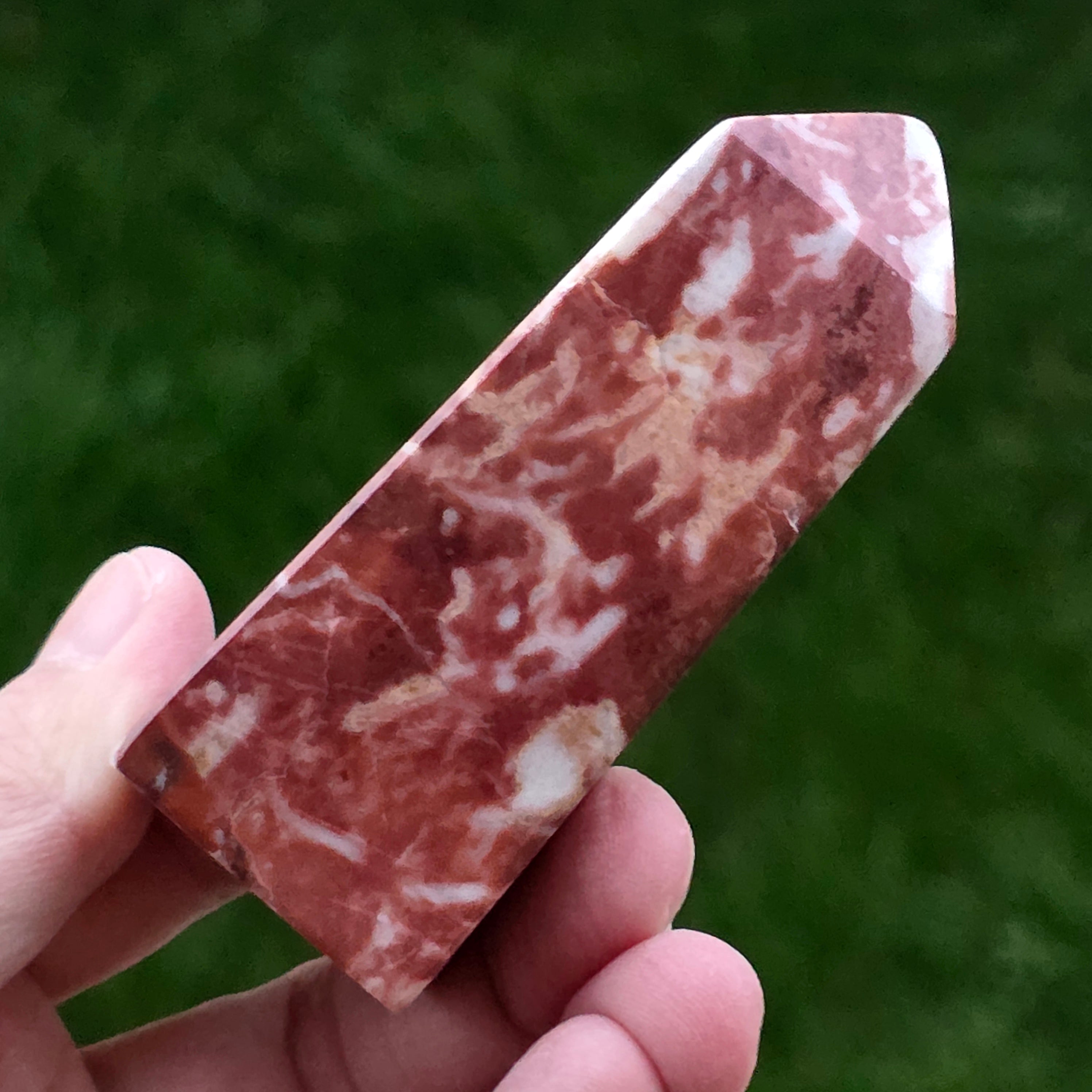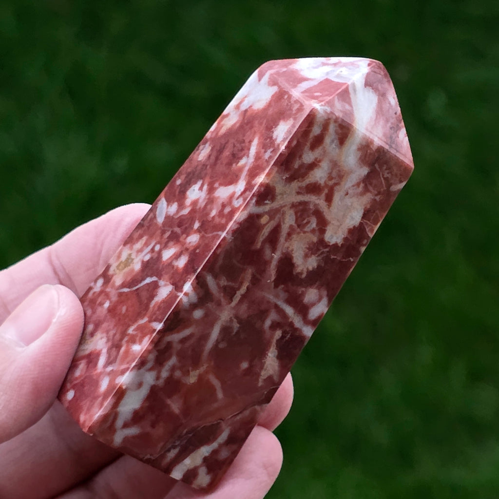 Obeliscul din Jasp Strawberry este o piesă plină de vitalitate, sculptată cu atenție pentru a evidenția nuanțele bogate de roșu căpșună și texturile naturale caracteristice acestui tip de jasp. Fiecare obelisc este unic, cu modele organice ce amintesc de roci sedimentare antice și straturi minerale formate într-un ritm geologic lent.