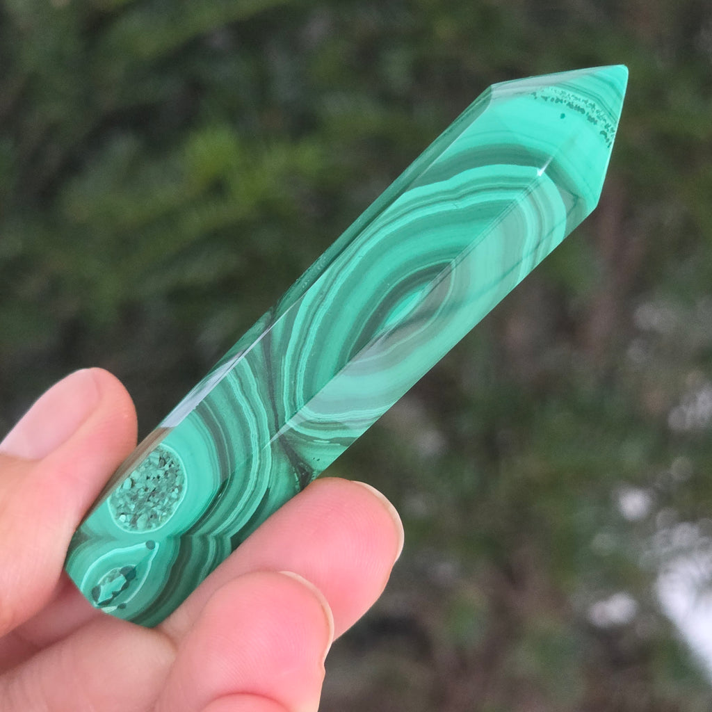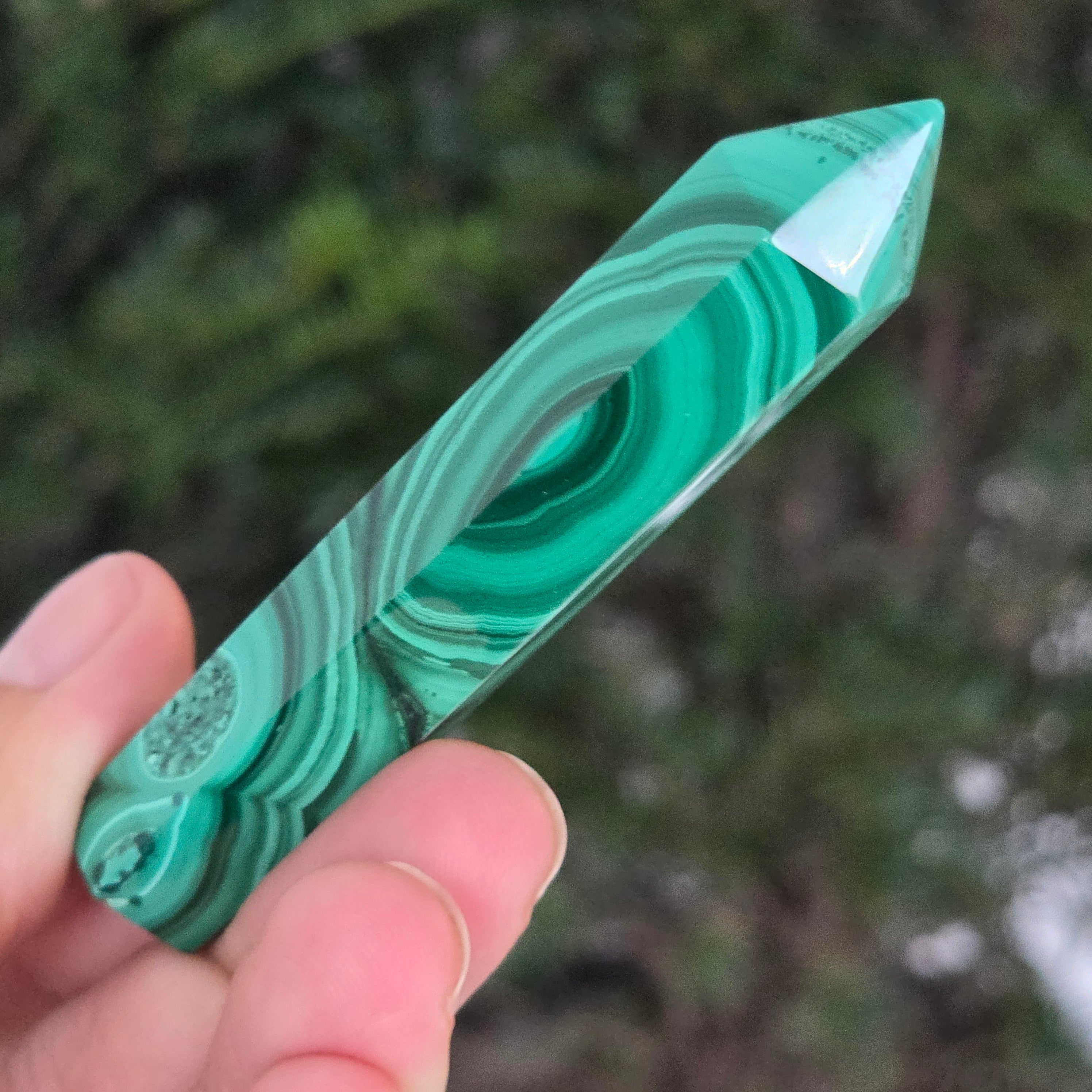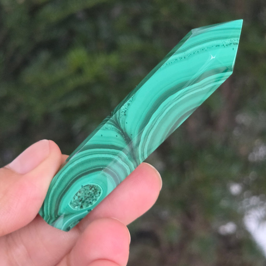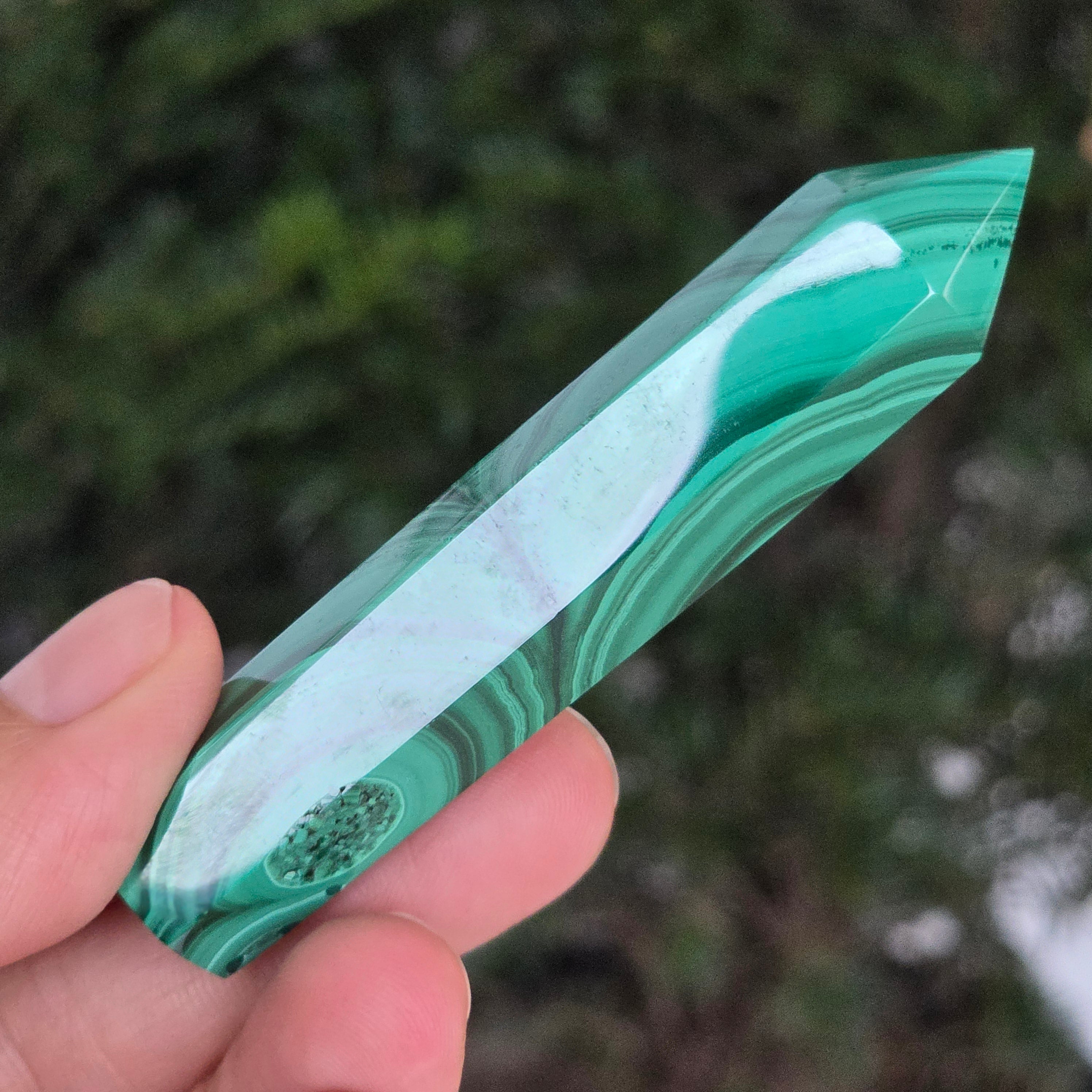 Un obelisc ce pare să fi prins viață din adâncurile verzi ale planetei. Această piesă unicat din malachit natural, dezvăluie straturi fascinante de verde smarald, verde închis și nuanțe mătăsoase de jad, dispuse în modele concentrice unice, ca niște hărți ale energiilor interioare. Polişat manual până la o strălucire catifelată, obeliscul emană o eleganță minerală profundă.