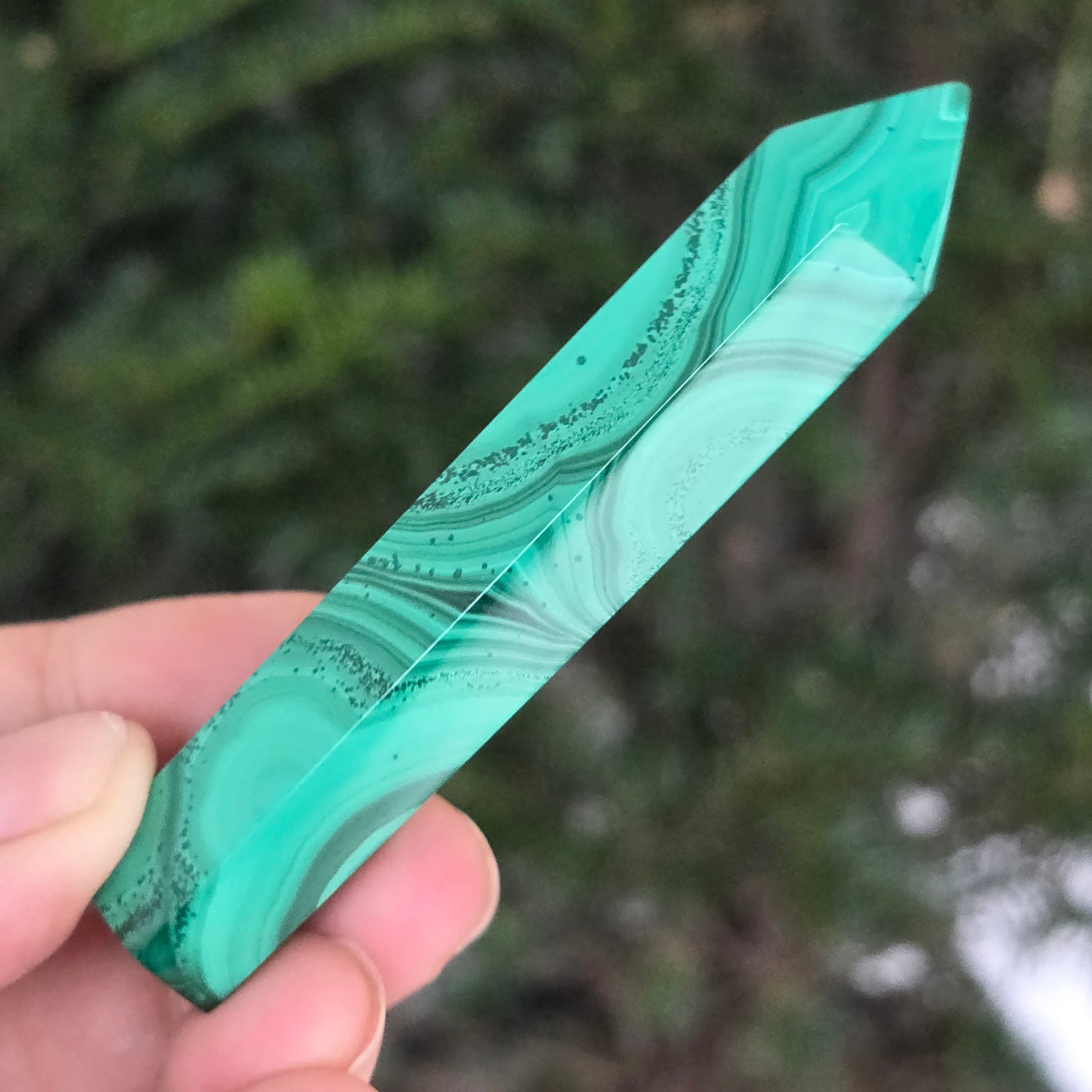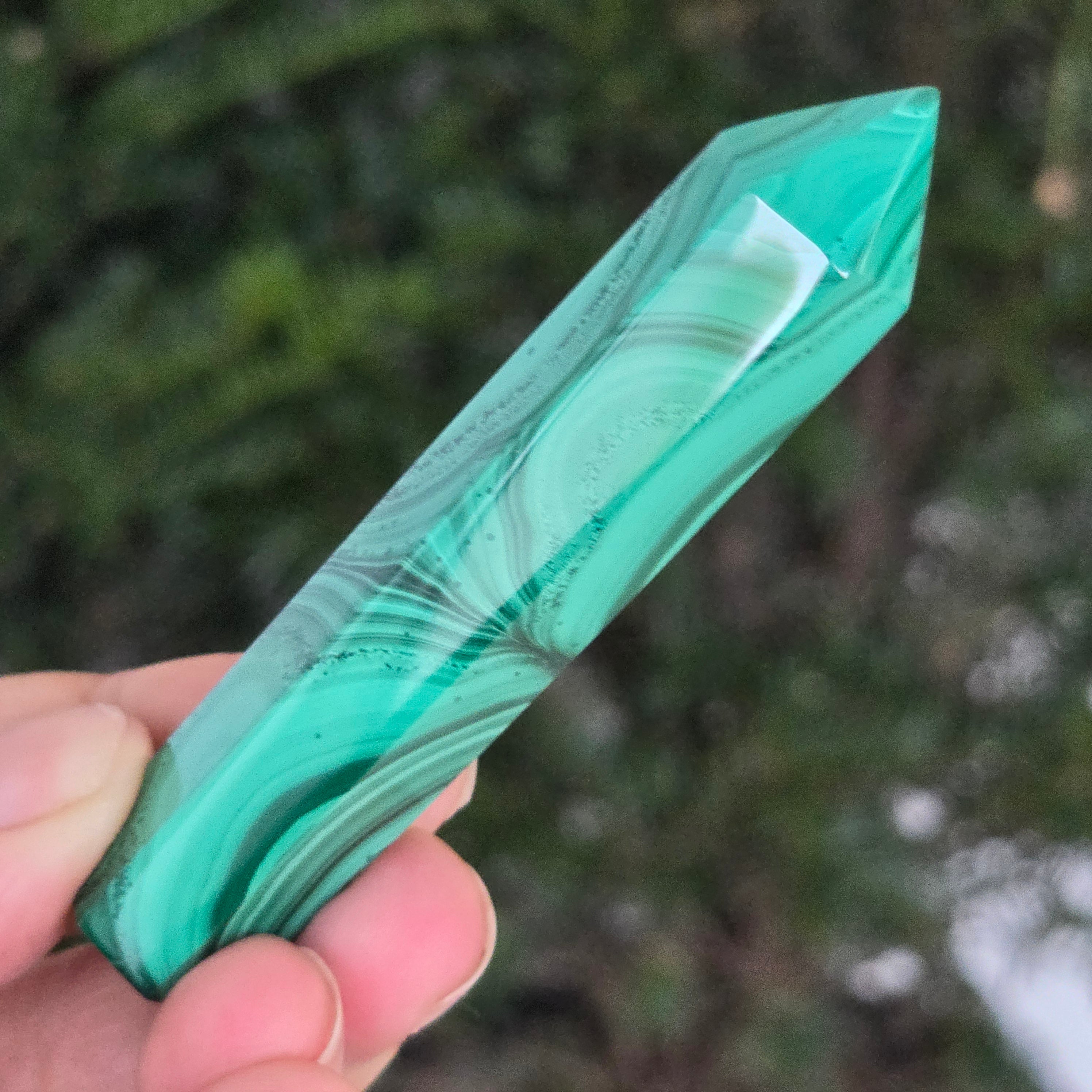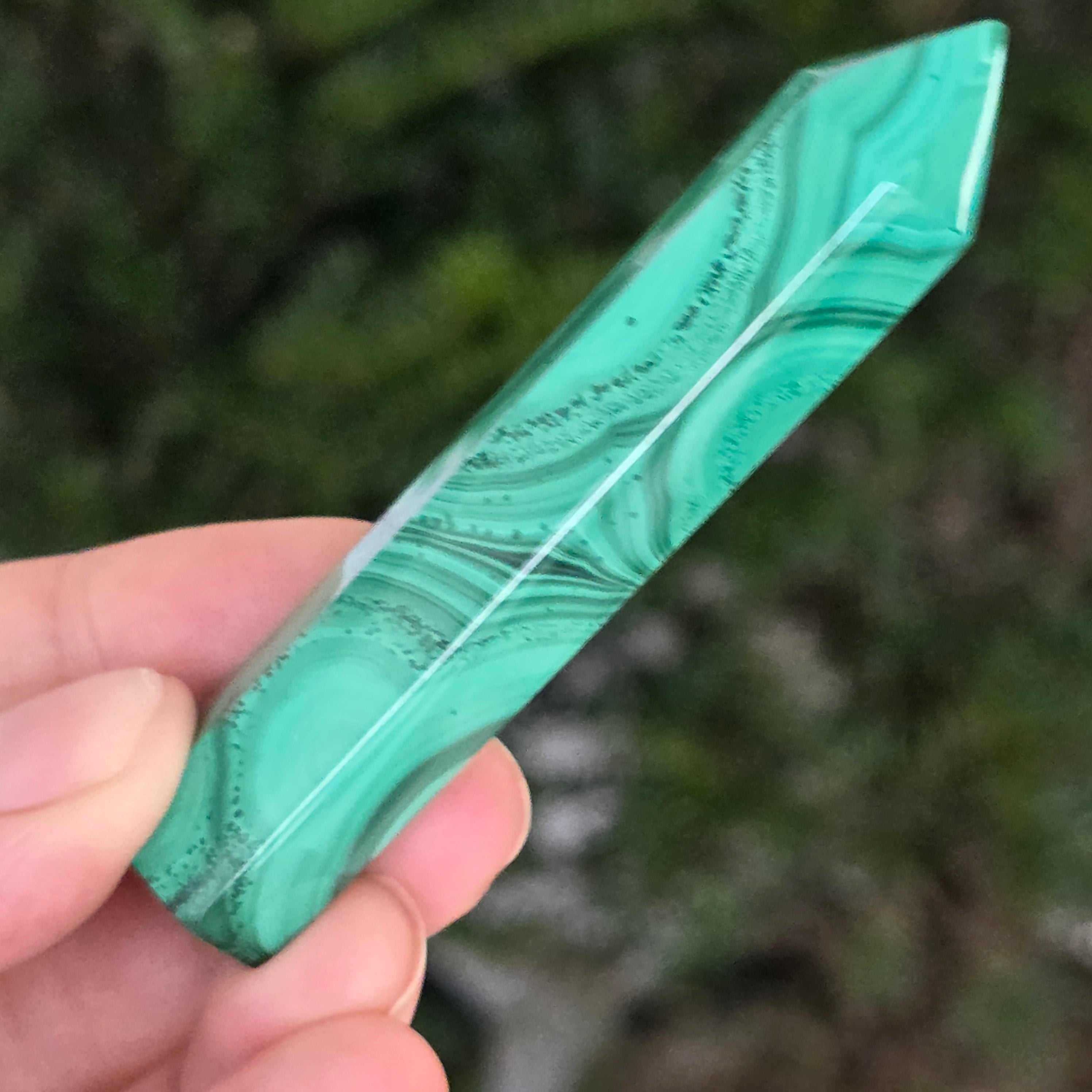 Un obelisc ce pare să fi prins viață din adâncurile verzi ale planetei. Această piesă unicat din malachit natural, dezvăluie straturi fascinante de verde smarald, verde închis și nuanțe mătăsoase de jad, dispuse în modele concentrice unice, ca niște hărți ale energiilor interioare. Polişat manual până la o strălucire catifelată, obeliscul emană o eleganță minerală profundă.