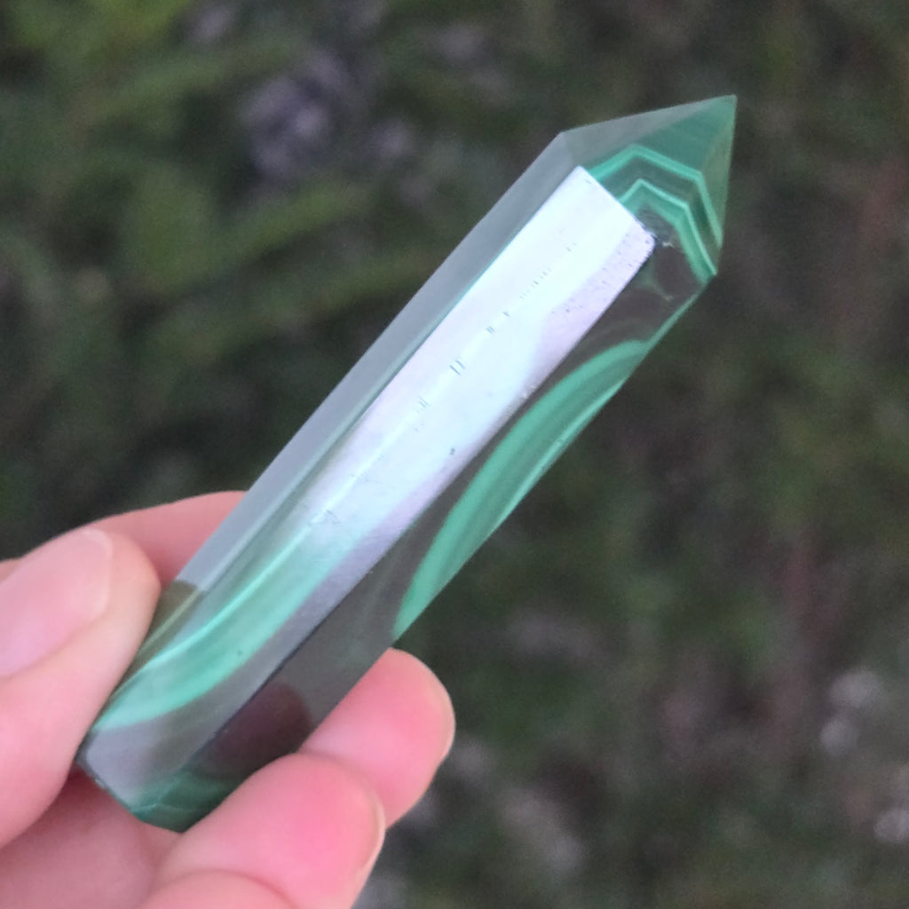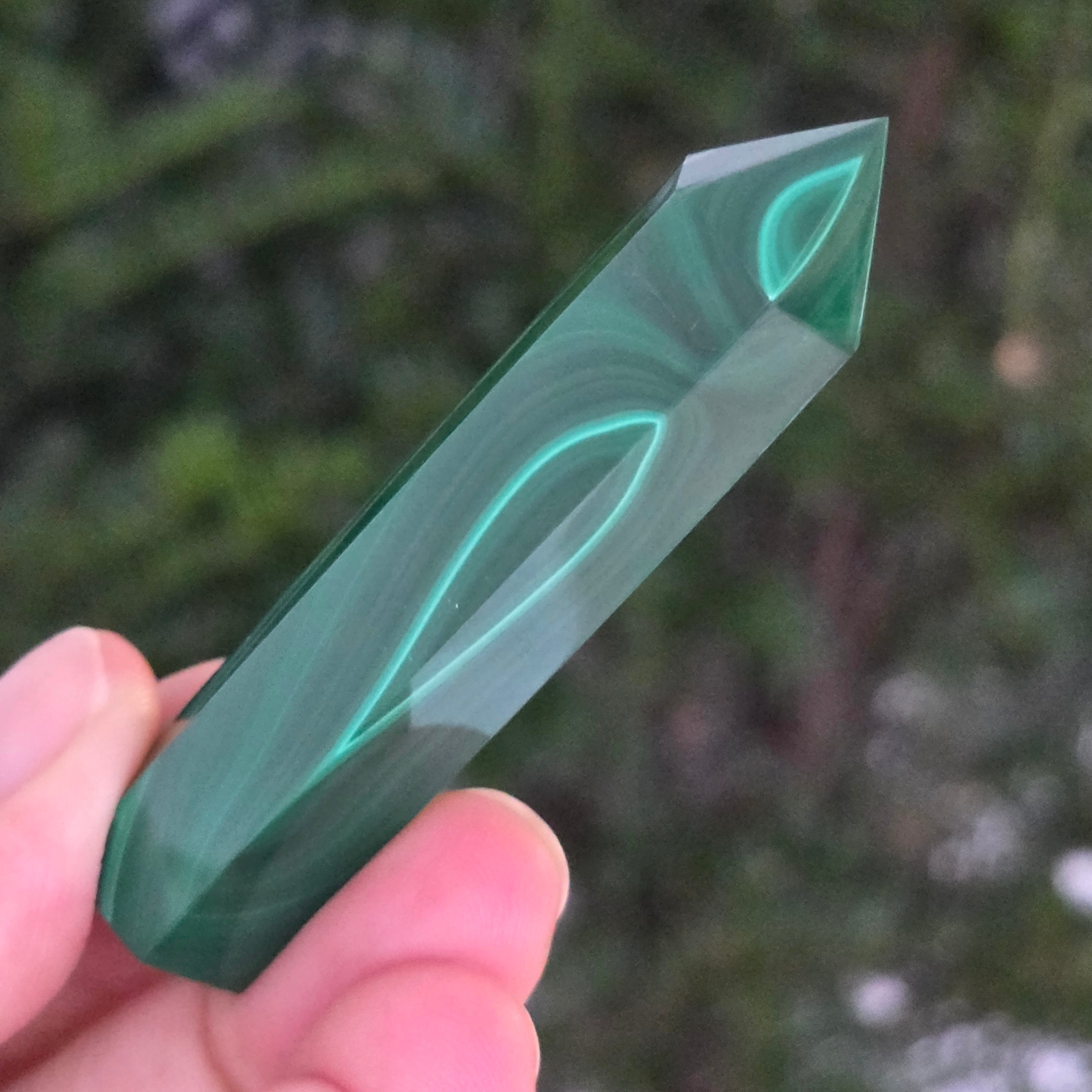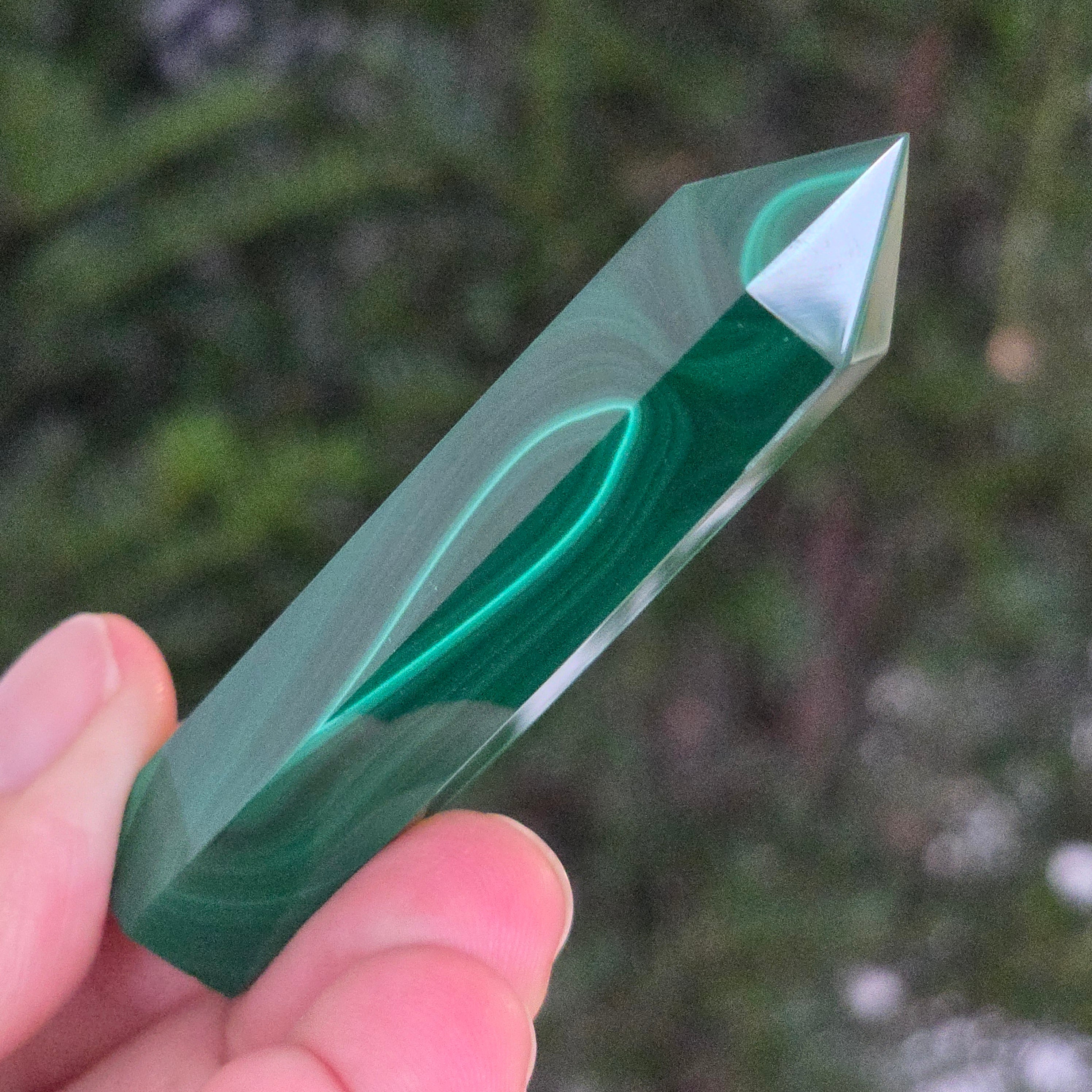 Un obelisc ce pare să fi prins viață din adâncurile verzi ale planetei. Această piesă unicat din malachit natural, dezvăluie straturi fascinante de verde smarald, verde închis și nuanțe mătăsoase de jad, dispuse în modele concentrice unice, ca niște hărți ale energiilor interioare. Polişat manual până la o strălucire catifelată, obeliscul emană o eleganță minerală profundă.
