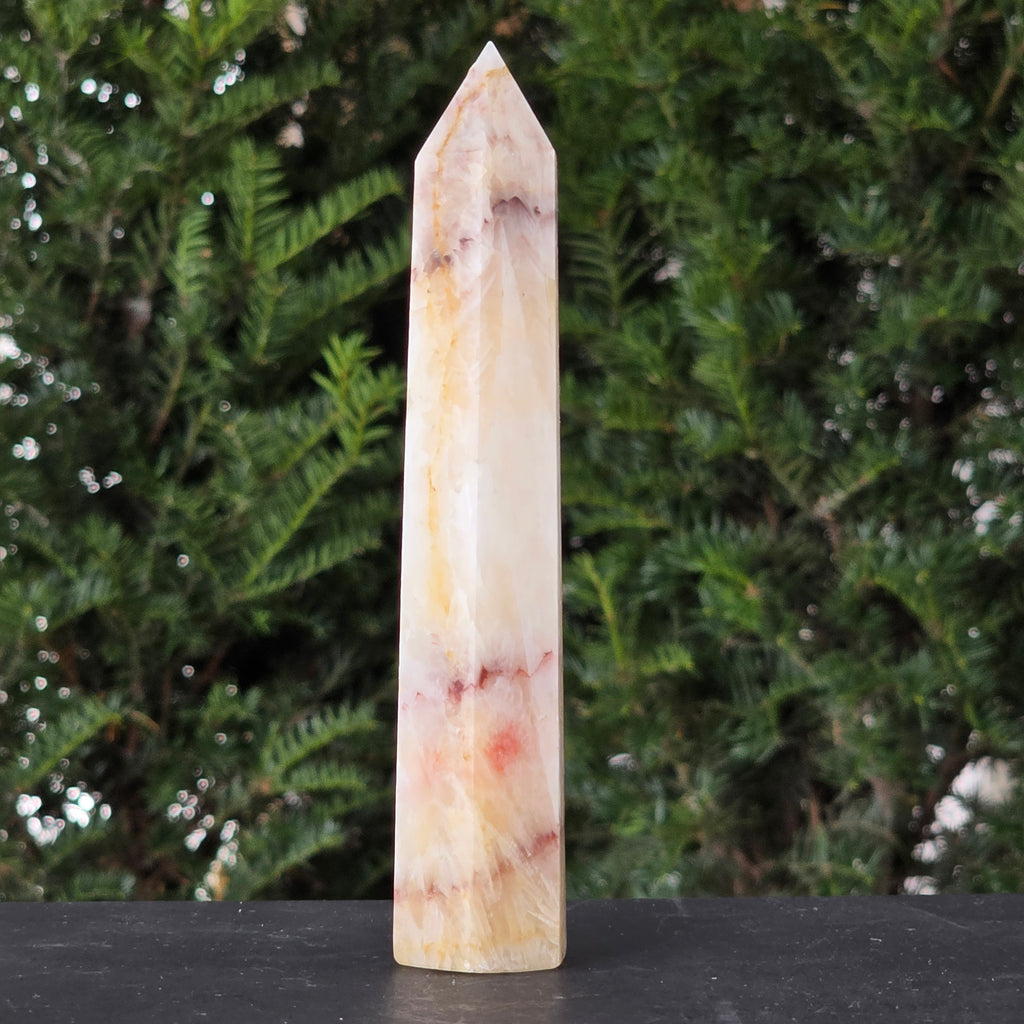 Această piatră fascinantă îmbină onixul portocaliu cu vene delicate de calcit, în straturi care par pictate de timp. Nuanțele vibrante de portocaliu, miere și chihlimbar pulsează cu energia vieții și aduc o notă de vitalitate oricărui spațiu. Este o piesă care trezește simțurile și inspiră creativitatea, dar păstrează în același timp un echilibru profund, ancorat în energia pământului.
