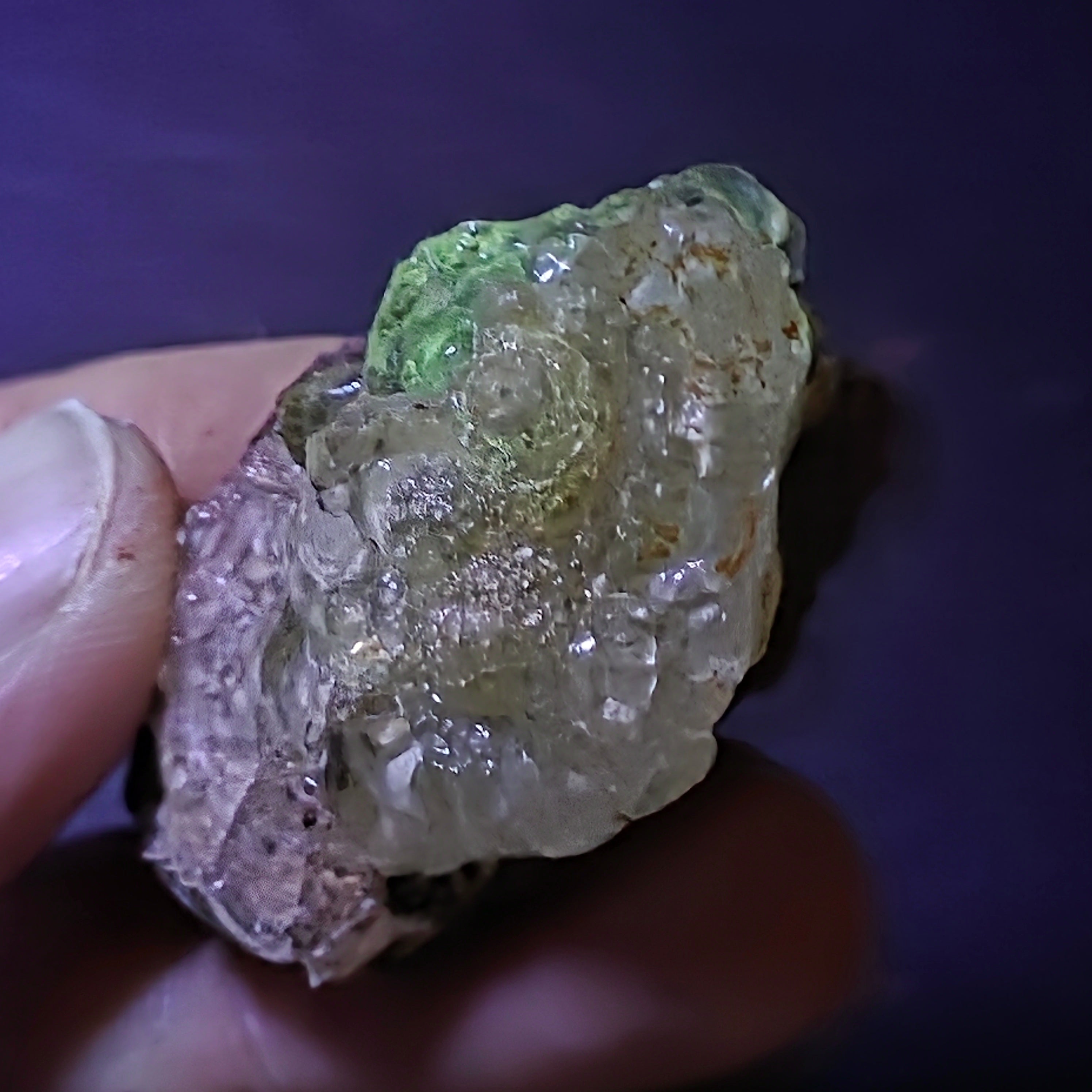 În lumină naturală, opalul hialit apare incolor până la alb-translucid, cu un aspect discret și elegant. Sub lumină ultravioletă însă, mineralul se transformă complet, emițând o strălucire verde neon, puternică și uniformă, efect care îl face extrem de căutat de colecționari. Această fluorescență se datorează urmelor naturale de uraniu din structura sa, prezente în cantități foarte mici și stabile.