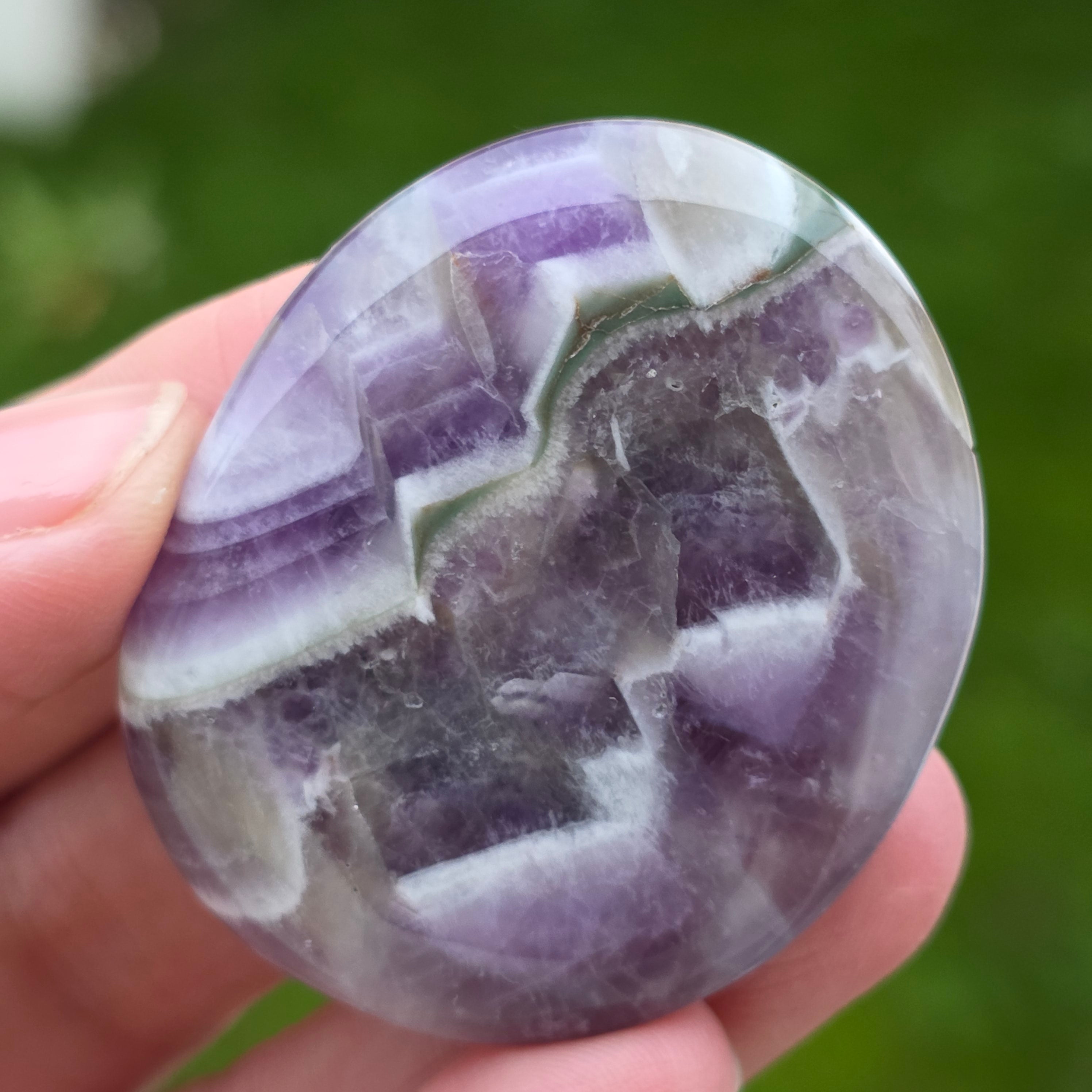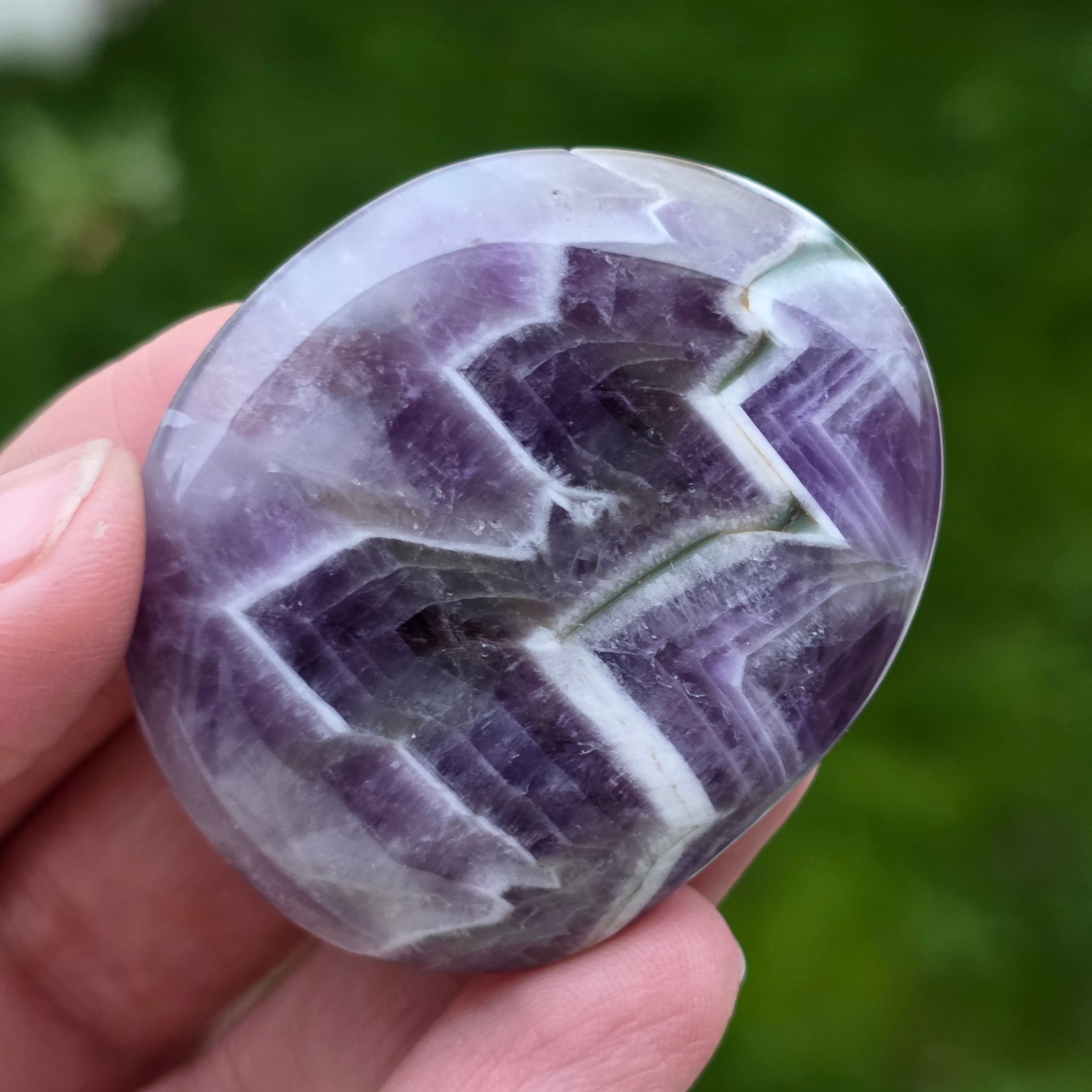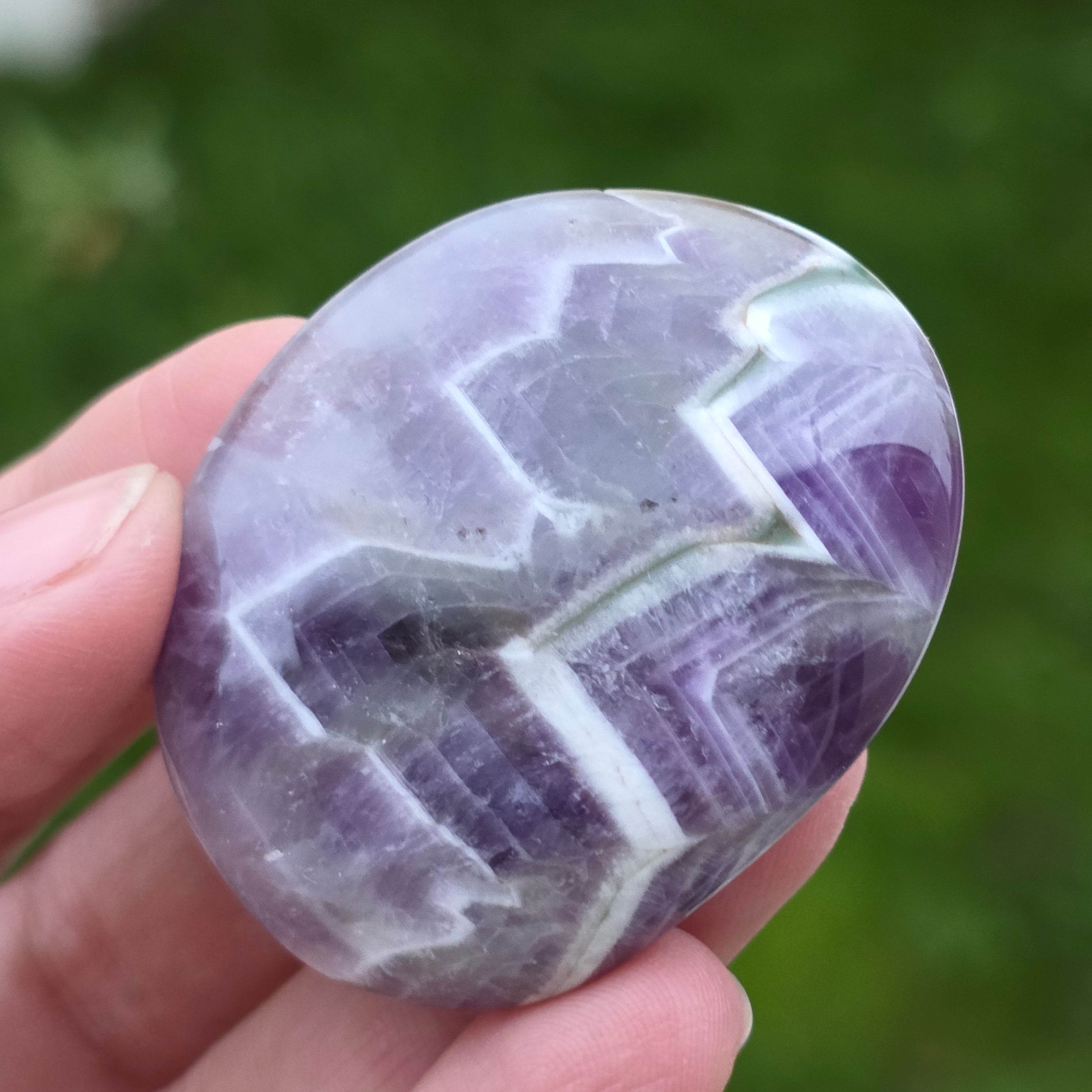 Chevron-Amethyst ist bekannt für seine Assoziationen mit dem Kronenchakra und dem dritten Augenchakra, wodurch die Intuition und die Fähigkeit, Entscheidungen zu treffen, gesteigert werden.