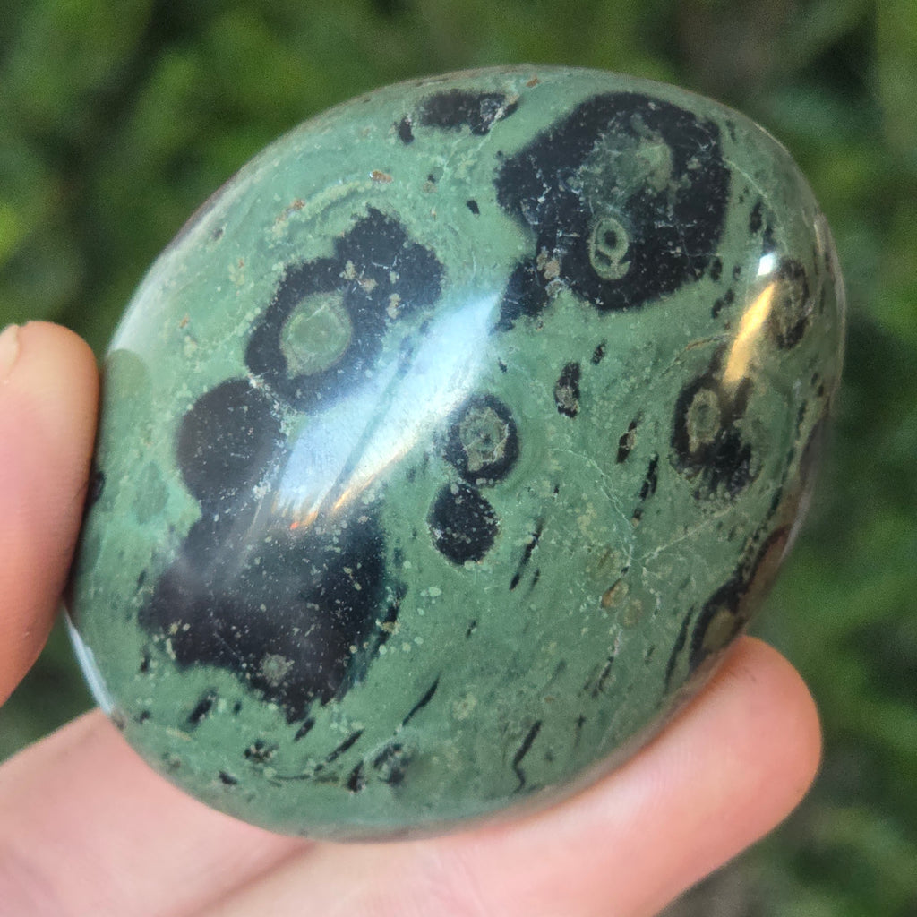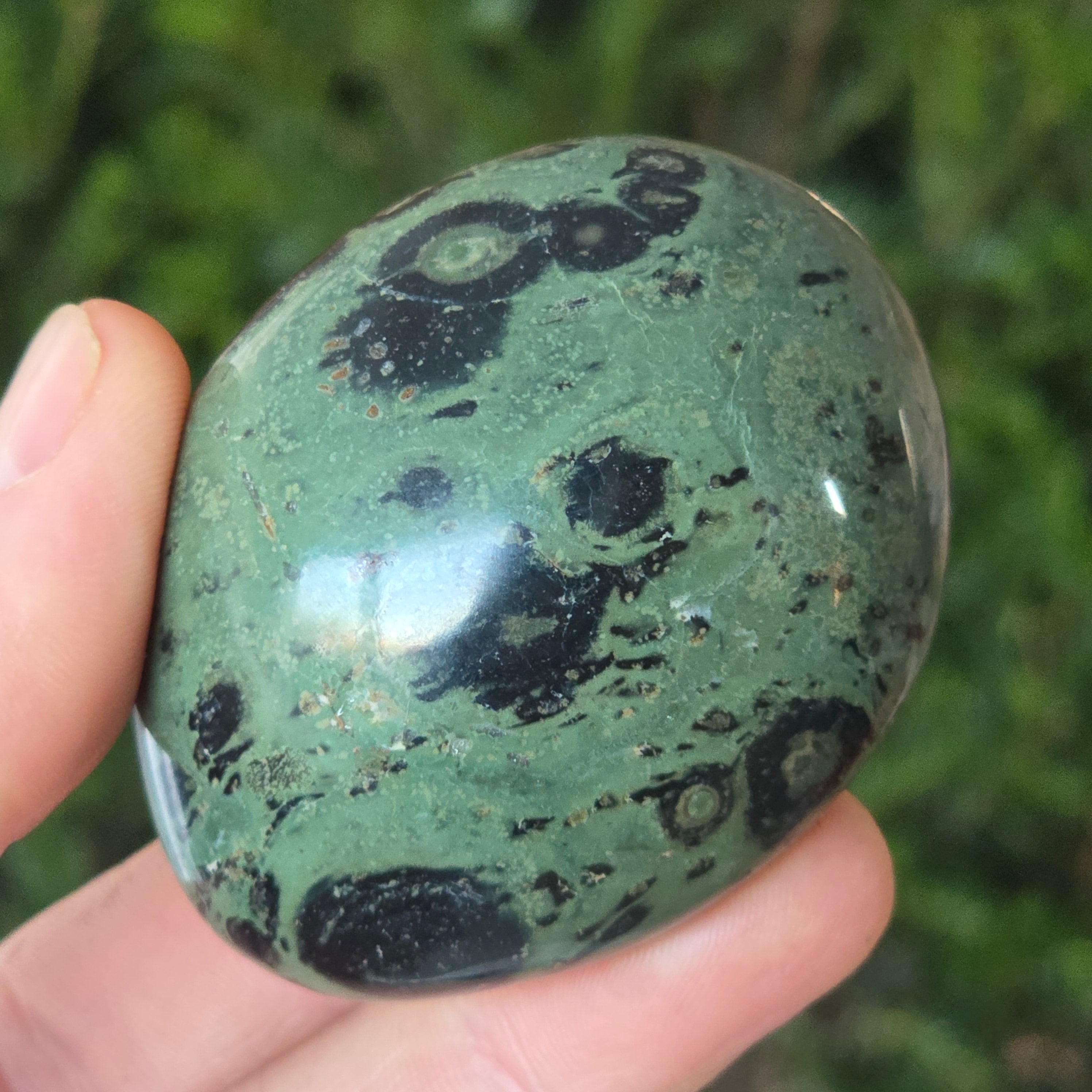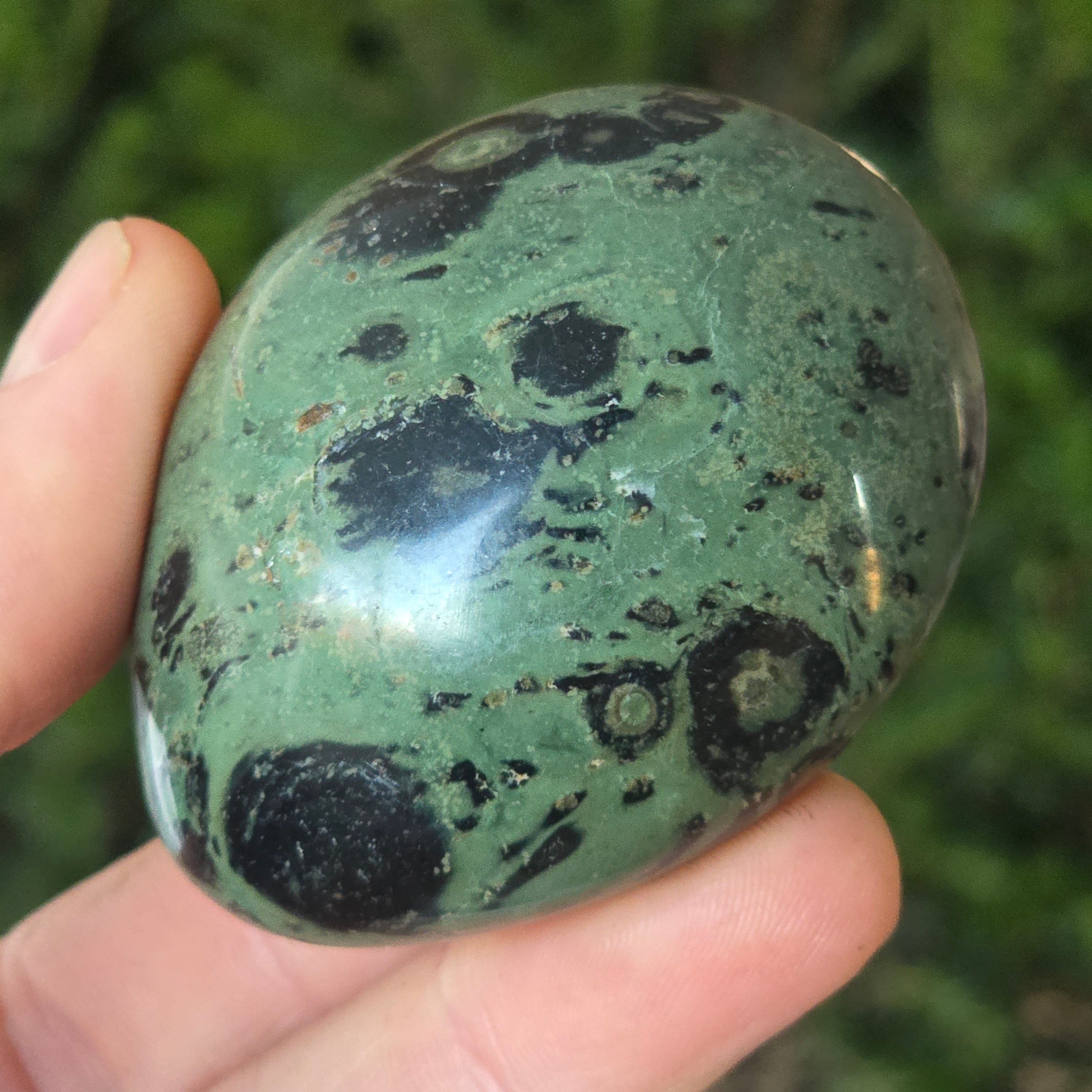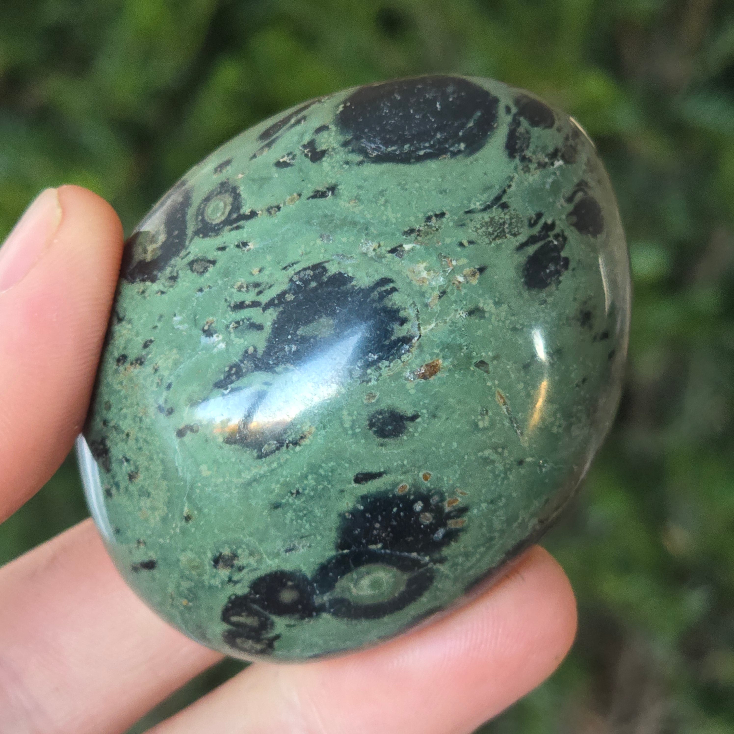 Kambaba Jaspis, auch bekannt als Jaspis Kambala, ist eine Jaspissorte vulkanischen Ursprungs. Es besteht aus einer Kombination aus grünen und schwarzen Kristallen, die ein schönes und unverwechselbares Muster erzeugen. Er ist nach der Kambaba-Region auf Madagaskar benannt, wo er häufig vorkommt.