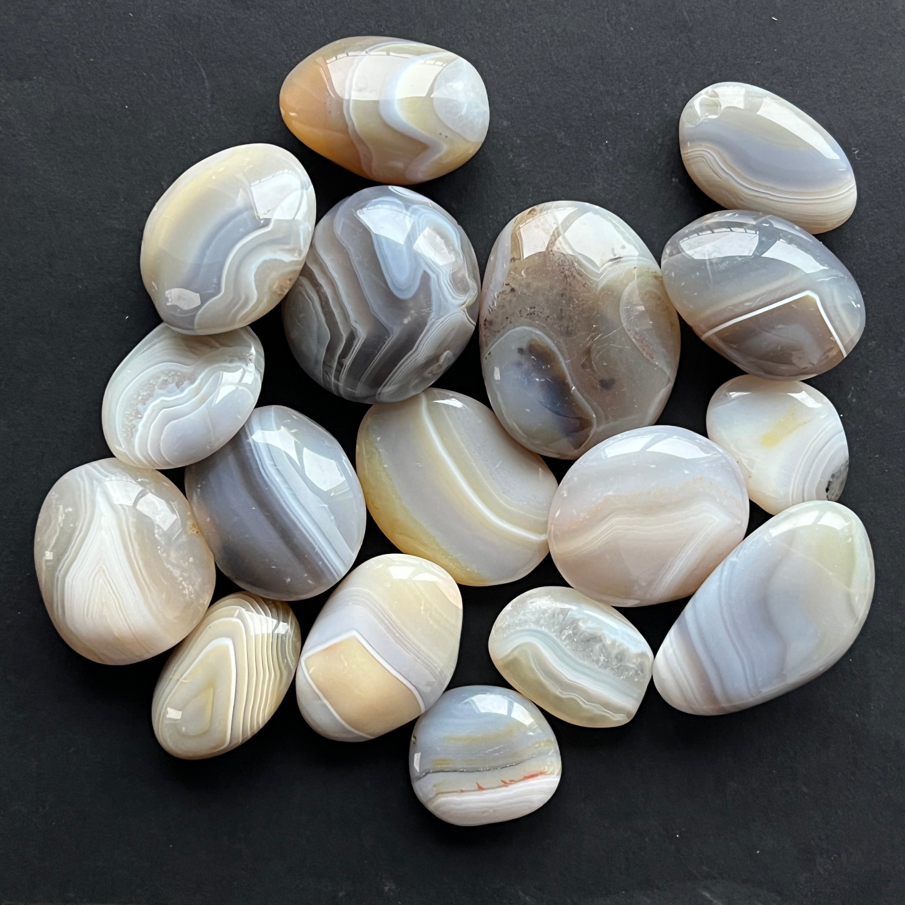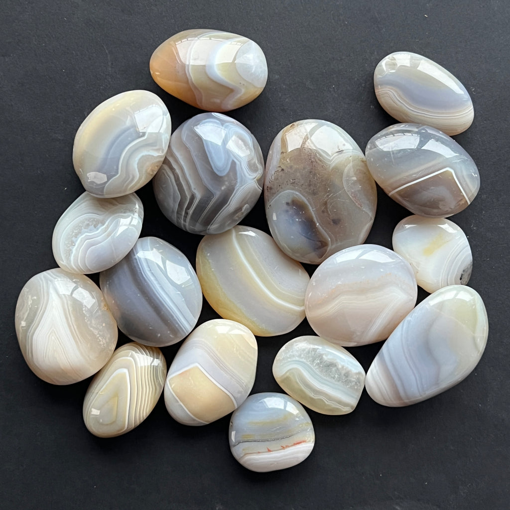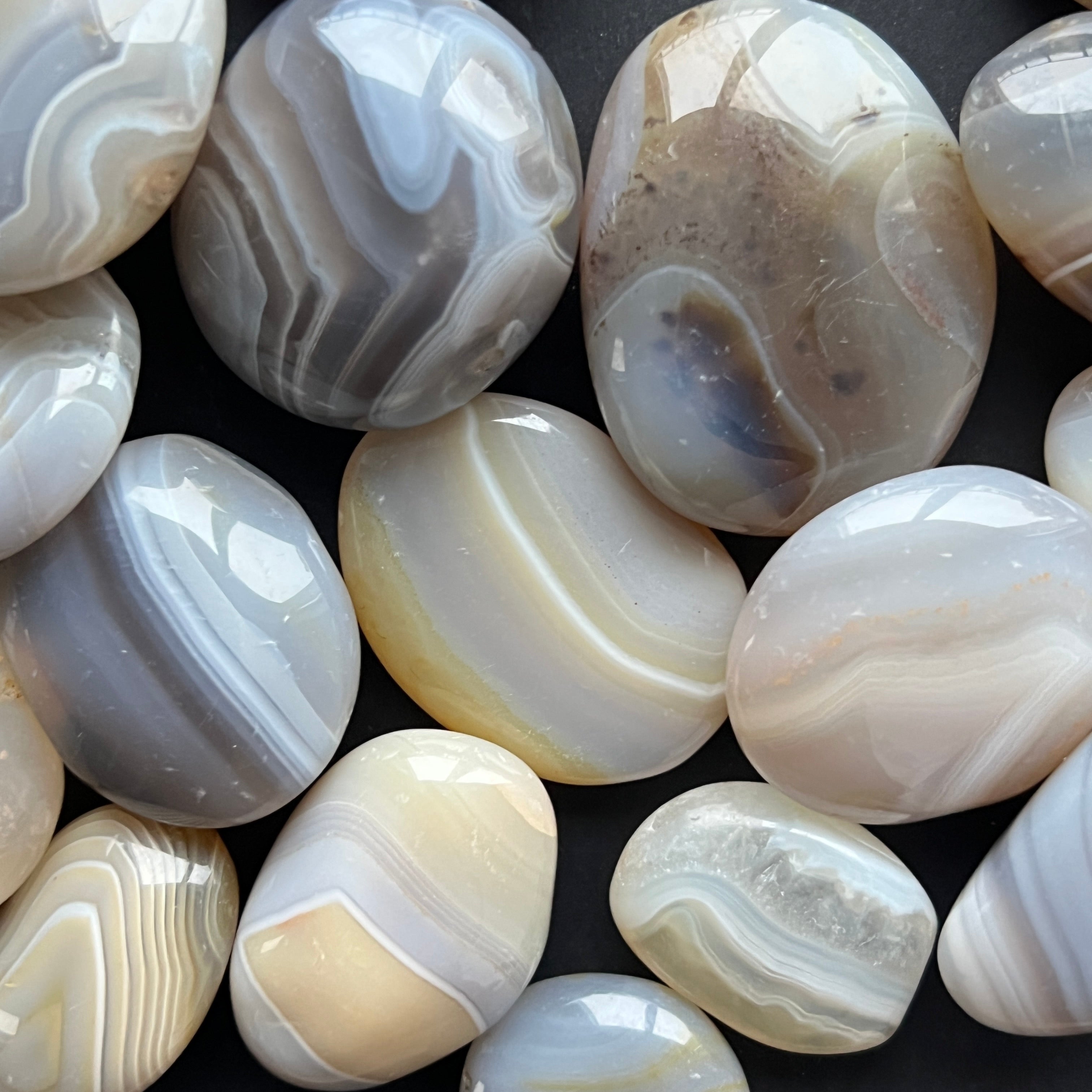 Agatul gri este o piatră a liniștii profunde și a stabilității, o invitație la împământare și calm. Tonurile sale subtile de gri, cu dungi translucide și reflexe sidefii, aduc aminte de norii liniștiți ai dimineții — un simbol al neutralității și al echilibrului.