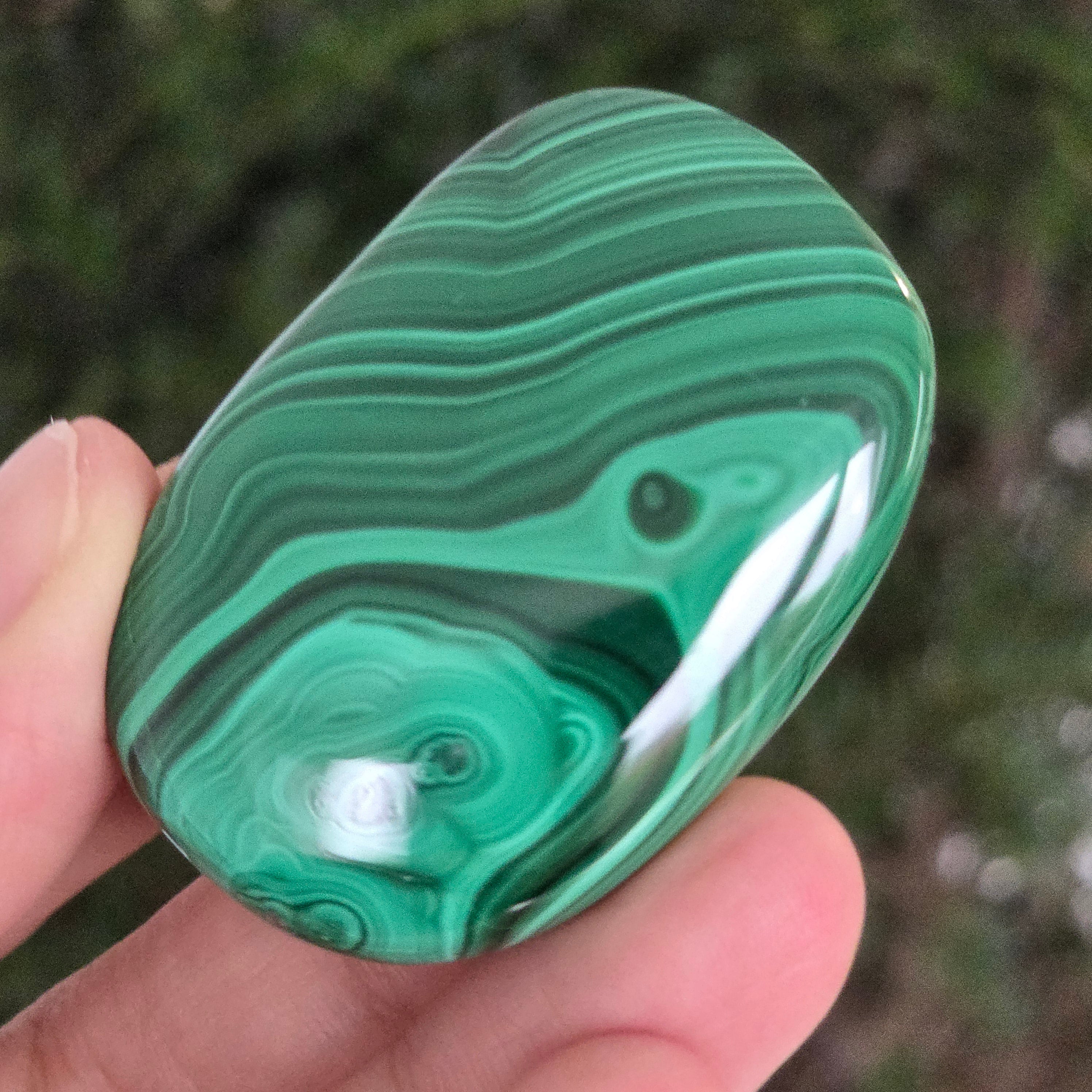 Un palmstone care pare să respire cu energia Pământului viu. Această piesă unicat din malachit natural, dezvăluie ondulații hipnotice de verde intens și smarald, traversate de inele și benzi concentrice ce par sculptate de însăși natura. Textura netedă, perfect șlefuită, face ca piatra să se așeze plăcut în palmă, emanând o vibrație caldă și protectoare.