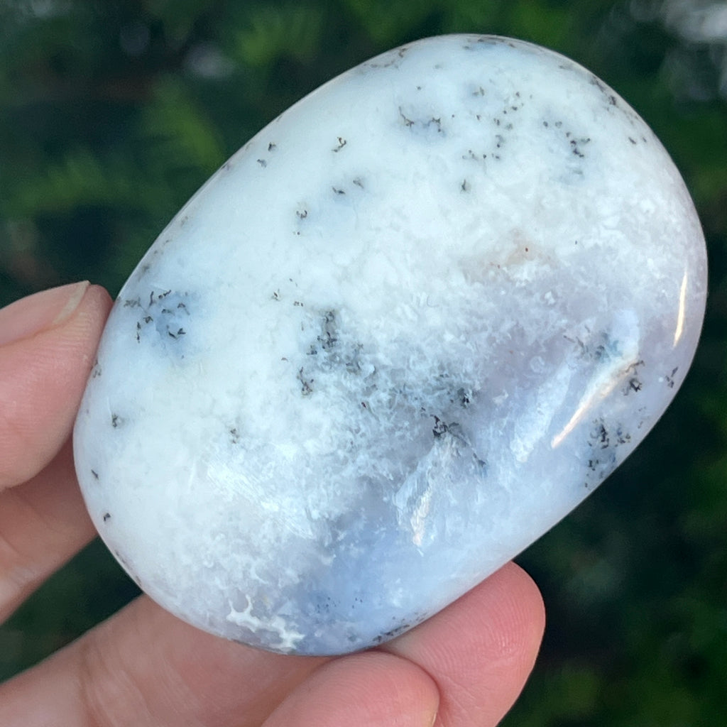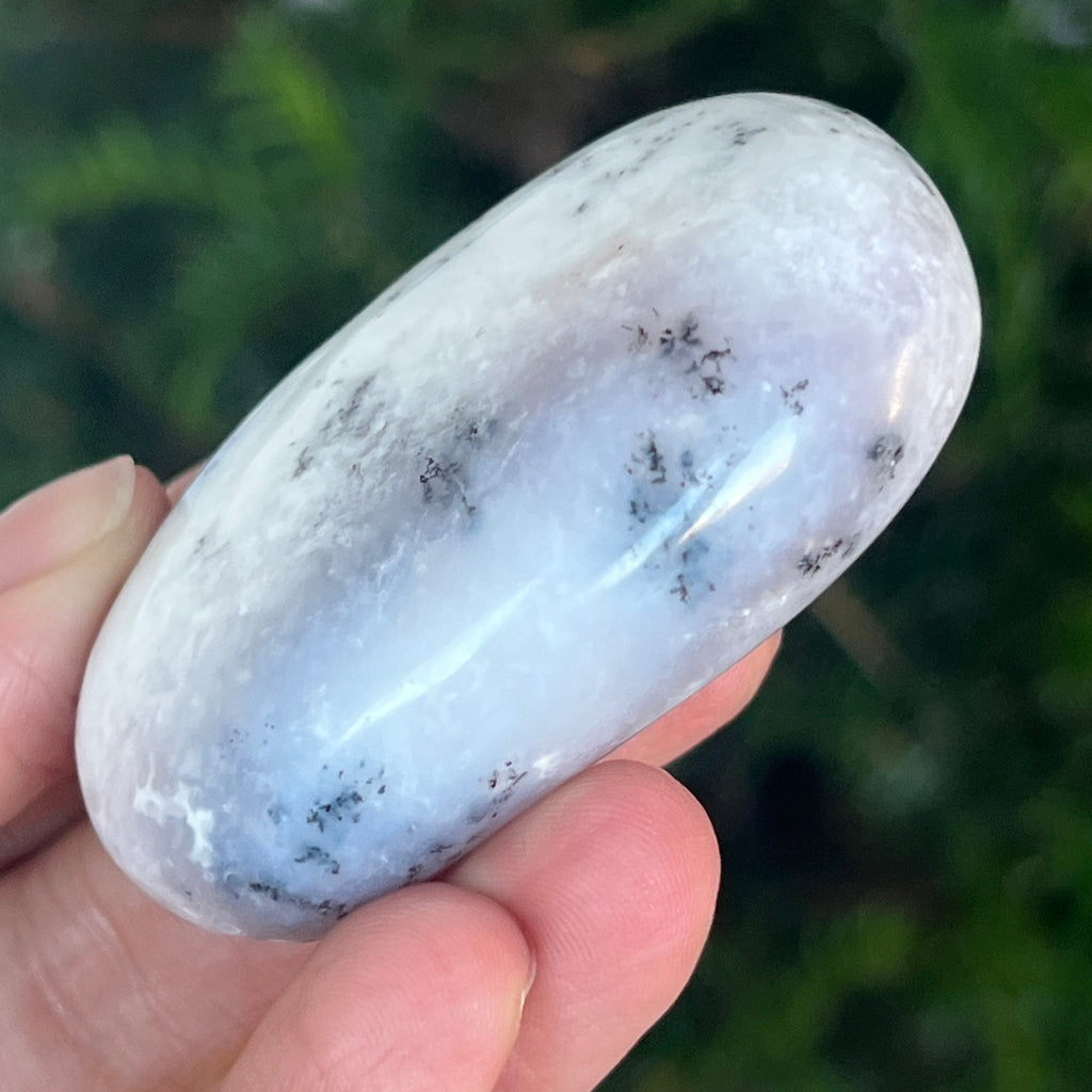 Acest palmstone din opal alb dendritic aduce o stare de pace și o ușoară expansiune a conștiinței. Ideal pentru meditație, pentru momente de reflecție sau pentru a fi păstrat ca piesă decorativă într-un spațiu sacru, el emană o frumusețe pură și organică, un echilibru între lumina albă și umbrele subtile ale naturii.