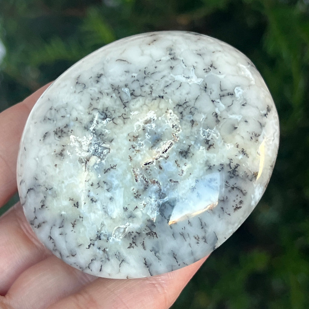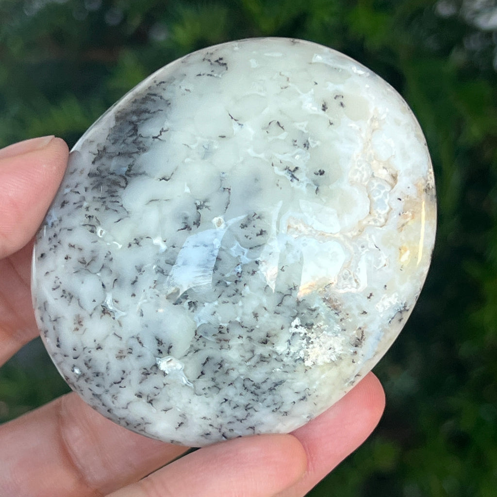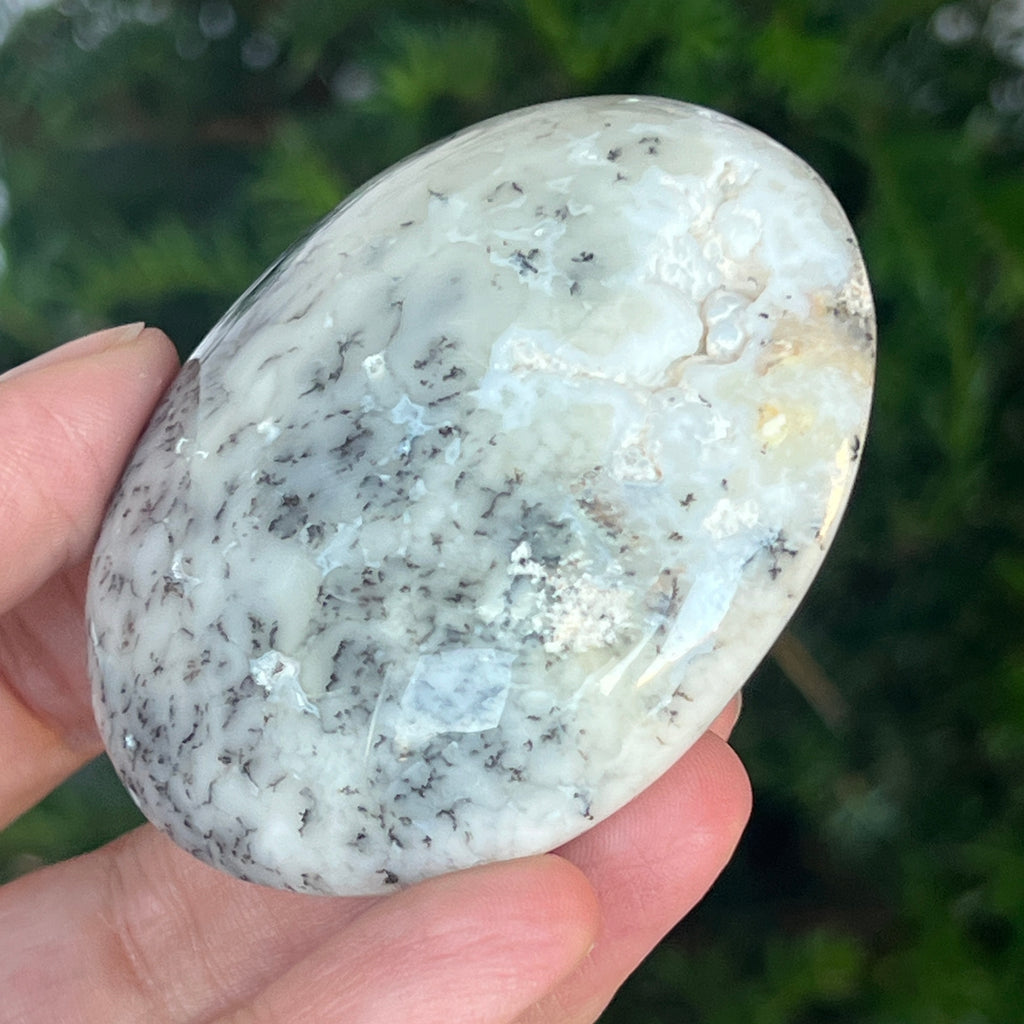 Acest palmstone din opal alb dendritic aduce o stare de pace și o ușoară expansiune a conștiinței. Ideal pentru meditație, pentru momente de reflecție sau pentru a fi păstrat ca piesă decorativă într-un spațiu sacru, el emană o frumusețe pură și organică, un echilibru între lumina albă și umbrele subtile ale naturii.