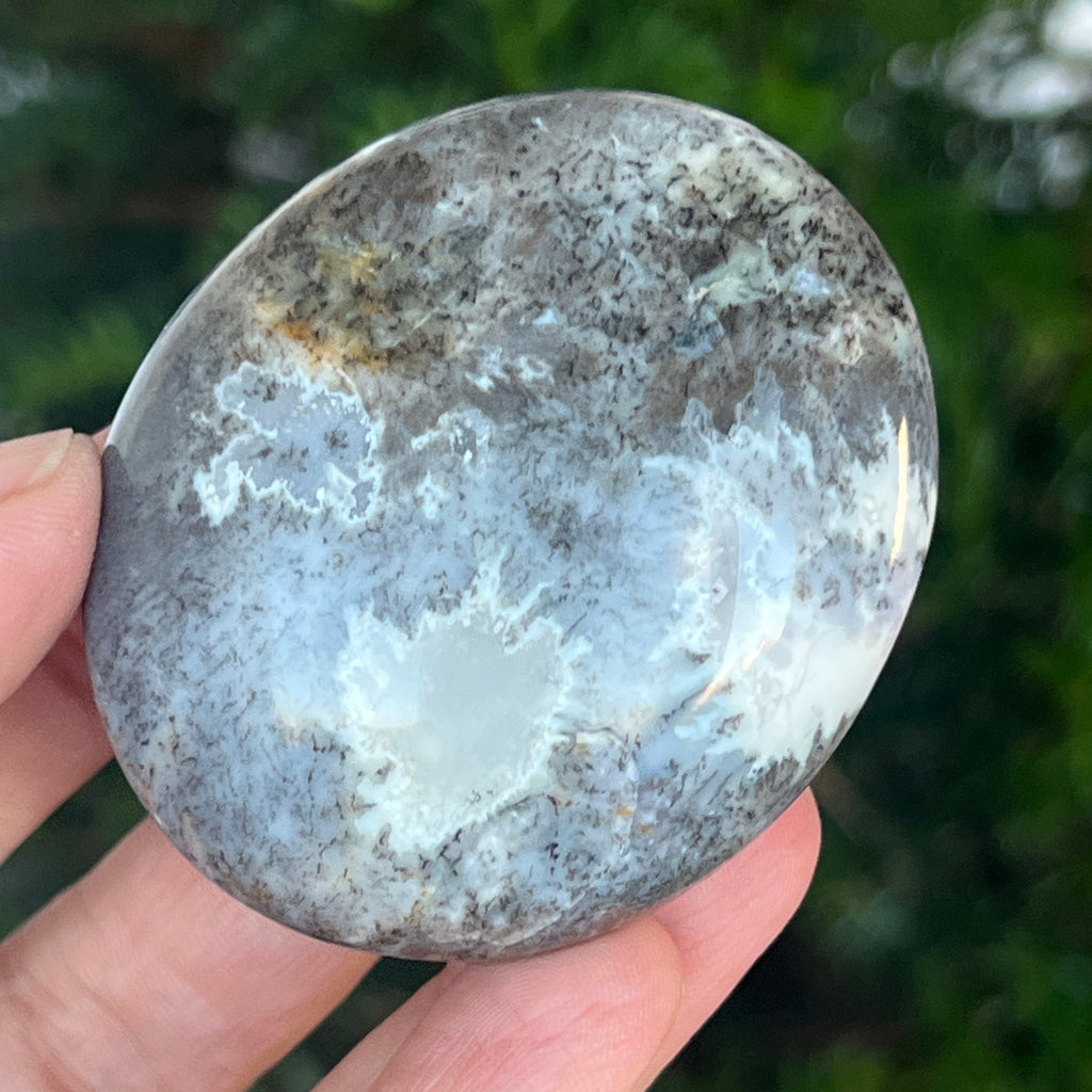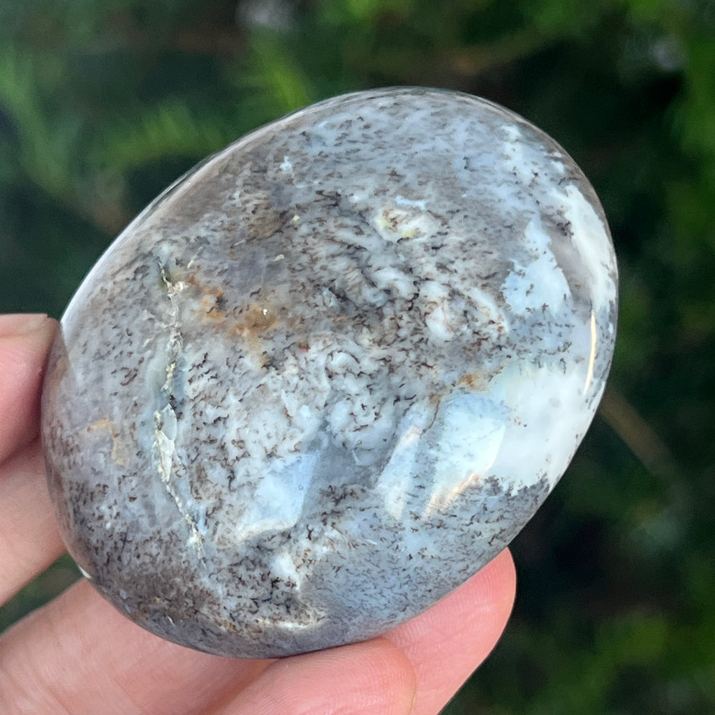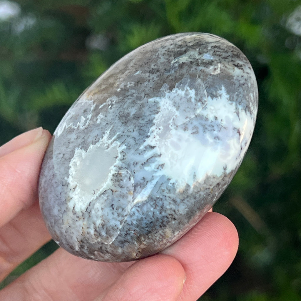 Acest palmstone din opal alb dendritic aduce o stare de pace și o ușoară expansiune a conștiinței. Ideal pentru meditație, pentru momente de reflecție sau pentru a fi păstrat ca piesă decorativă într-un spațiu sacru, el emană o frumusețe pură și organică, un echilibru între lumina albă și umbrele subtile ale naturii.