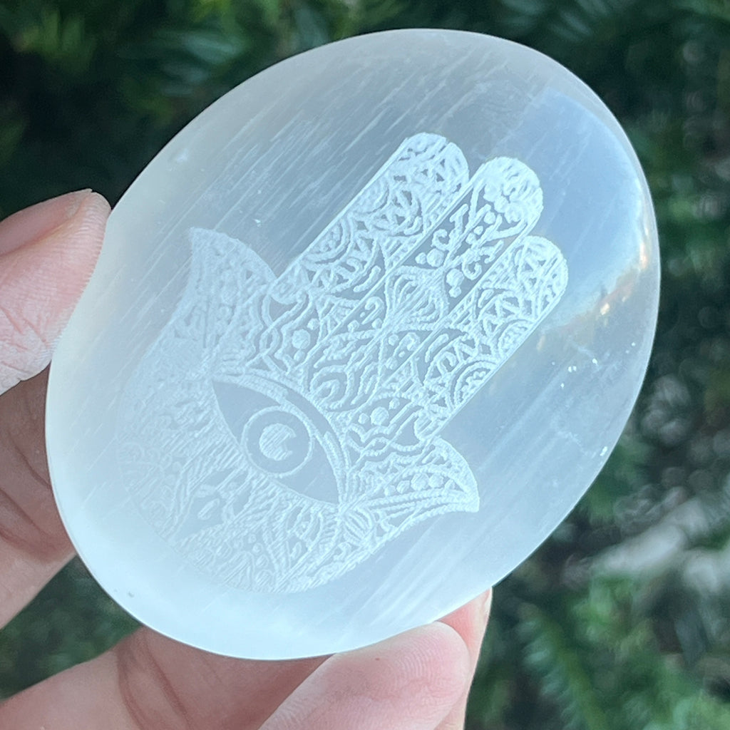 Simbolul Mâna Fatimei (Hamsa), gravat pe suprafața selenitului, este purtat de secole ca talisman împotriva energiilor negative și a privirilor invidioase. Reprezintă protecția divină, norocul și binecuvântarea, fiind un semn al luminii care alungă umbrele.