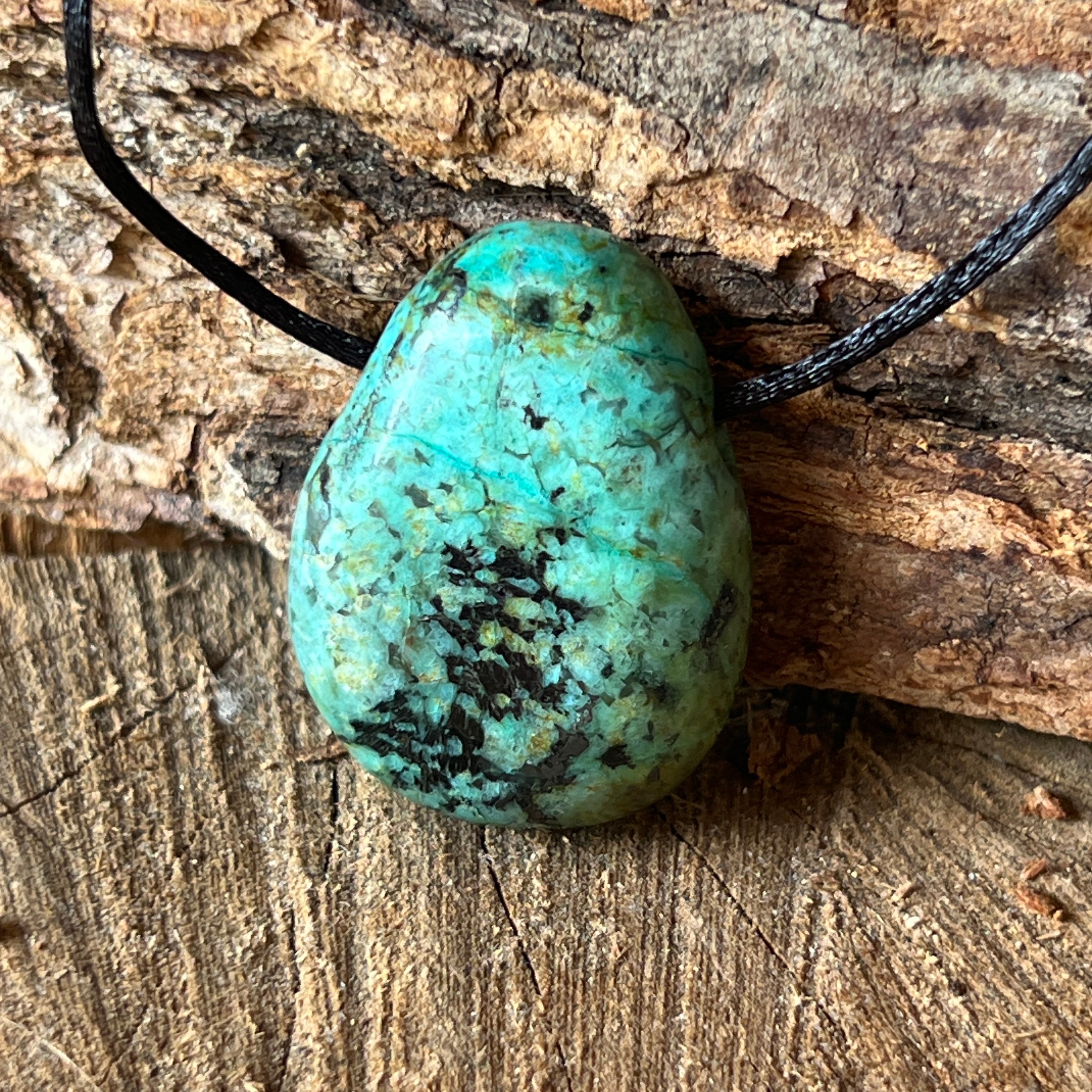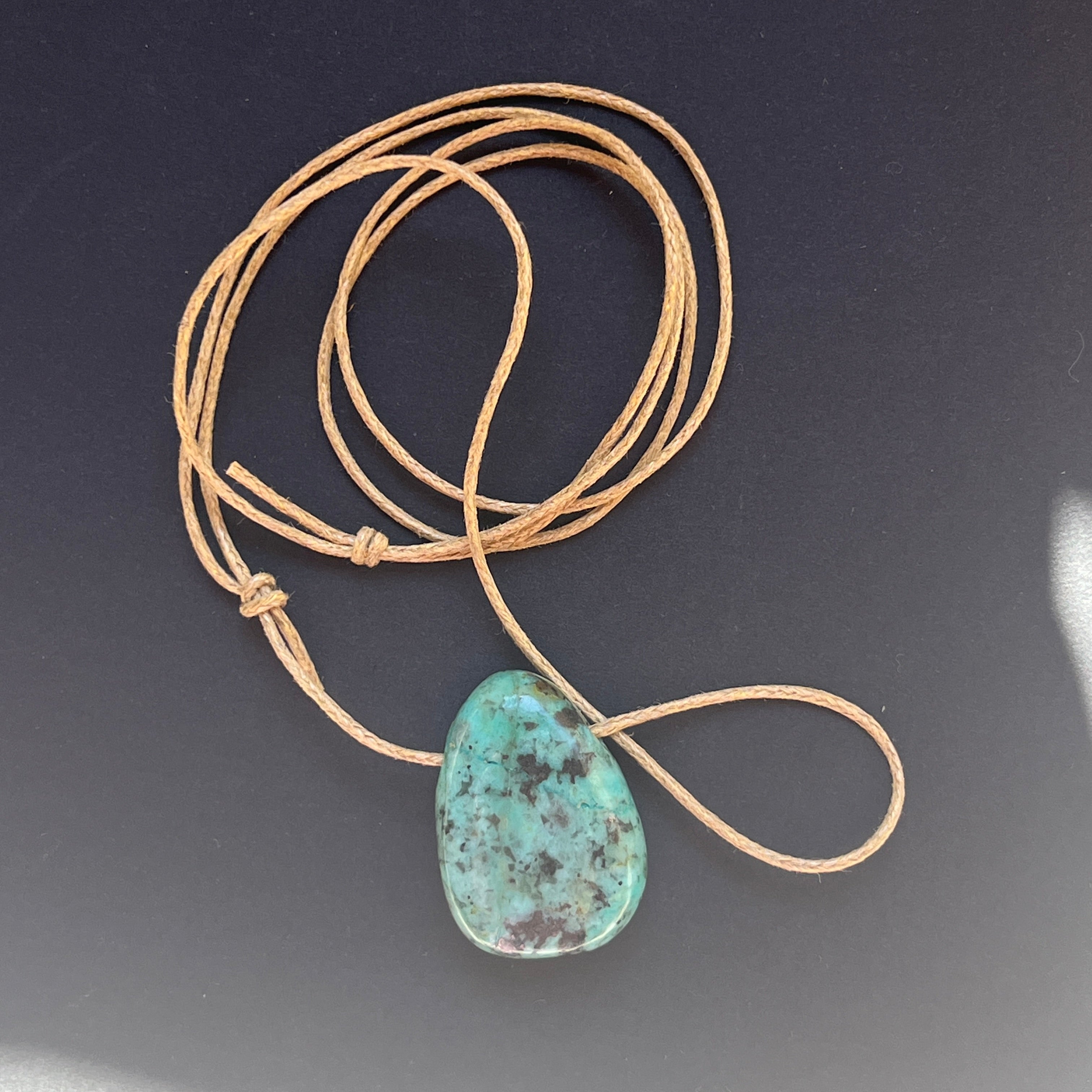 Der Anhänger mit afrikanischem Türkis trägt die Farben der Erde und des Himmels, die in einen Stammtanz verwoben ist.