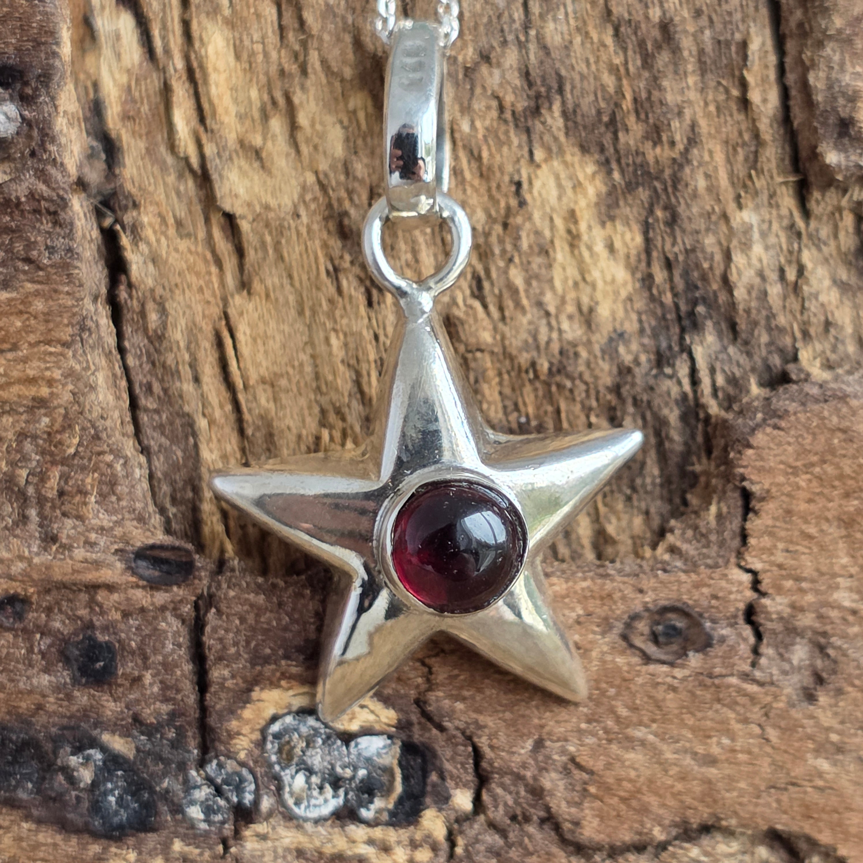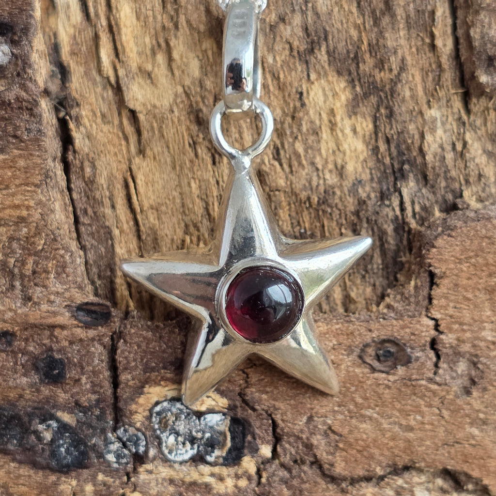 Un pandantiv delicat din argint 925, modelat sub forma unei stele lucioase, ce poartă în centrul său o piatră de granat natural – roșu intens și plin de viață.