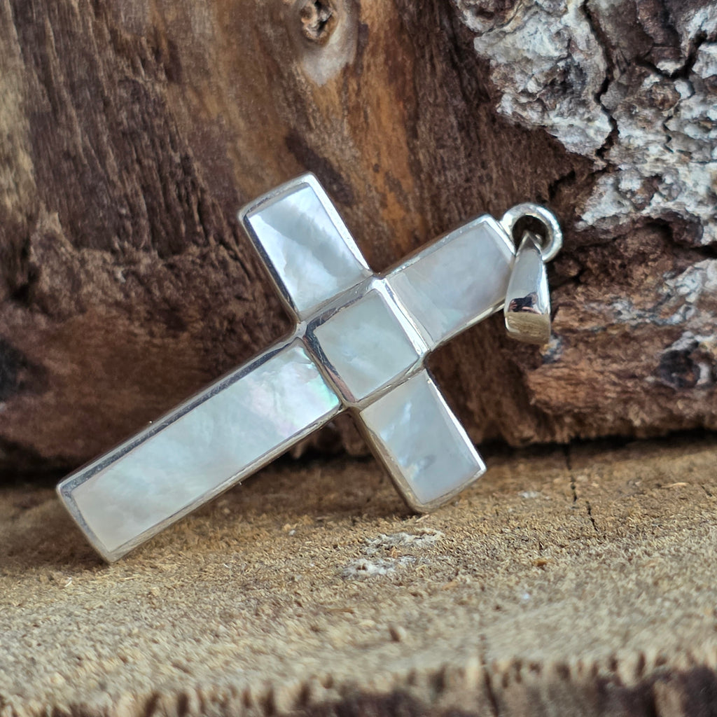 Forma clasică de cruce simbolizează protecția, credința și echilibrul interior, iar montura simplă, cu linii curate, pune în valoare luminozitatea organică a sidefului.