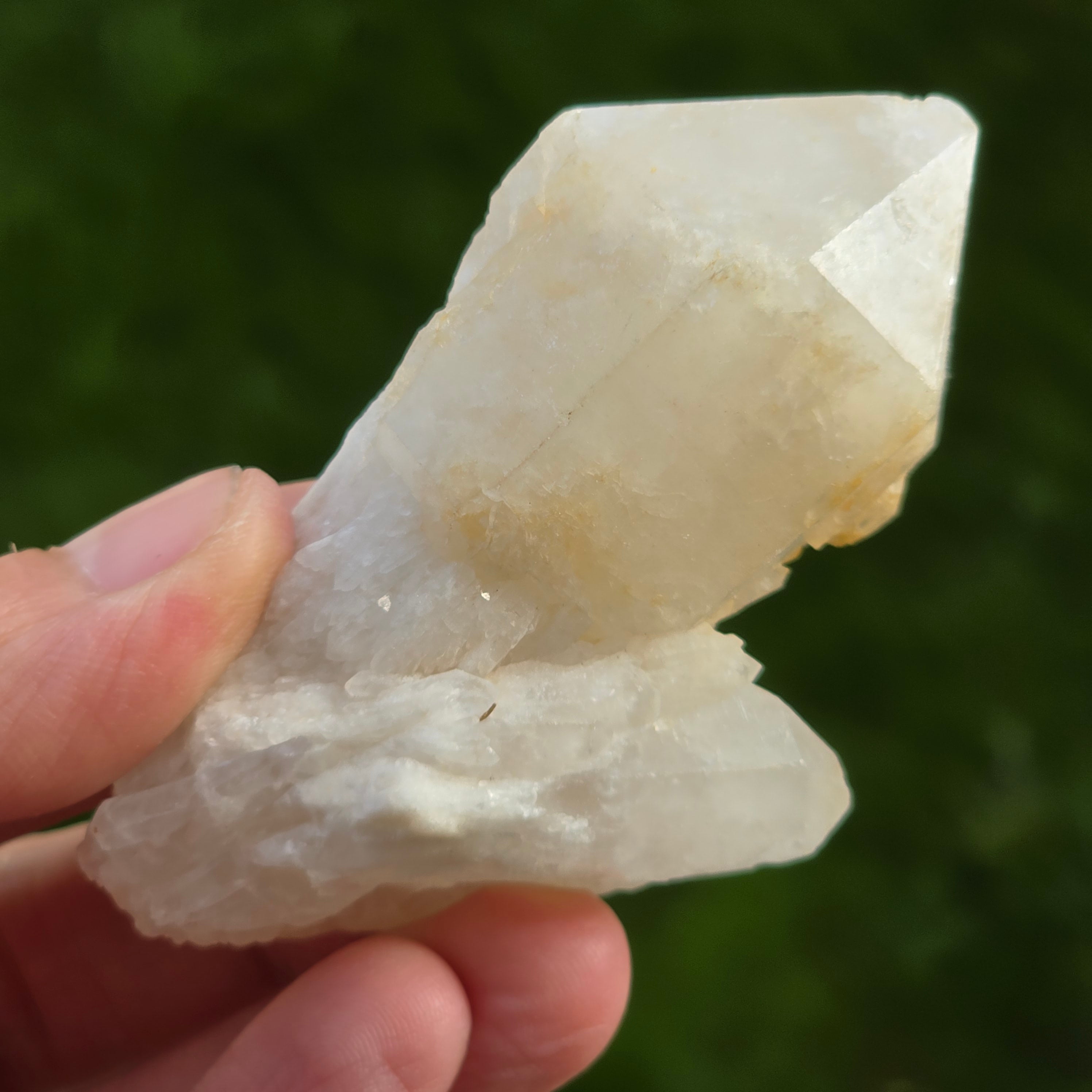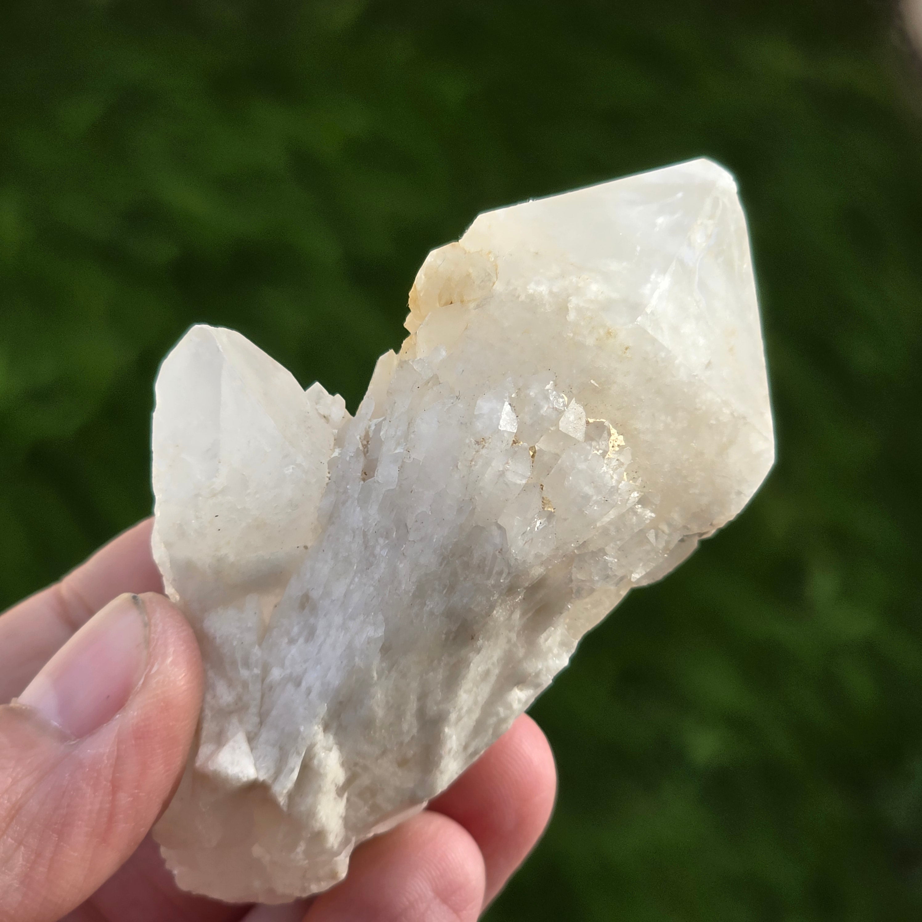 Kerzenquarz hat eine charakteristische Form, die an eine Kerze oder eine Ananas erinnert, mit spitzen Spitzen und glänzenden Kanten. Seine Farbe reicht von transluzent bis transparent, manchmal mit leicht opalisierenden Schattierungen.