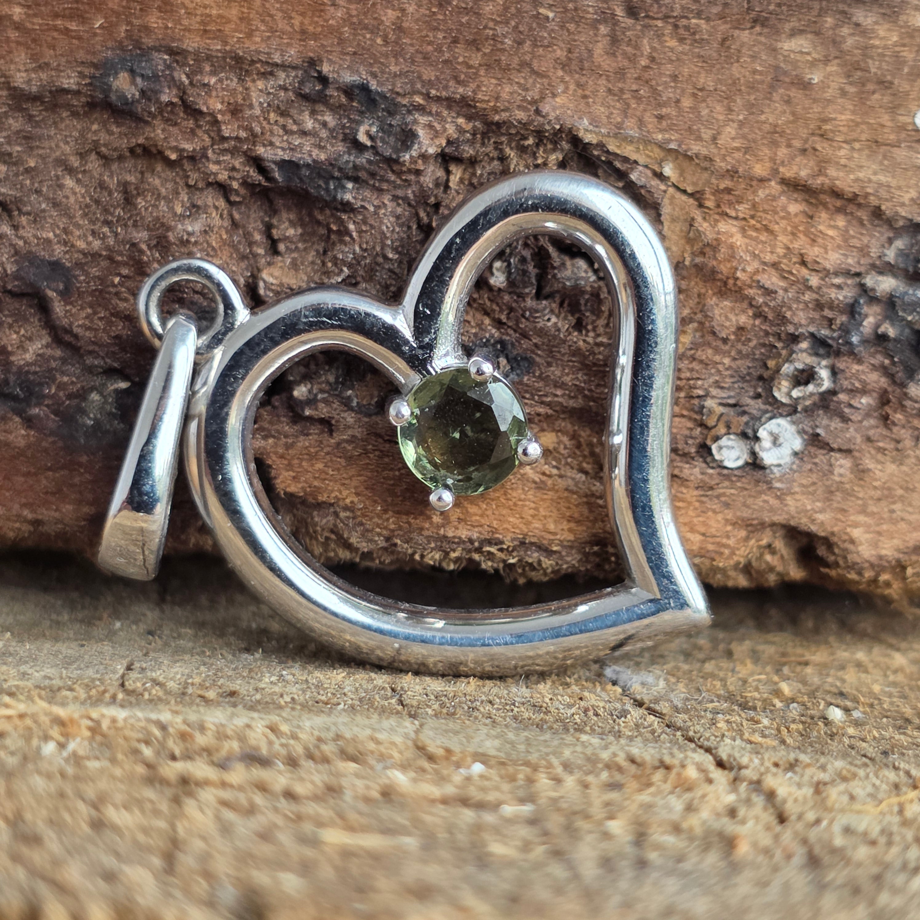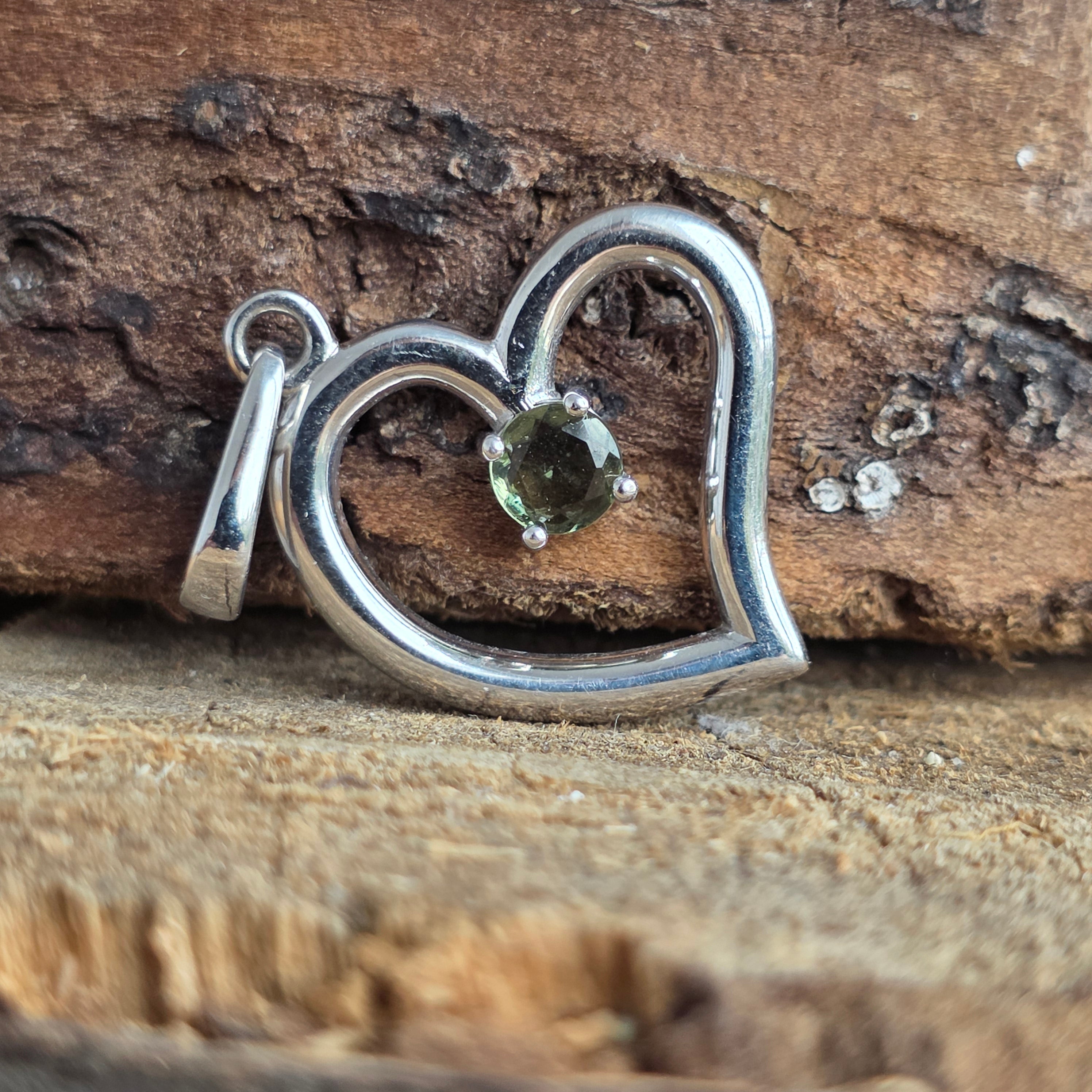 Dieser empfindliche Anhänger, der aus 925 Silber besteht, kombiniert das zeitlose Symbol des Herzens mit der mysteriösen Helligkeit des natürlichen Moldas. Das mittelgroße montierte facettierte Soldat zieht das Licht an und fügt eine subtile Note von Tiefgrün hinzu, das elegant mit glänzendem Silber kontrastiert.