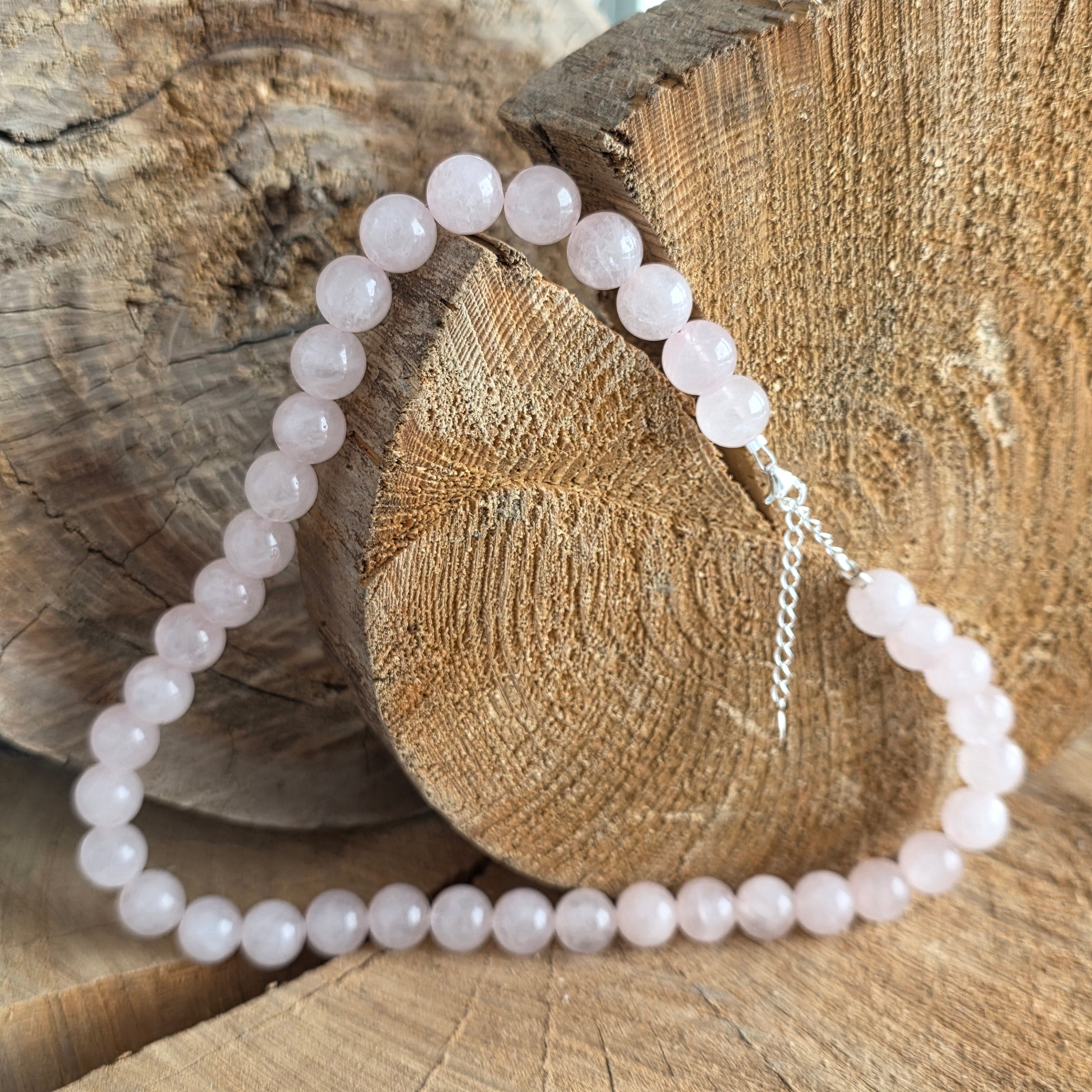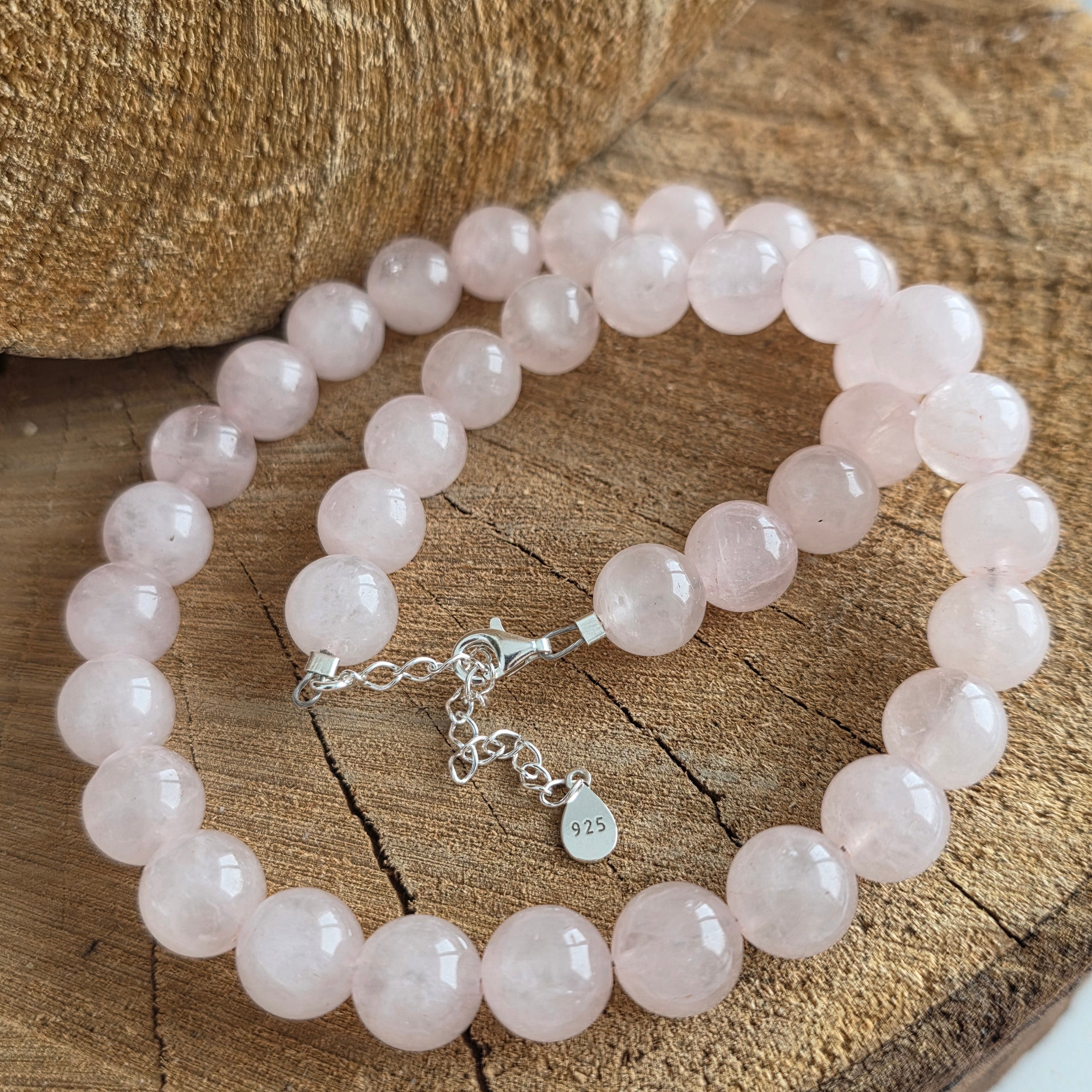 Materialien: Naturgeschliffener rosa Quarz (10 mm Kugeln), Verschluss aus Silber