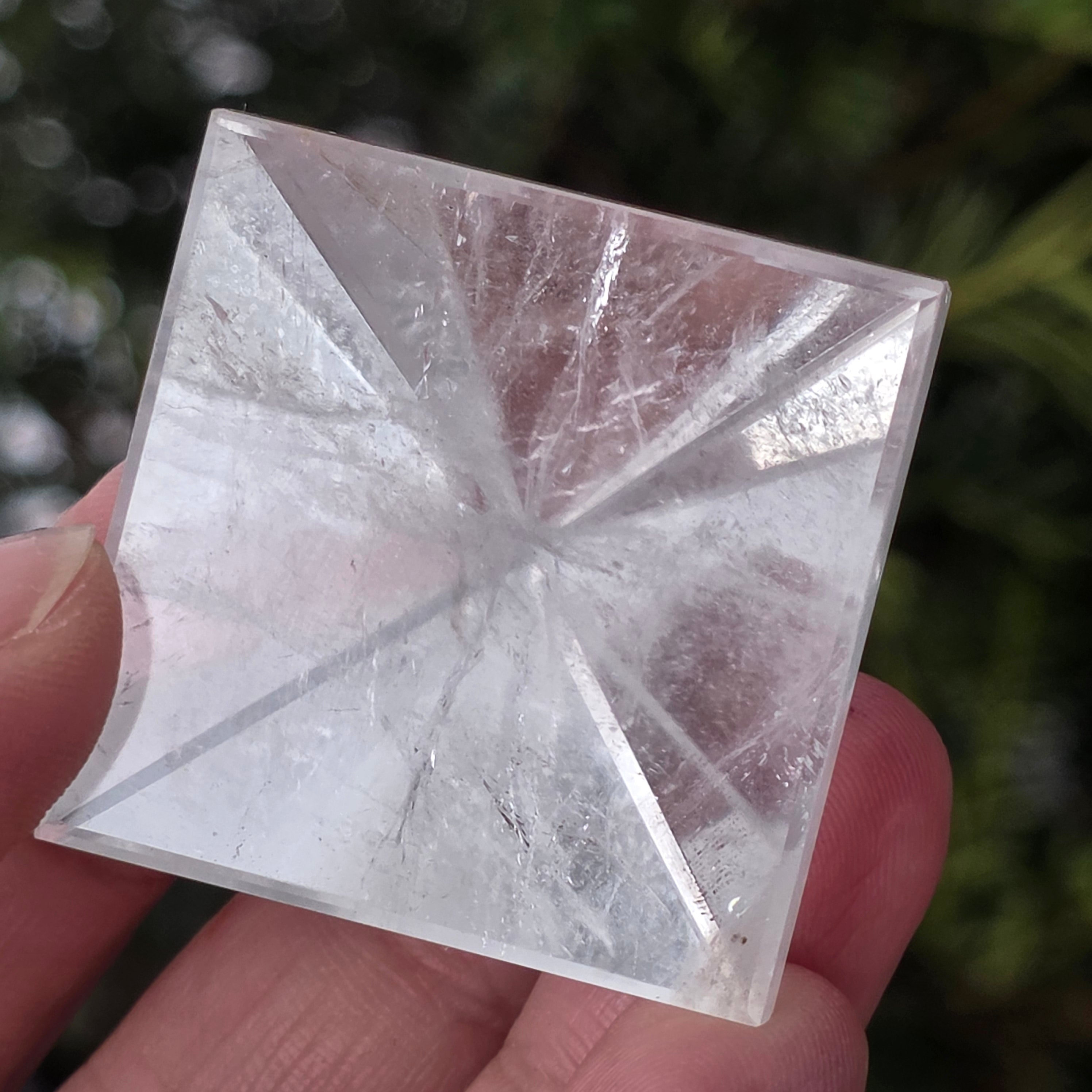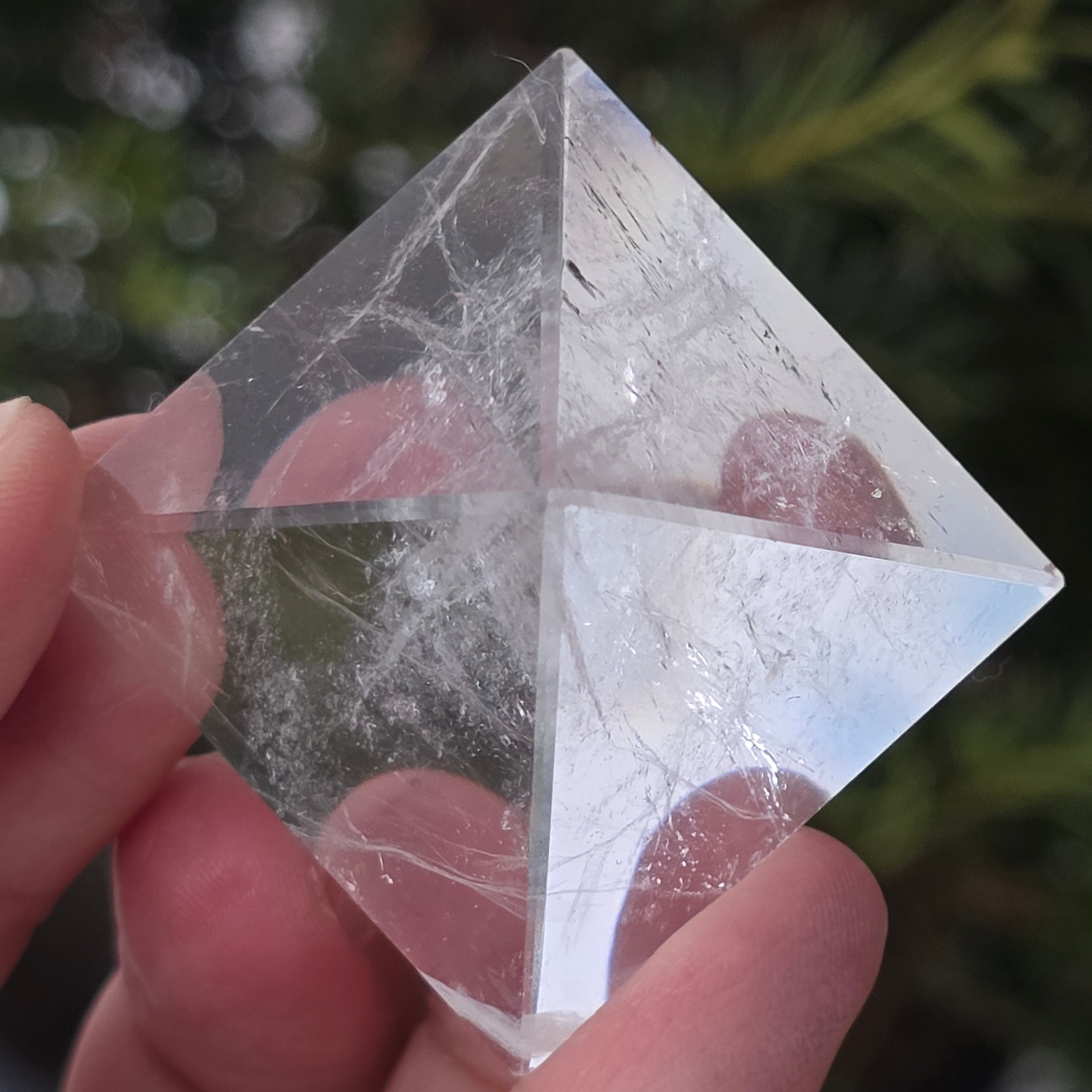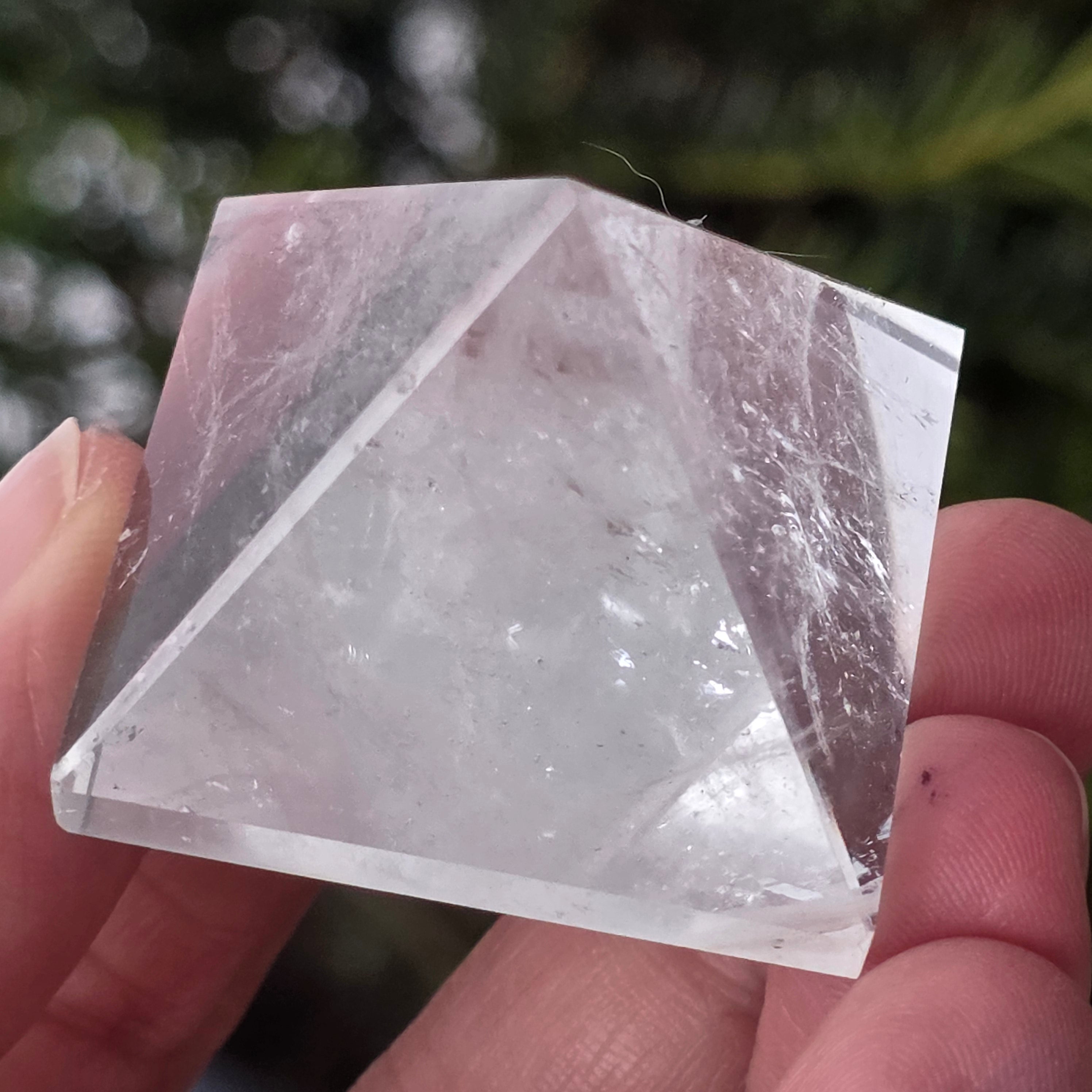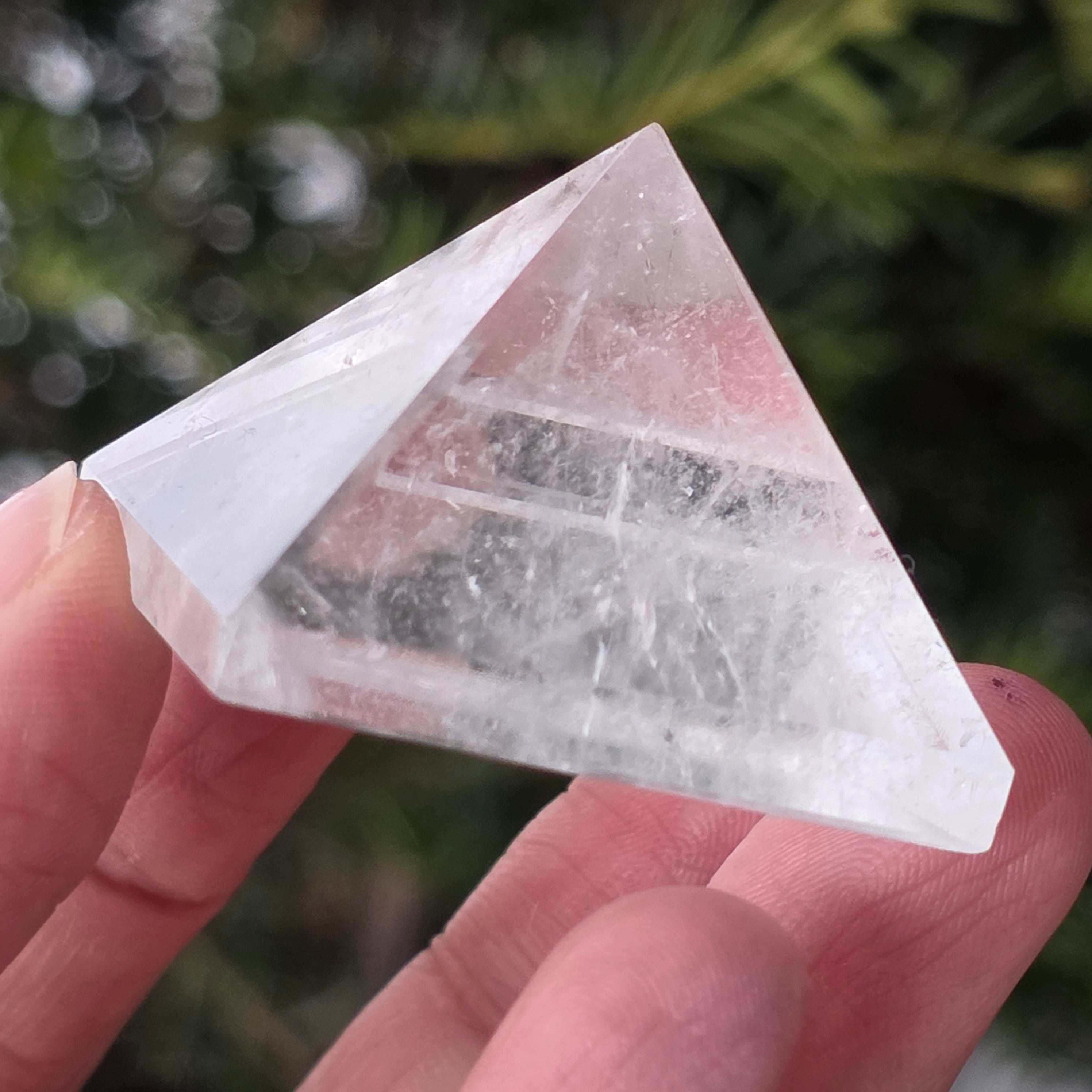 Die farblose Quarzpyramide wird mit Klarheit, Verstärkung der Absicht und energetischem Gleichgewicht in Verbindung gebracht. Ihre Form konzentriert und lenkt die Energie auf eine geordnete Weise. Sie wird oft als Symbol für einen klaren Geist und die Harmonie zwischen Gedanken, Gefühlen und Handlungen verwendet.